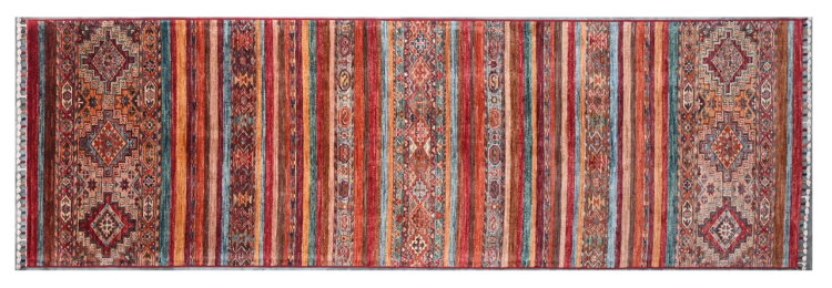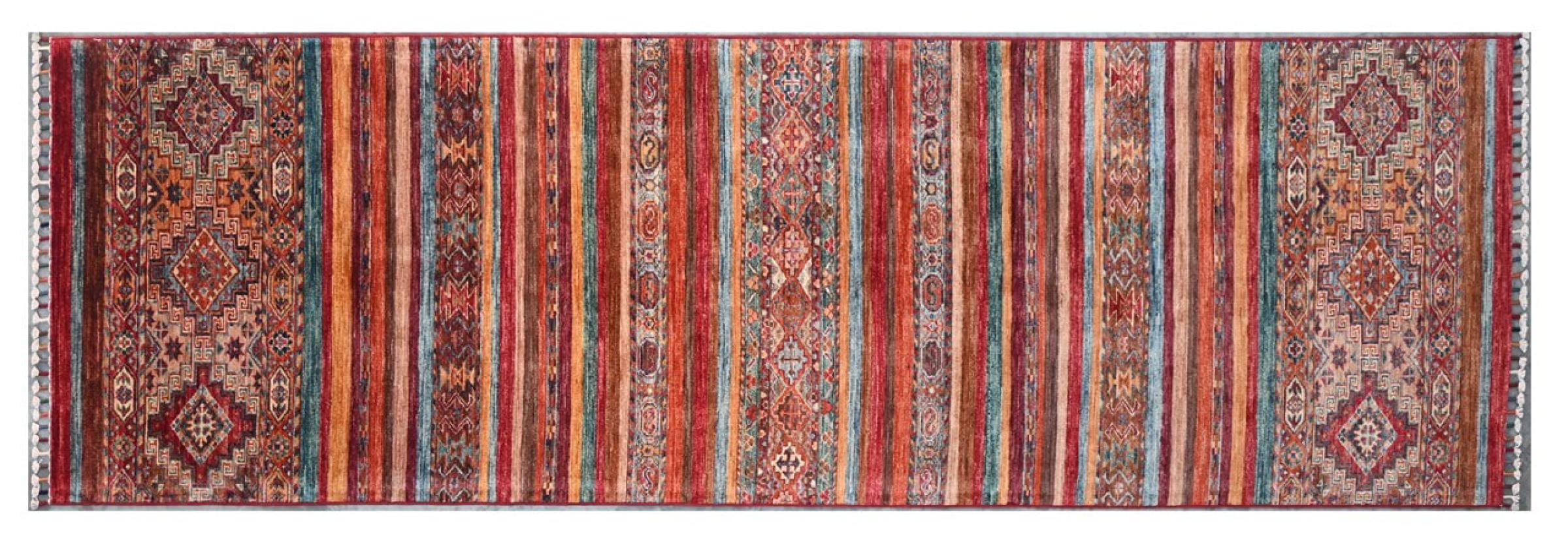 Carpet ID: 299371003483502 Size: 295x82 cm Thickness: ap. 5 mm Knot density: 144 000 - 180 000 / m² Manufacturing: Knotted by hand Pile: Handspun wool Warp: Cotton Origin: Afghanistan Age: New Weight: ap. 8 kg In stock: Unique - Only 1 in stock