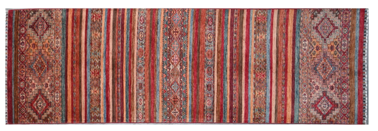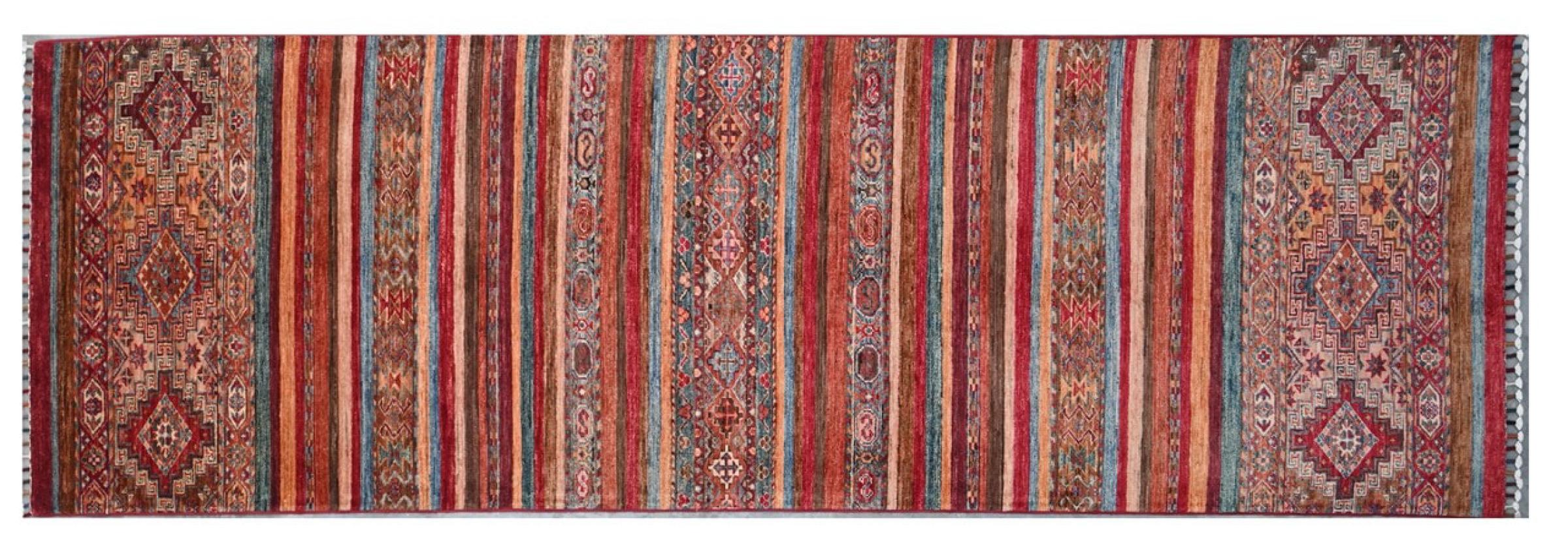Carpet ID: 299390007112974 Size: 300x81 cm Thickness: ap. 5 mm Knot density: 144 000 - 180 000 / m² Manufacturing: Knotted by hand Pile: Handspun wool Warp: Cotton Origin: Afghanistan Age: New Weight: ap. 9 kg In stock: Unique - Only 1 in stock