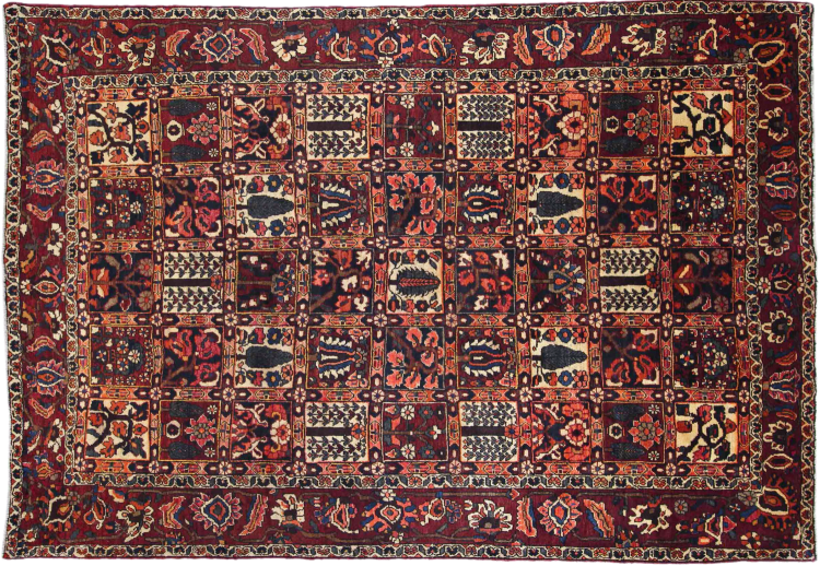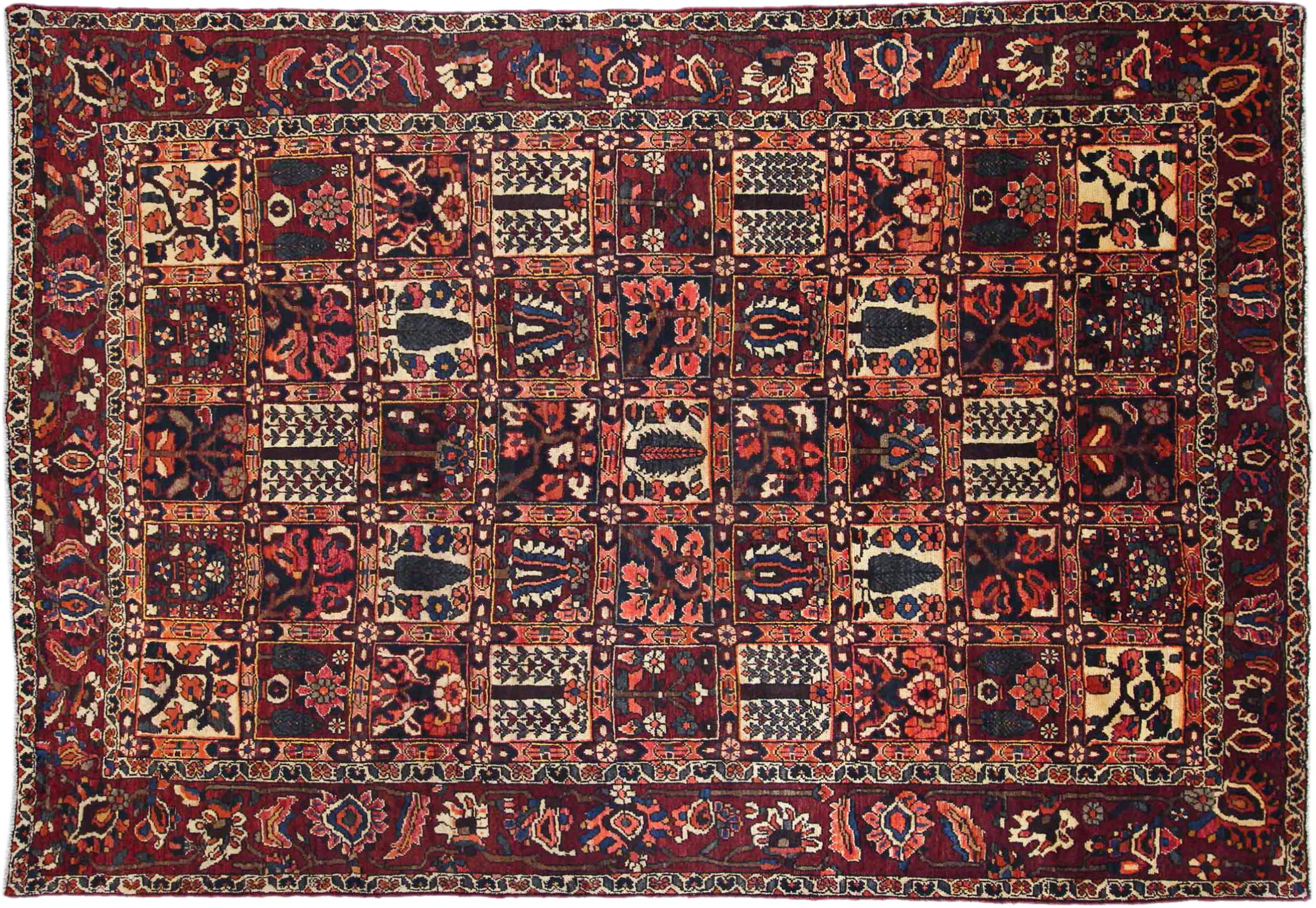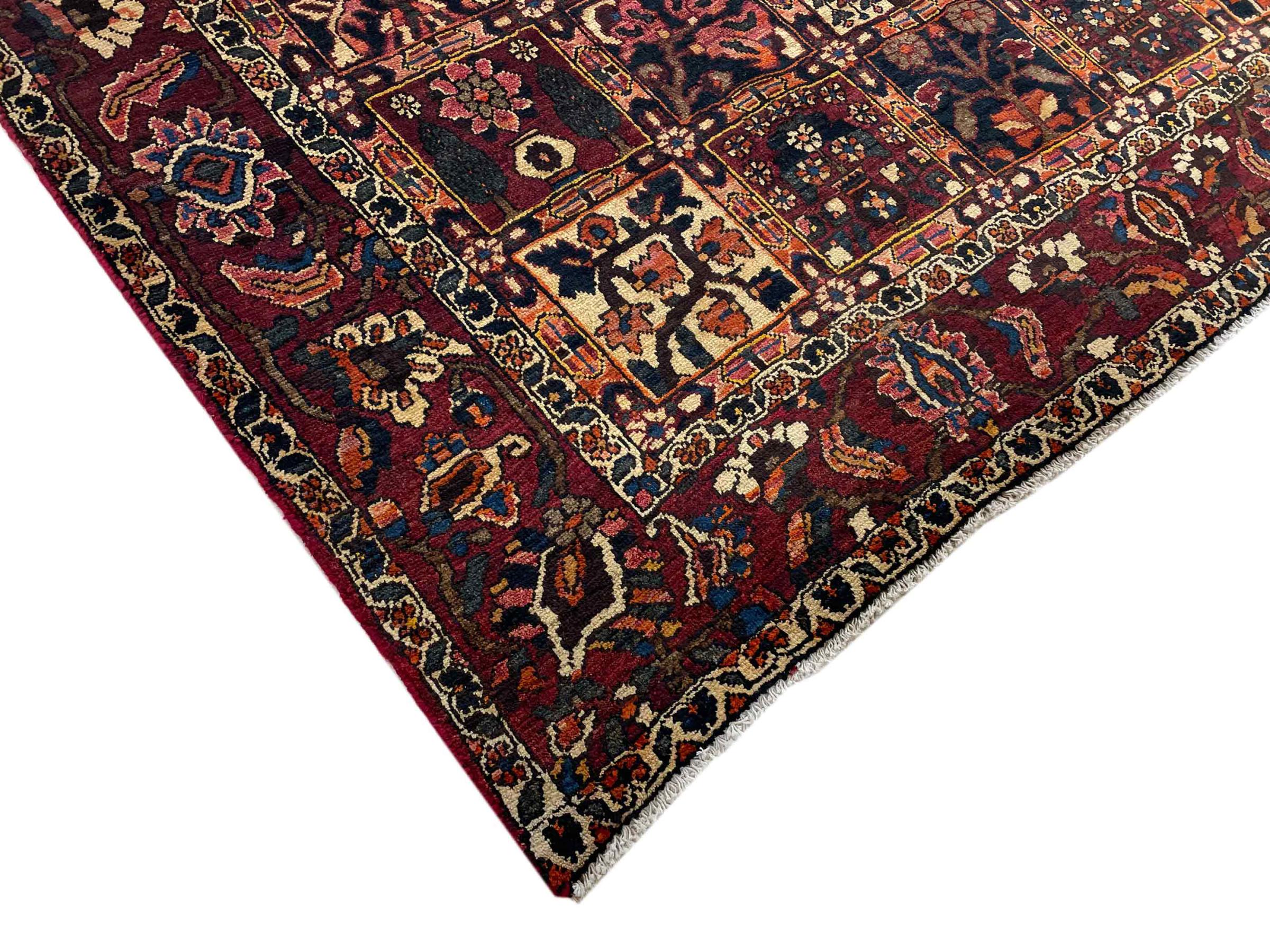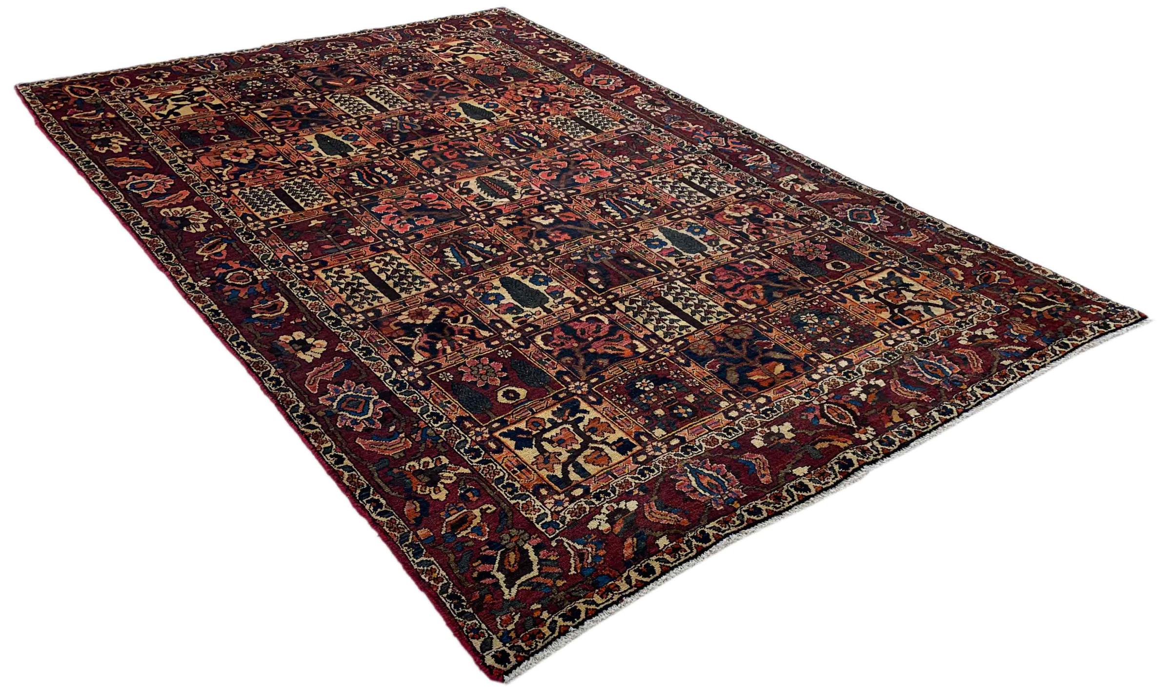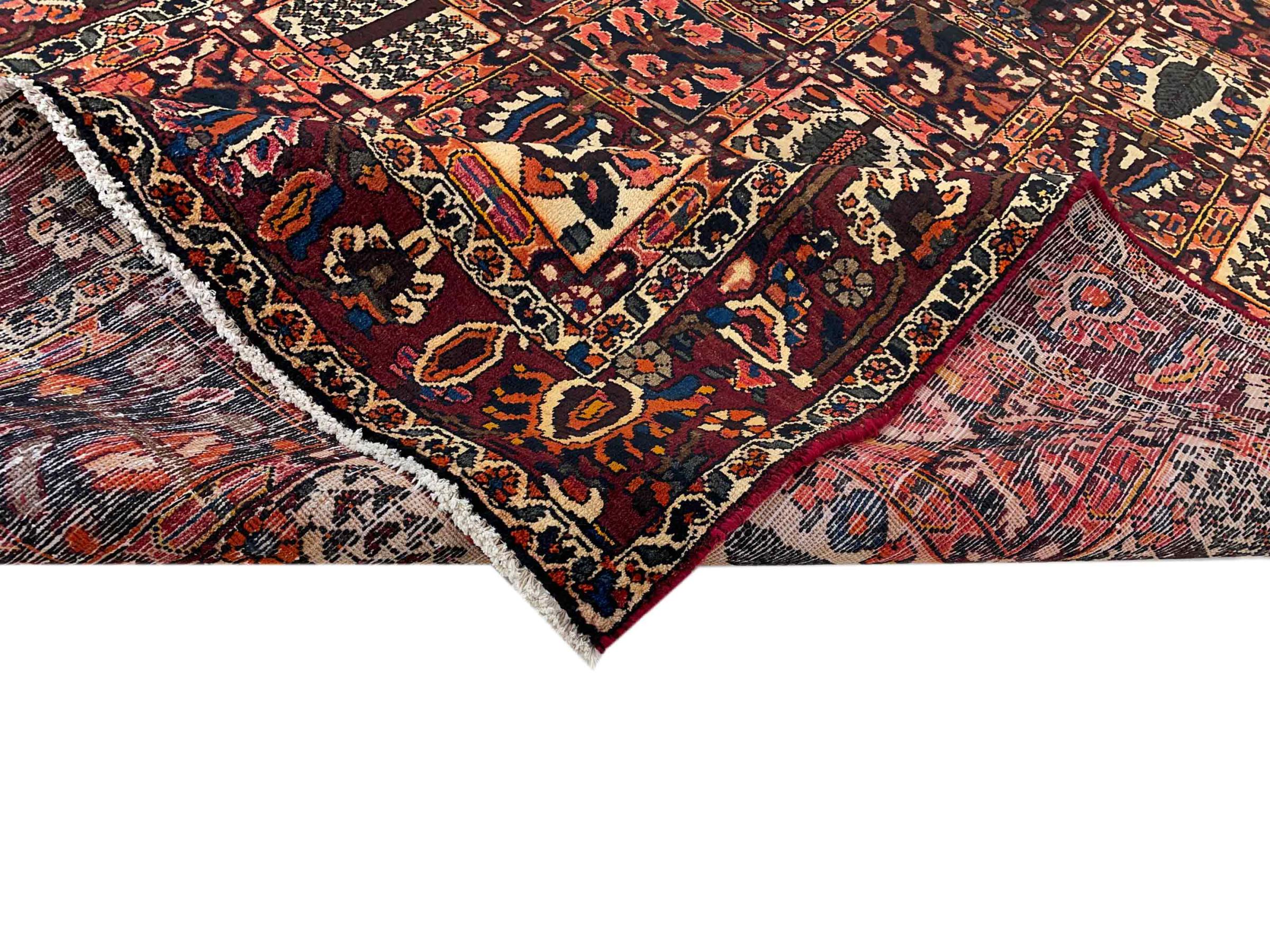 This Persian Bakhtiari was hand-knotted by nomads of the Bakhtiari tribe. This Persian carpet plays with the colours of the Orient in the most beautiful patterns. The design of its ornaments is inspired by Persian gardens. Over the years, the so-called traditional garden design has gained great popularity in the western world. Its high knotting density in combination with the strong yarn promises a long-lasting pleasure of Persian carpet art.
