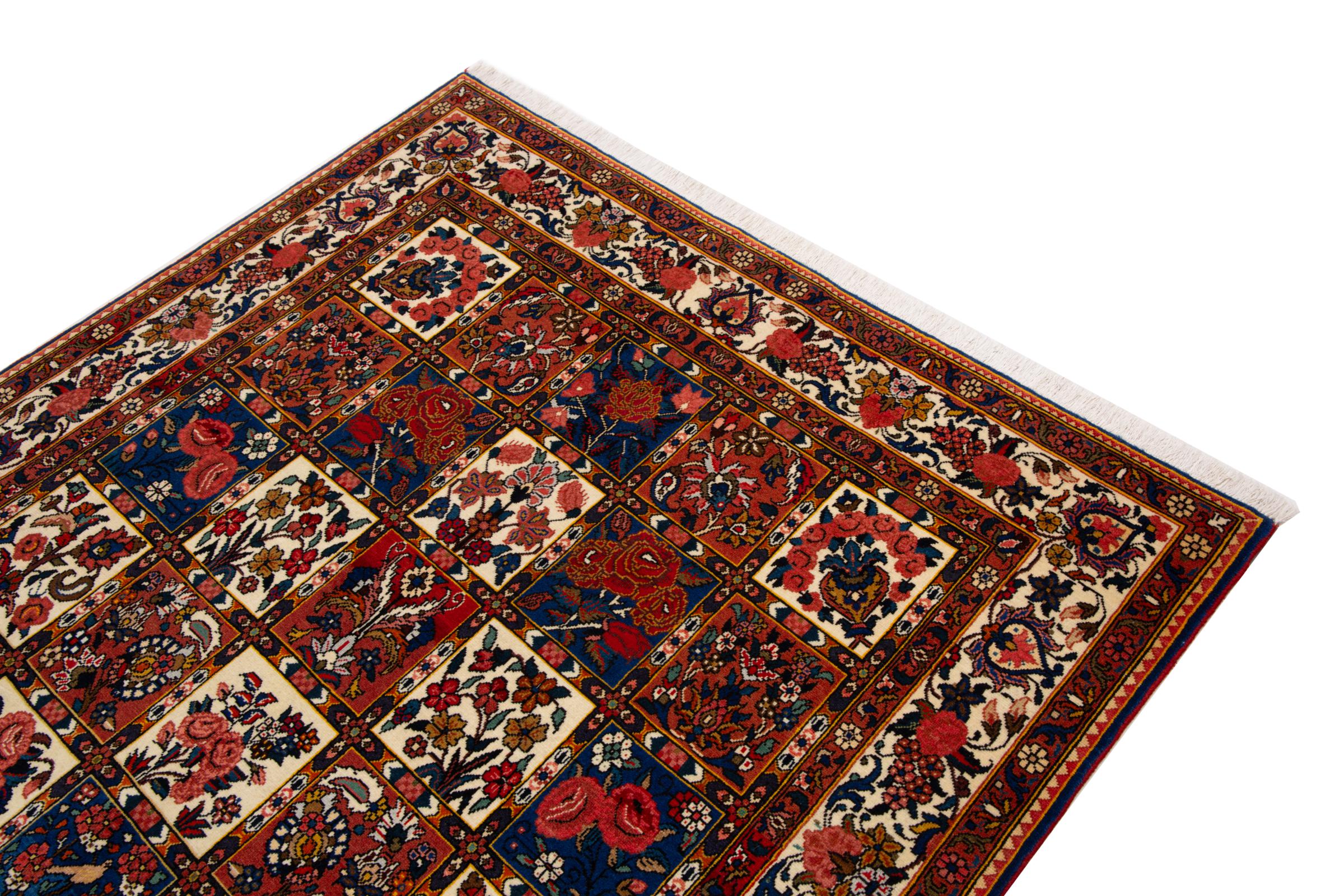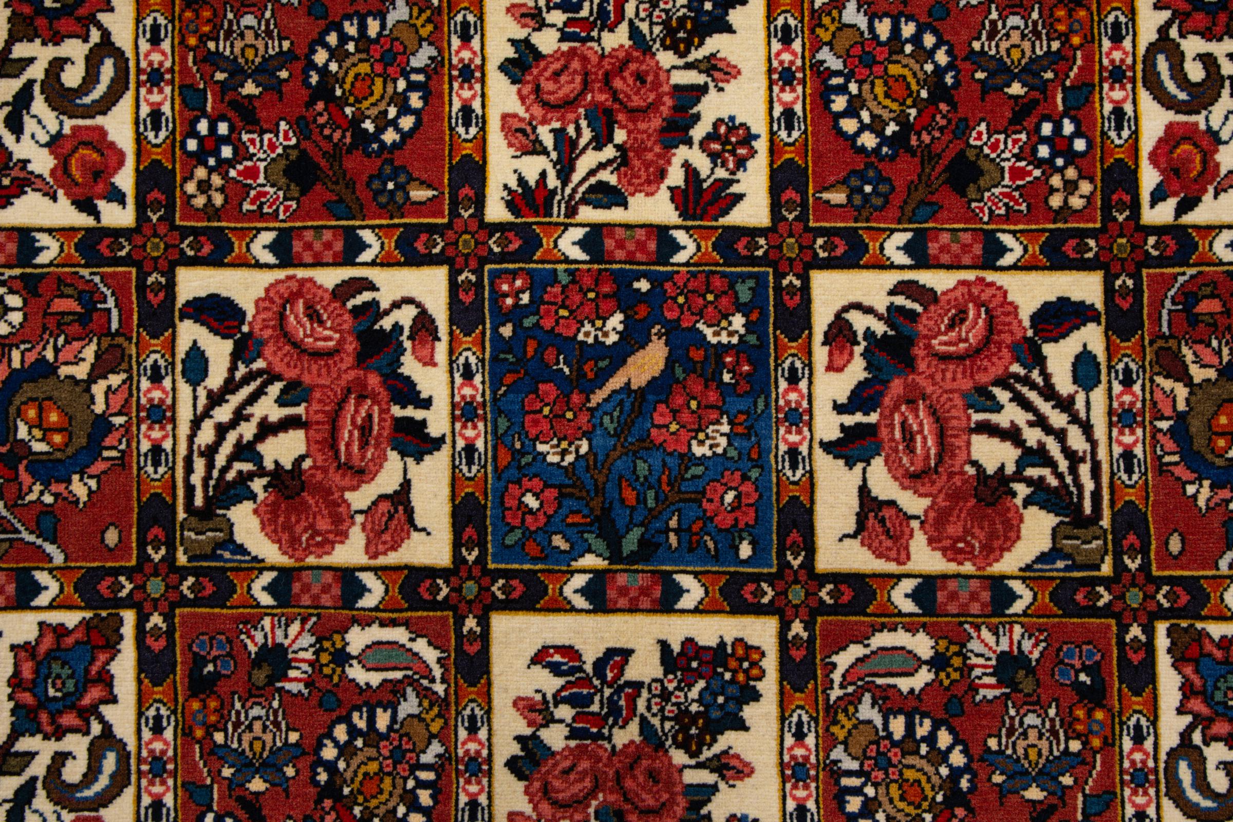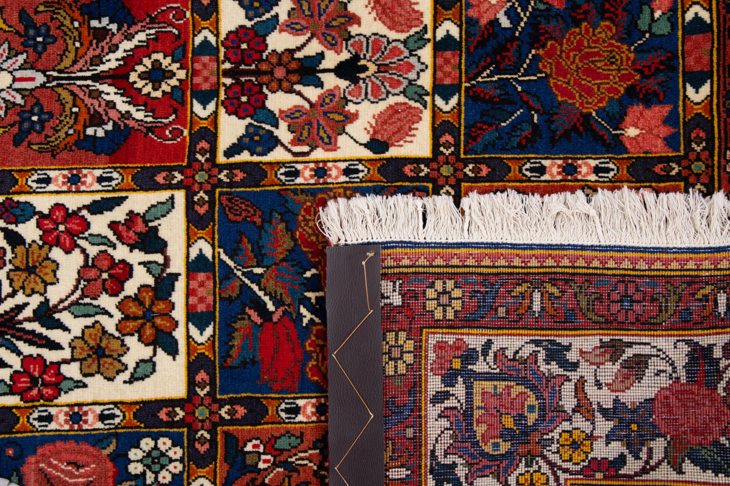 This Persian Bakhtiari was hand-knotted by nomads of the Bakhtiari tribe. This Persian carpet plays with the colours of the Orient in the most beautiful patterns. The design of its ornaments is inspired by Persian gardens. Over the years, the so-called traditional garden design has gained great popularity in the western world. Its high knotting density in combination with the strong yarn promises a long-lasting pleasure of Persian carpet art.