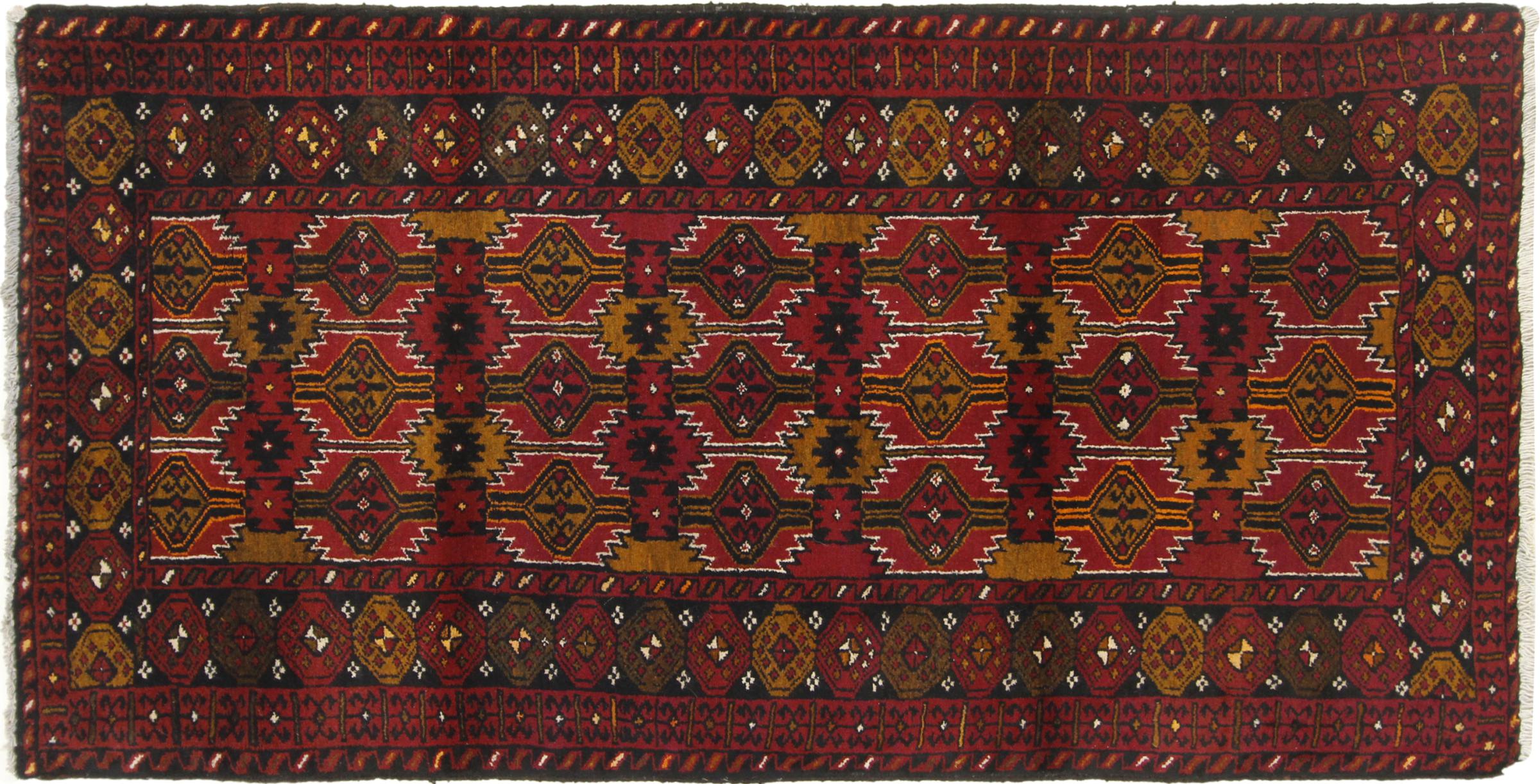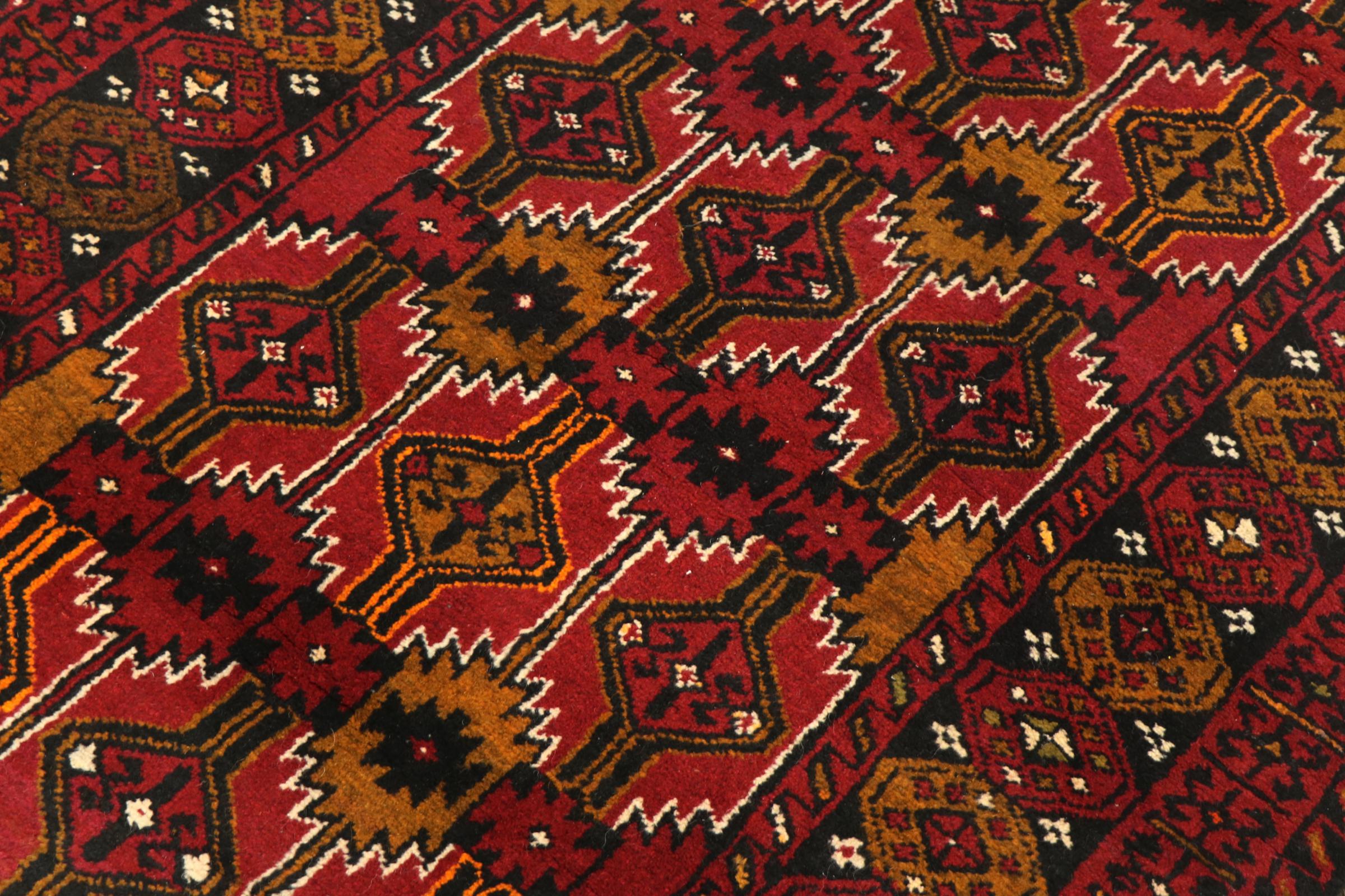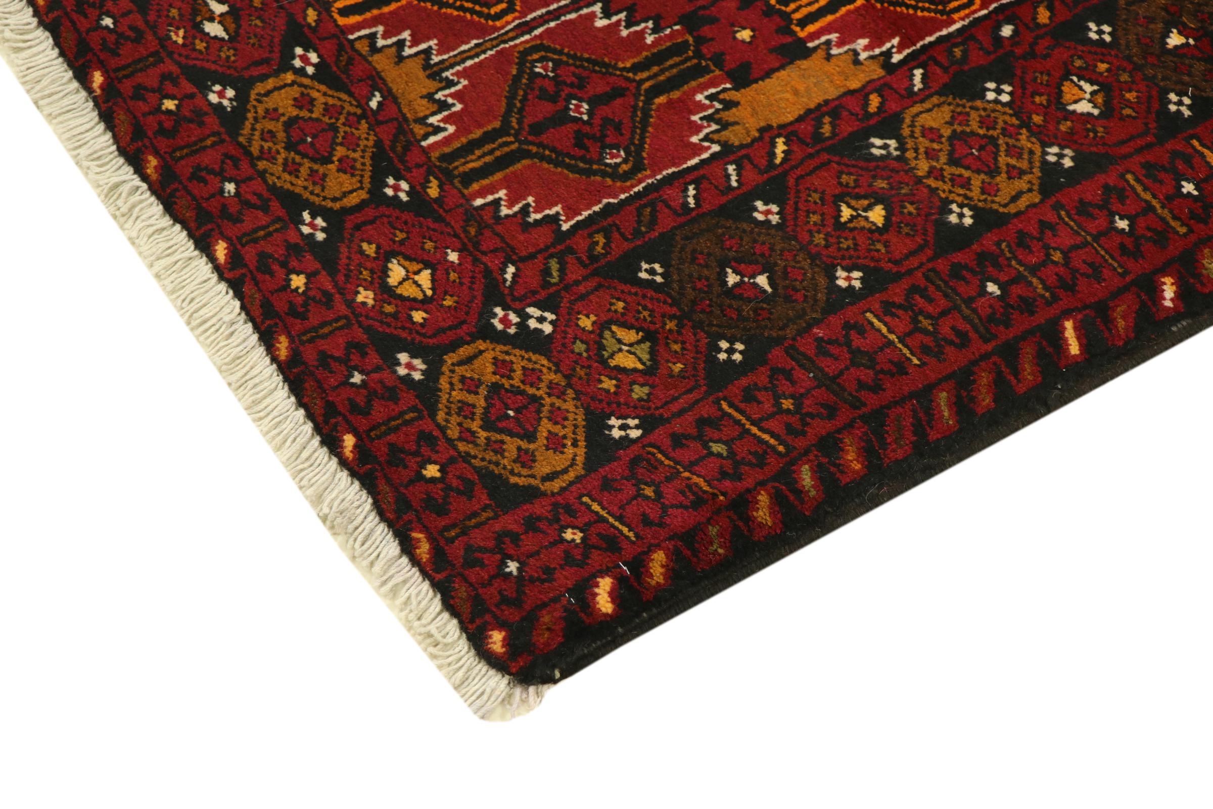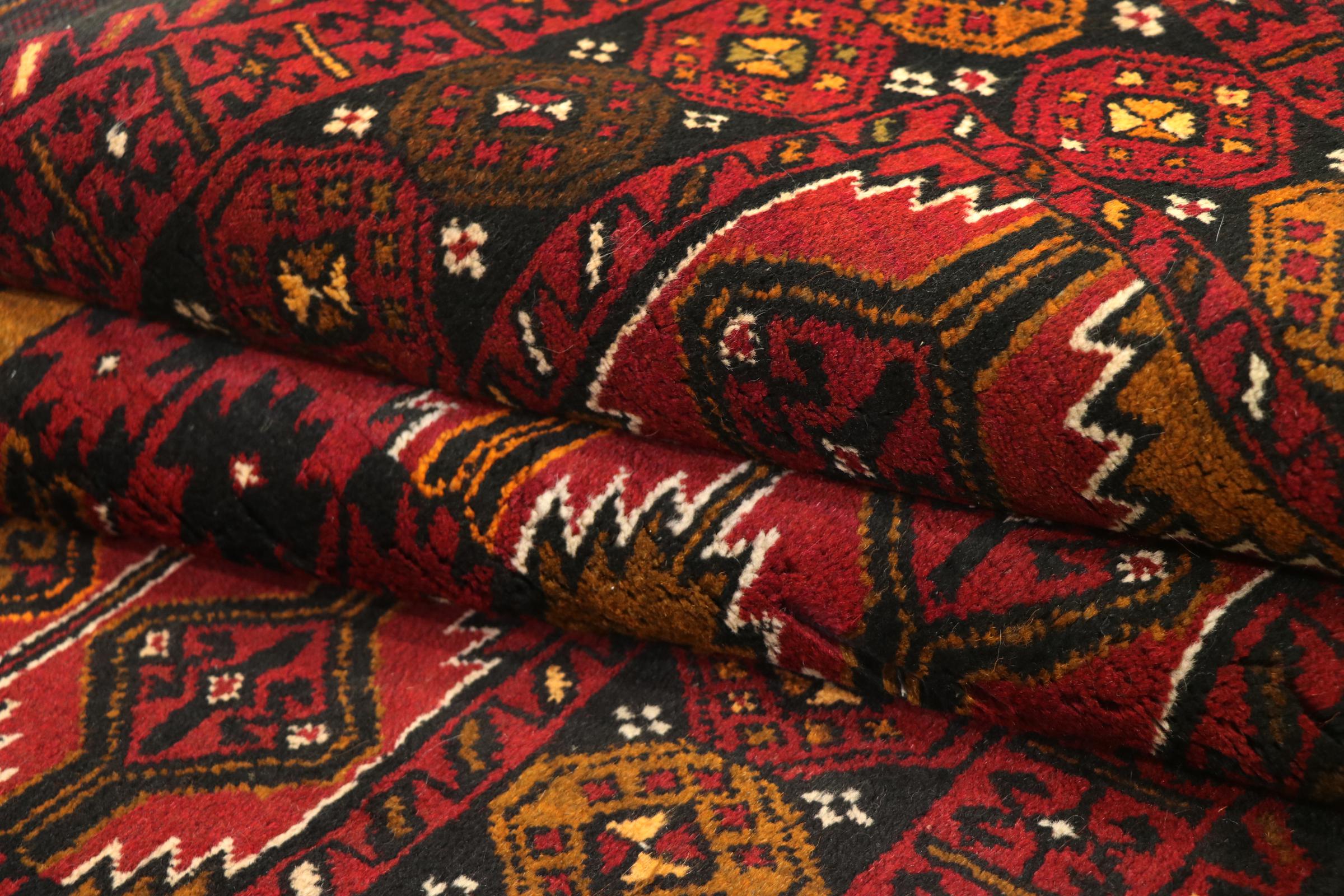 This Baluch carpet is a wonderful example of true nomadic art. The Persian carpet, made in the Iranian-Afghan border region, is convincing thanks to its dense, asymmetrical knotting. Lively patterns make it a real feast for the eyes. Typical are rather dark shades that spread a pleasant warmth. Its beautiful natural yarn conveys quality and makes it extremely durable. Typical for this carpet are the straight-lined patterns that make it an unmistakable nomadic carpet.