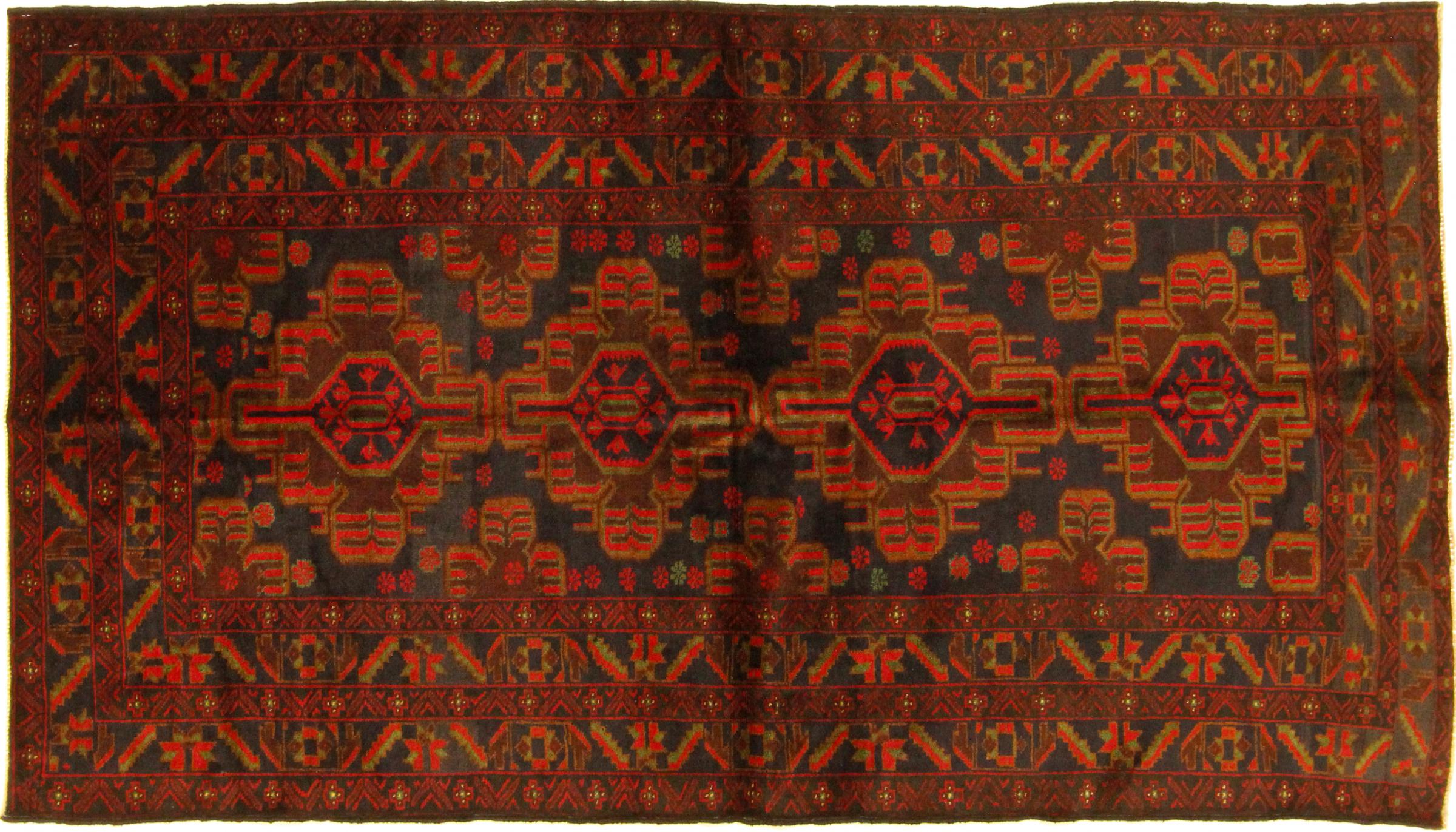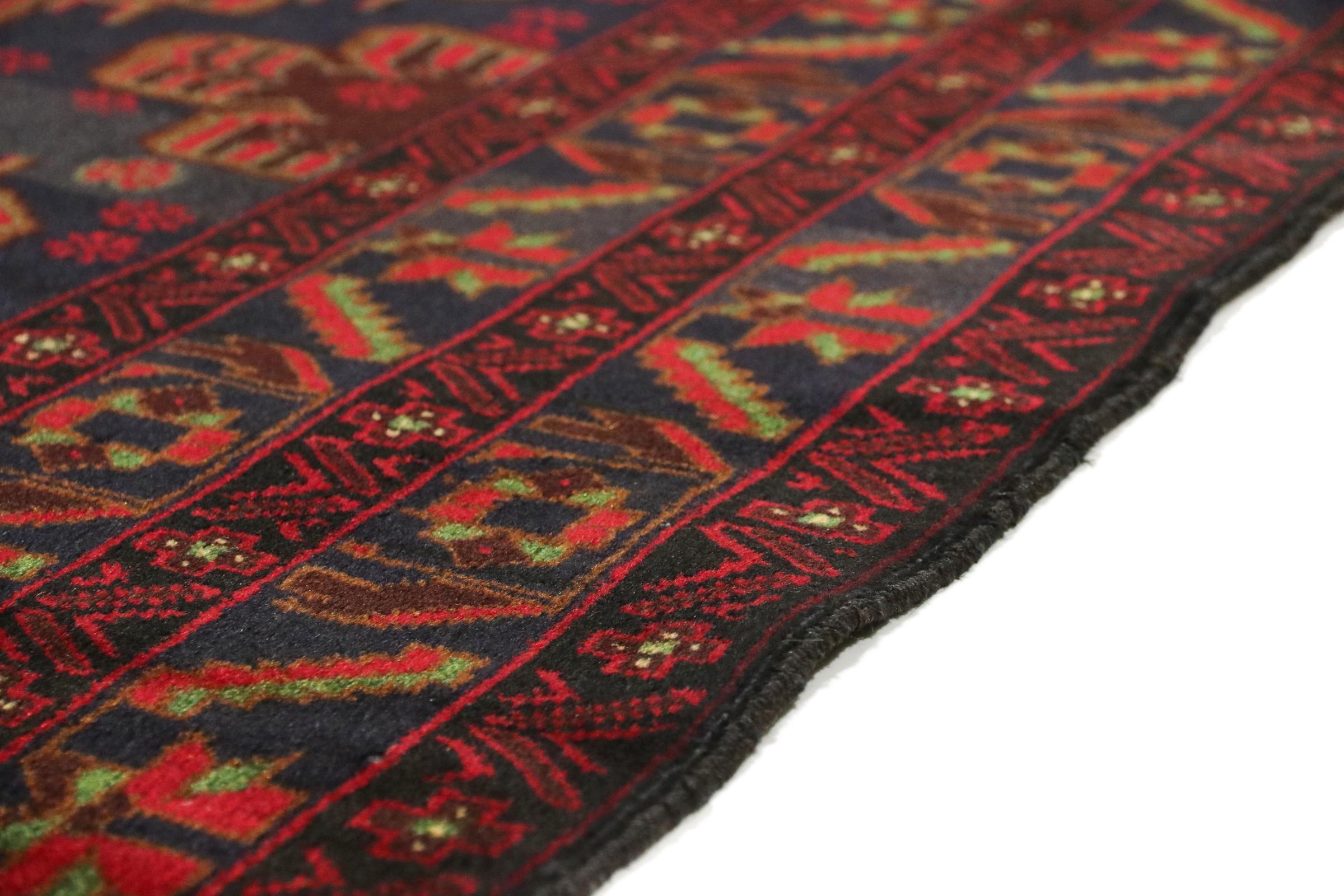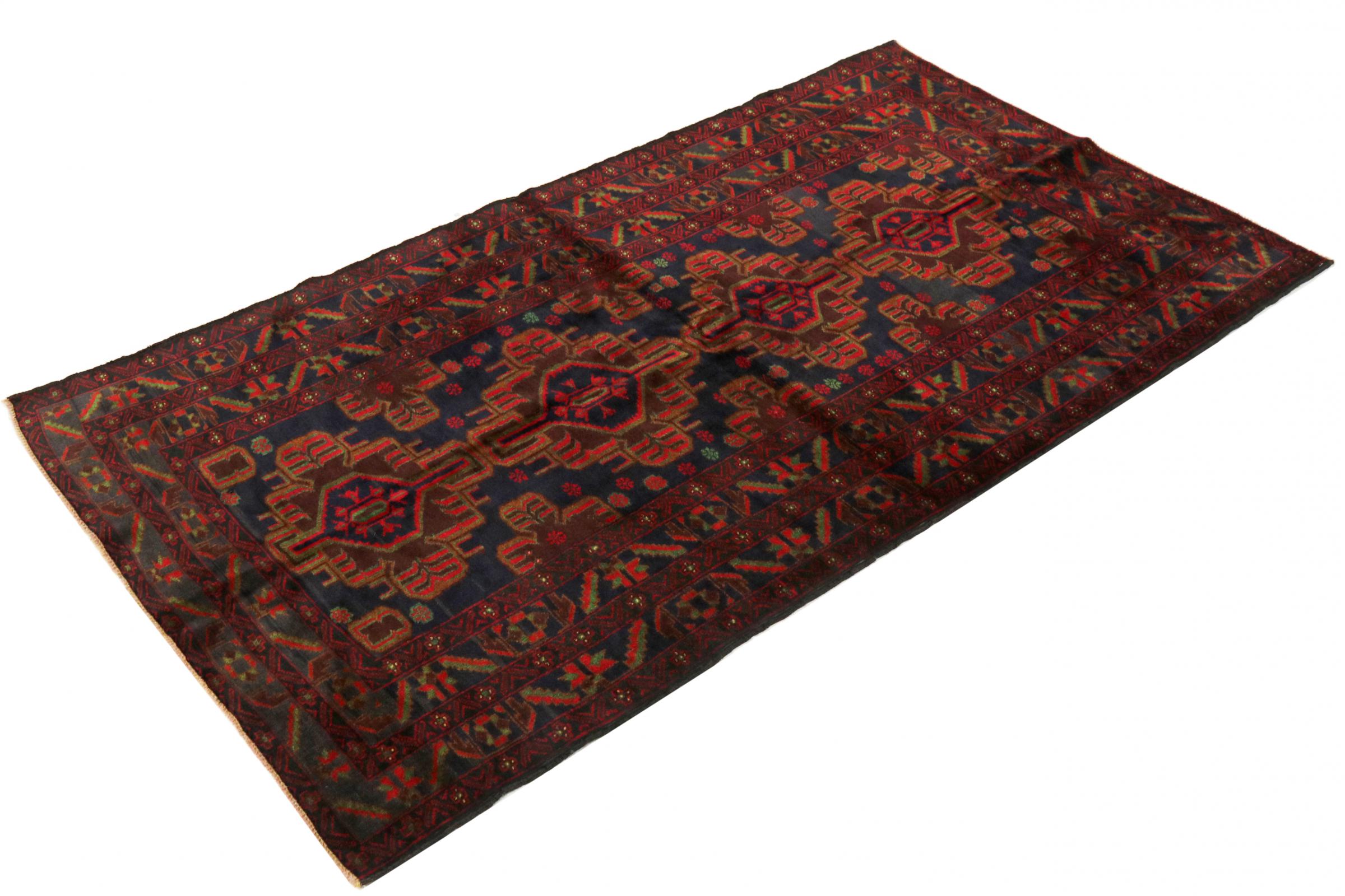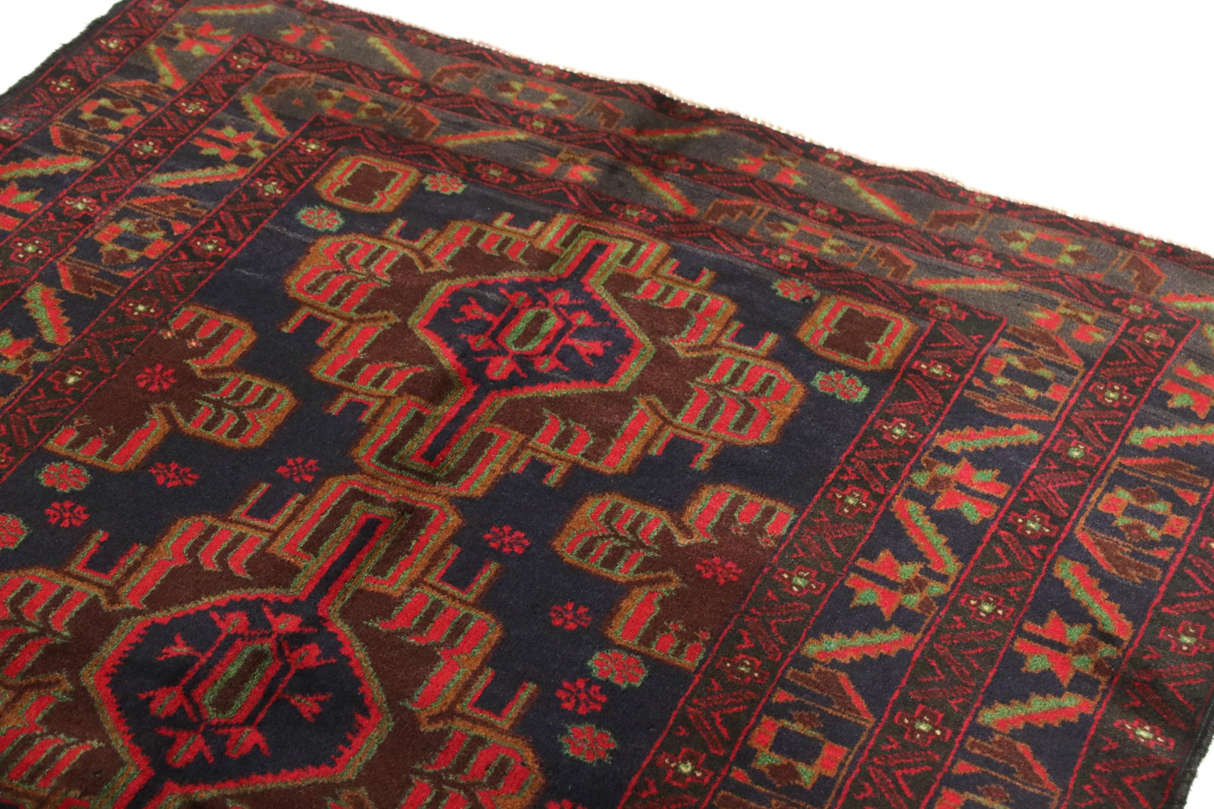 This Baluch carpet is a wonderful example of true nomadic art. The Persian carpet, made in the Iranian-Afghan border region, is convincing thanks to its dense, asymmetrical knotting. Lively patterns make it a real feast for the eyes. Typical are rather dark shades that spread a pleasant warmth. Its beautiful natural yarn conveys quality and makes it extremely durable. Typical for this carpet are the straight-lined patterns that make it an unmistakable nomadic carpet.
