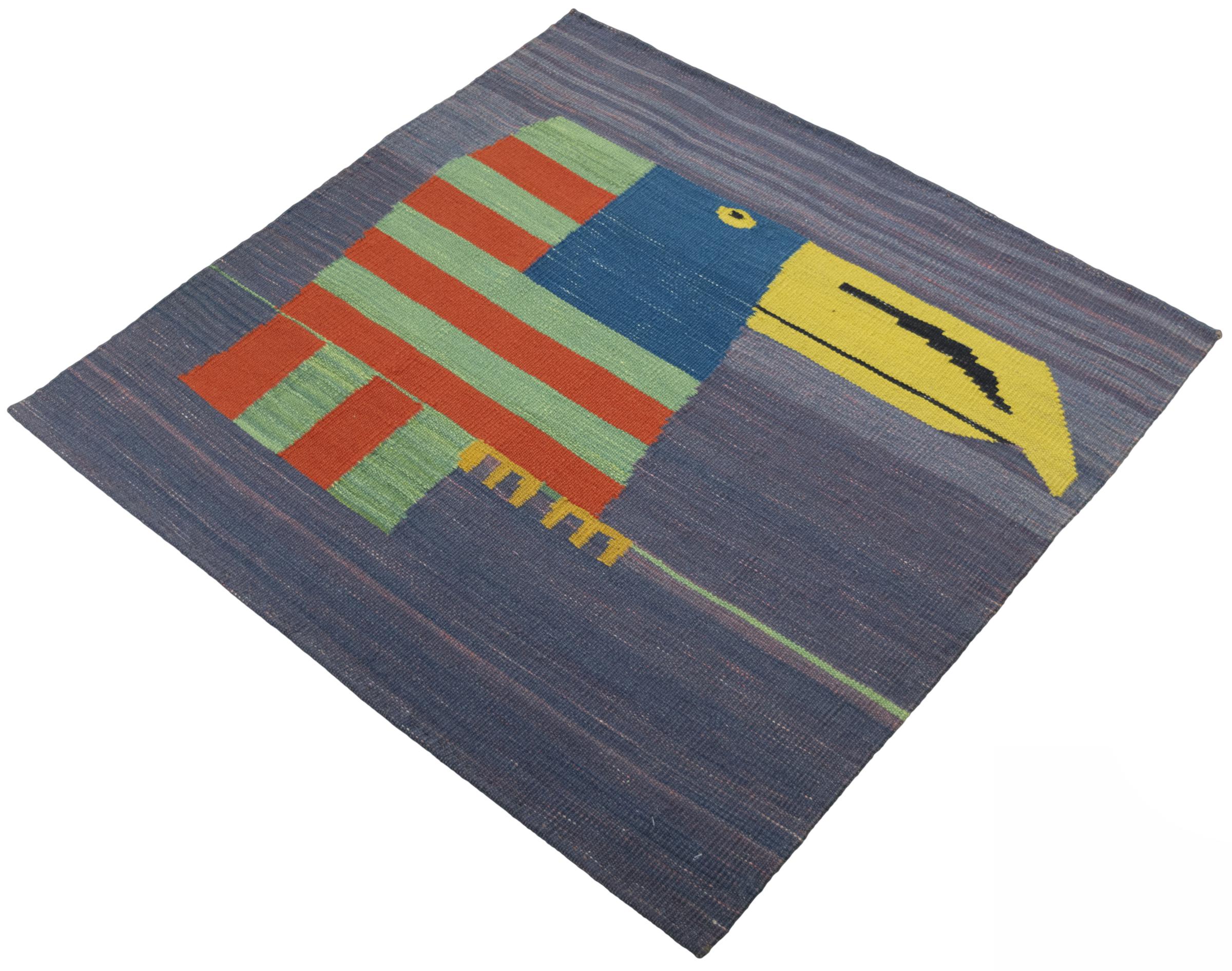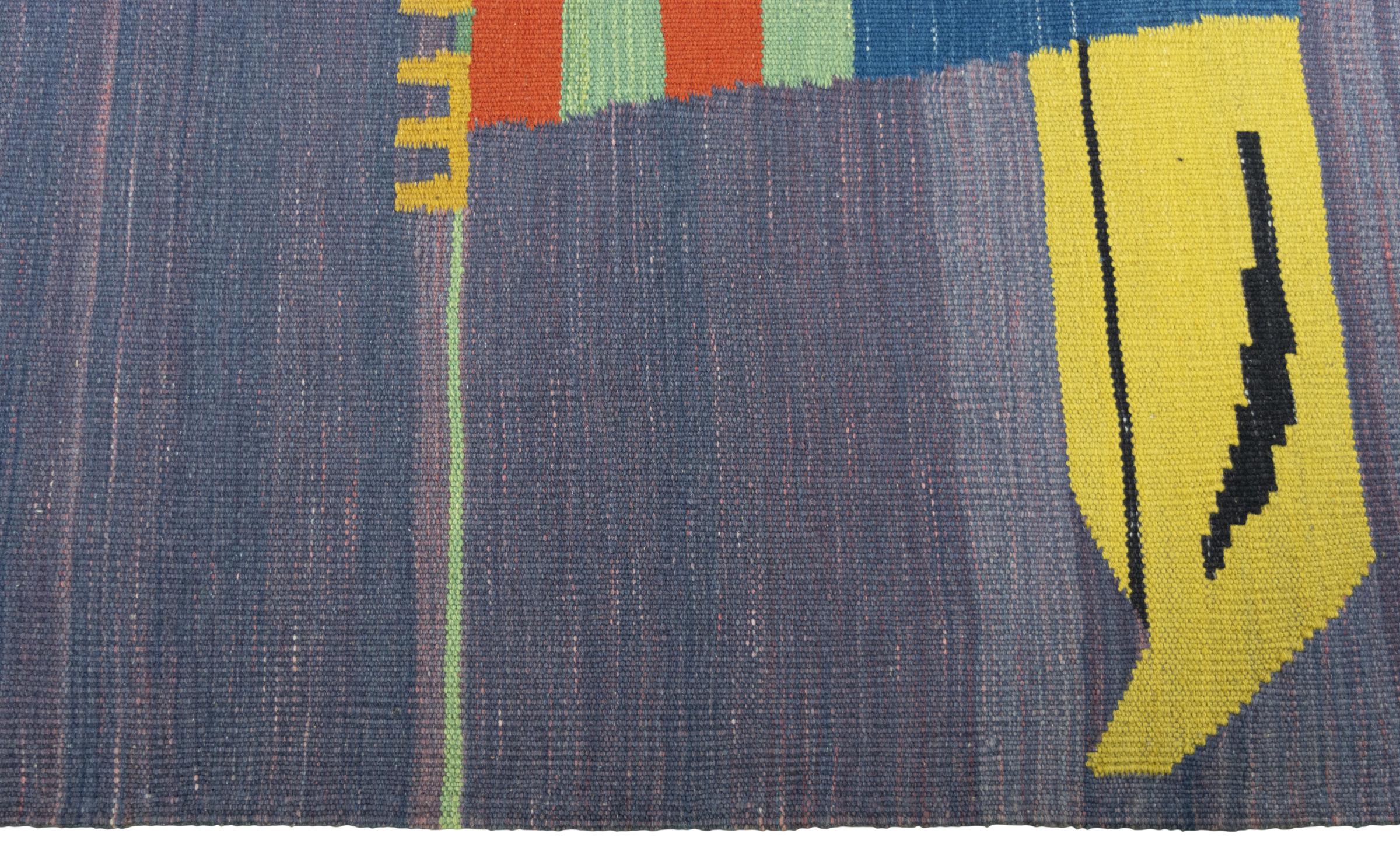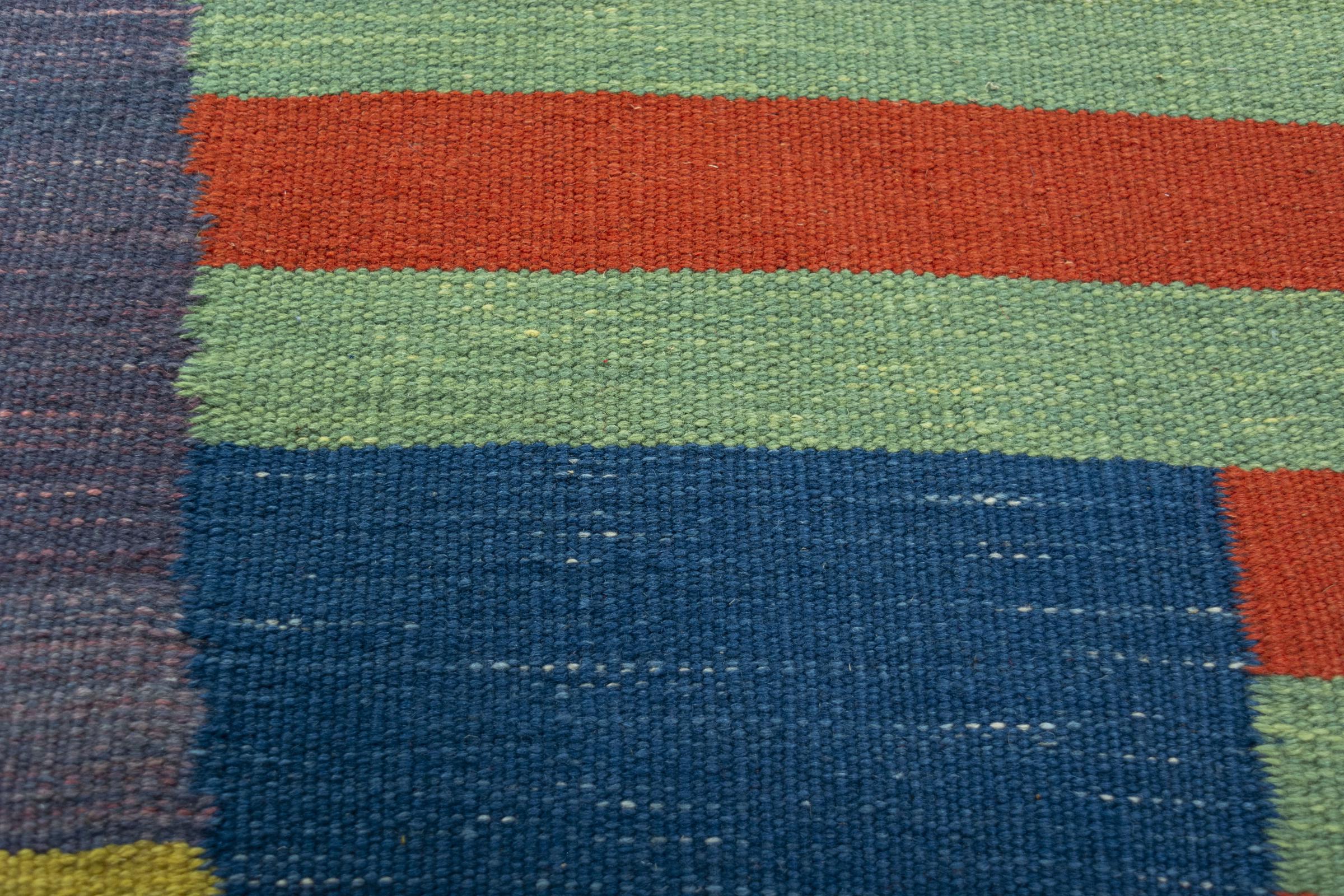 This rug was made as a flat weave by hand on a loom. Flatweave is the term used to describe rugs that have no pile. As the name promises, these rugs are woven and not knotted. This results in a flat rug with a structured surface. Flatweaves are not as soft and usually thinner than knotted rugs. At the same time they are much less complex to manufacture and can usually be laid out from both sides (front and back). Their patterns are usually geometric, which is determined by the fabric.