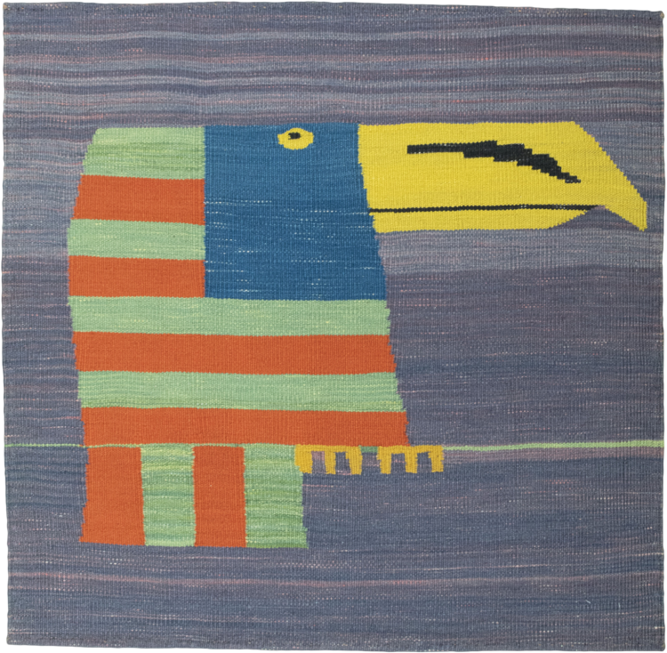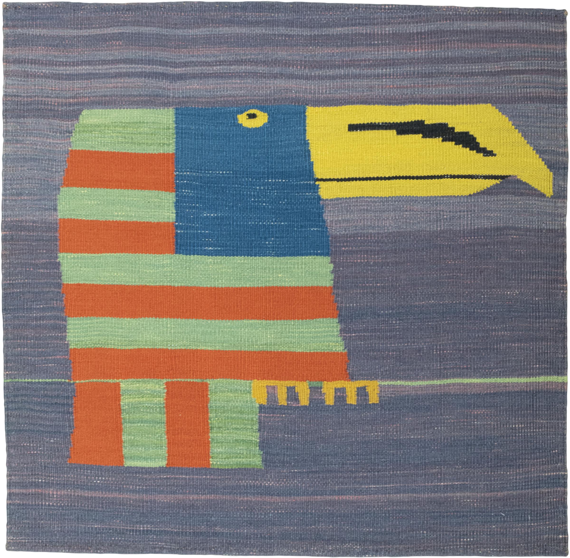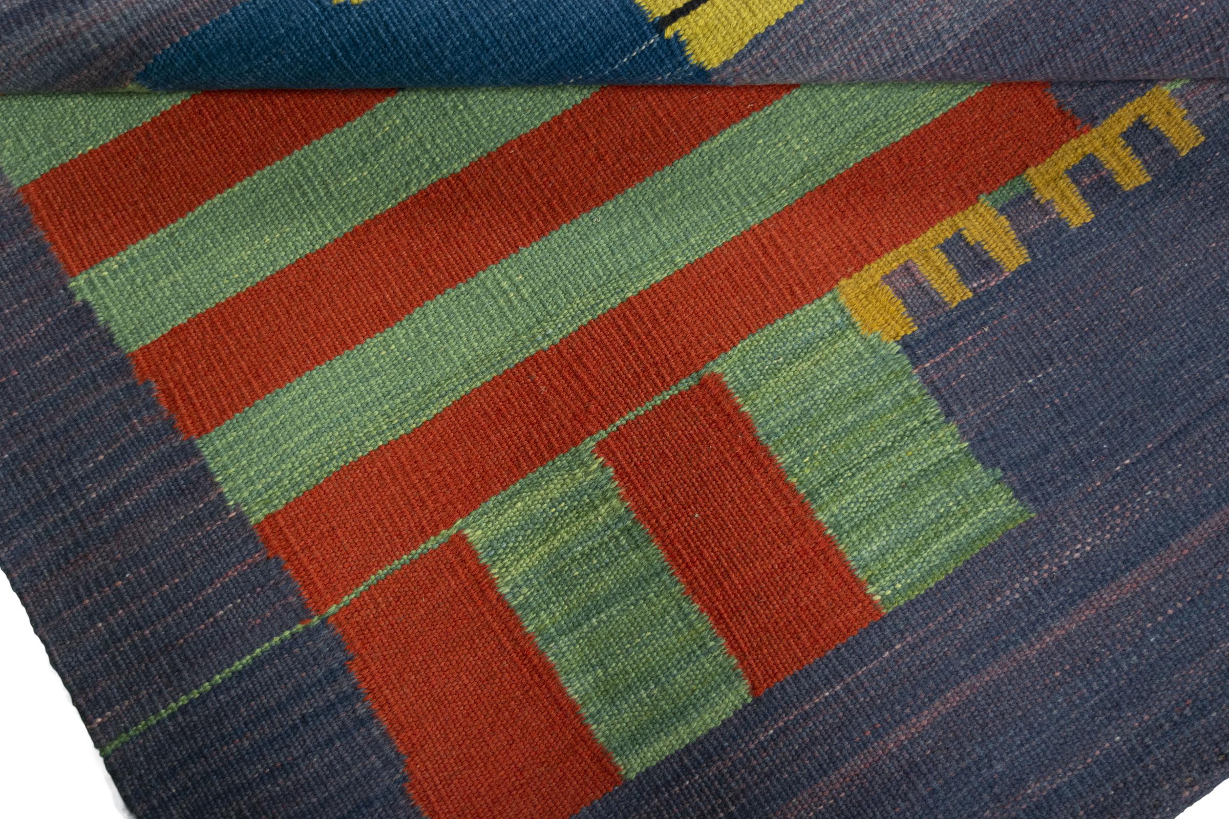This rug was made as a flat weave by hand on a loom. Flatweave is the term used to describe rugs that have no pile. As the name promises, these rugs are woven and not knotted. This results in a flat rug with a structured surface. Flatweaves are not as soft and usually thinner than knotted rugs. At the same time they are much less complex to manufacture and can usually be laid out from both sides (front and back). Their patterns are usually geometric, which is determined by the fabric.