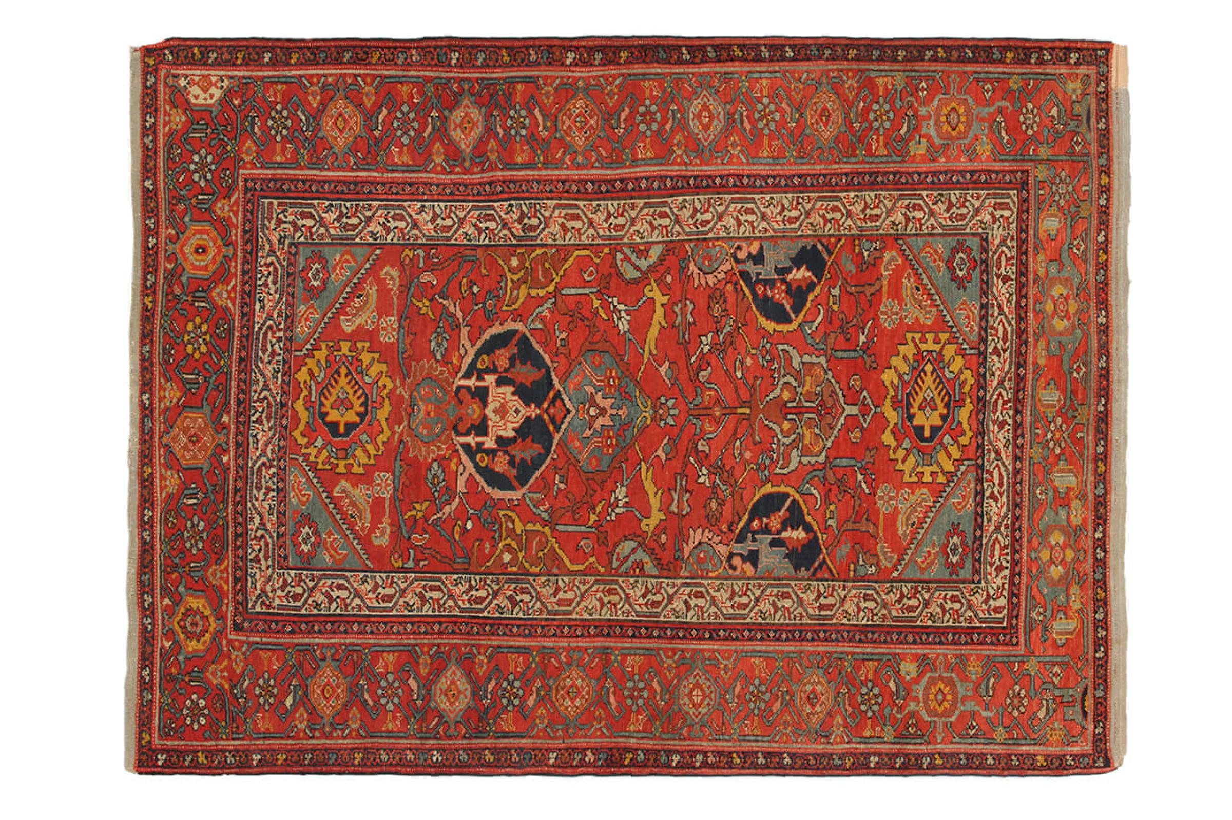 Carpet ID: 310034005665664 Size: 188x145 cm Thickness: ap. 8 mm Knot density: 410 000 - 450 000 / m² Manufacturing: Knotted by hand Pile: Handspun wool Warp: Cotton Condition / Conservation Perfect Origin: Persia Age: Antique, over 80 years Weight: ap. 8 kg Also know as Arak , Sarough, Sarouk, Saruk, Saroq, Sultanabad In stock: Unique - Only 1 in stock