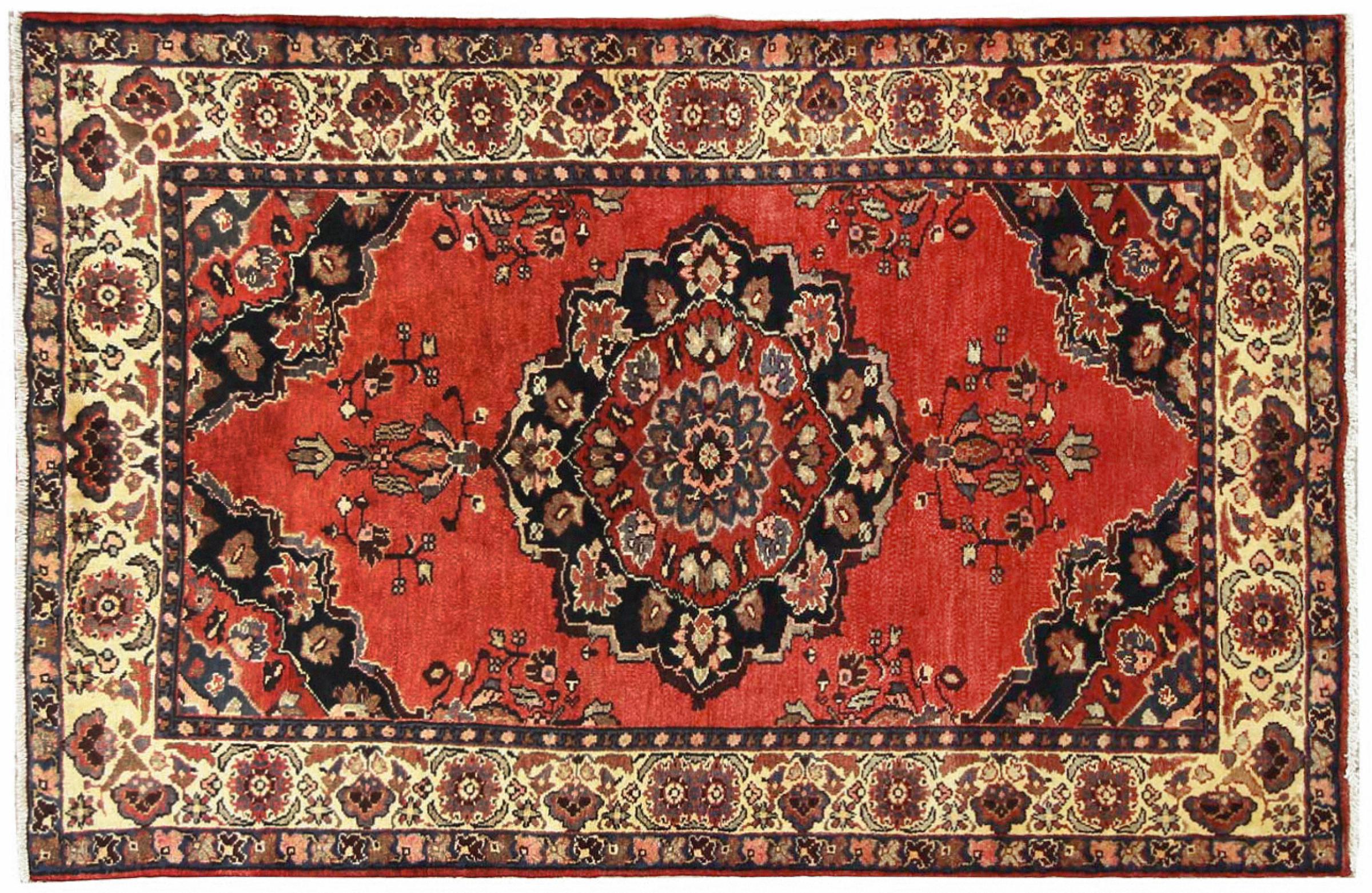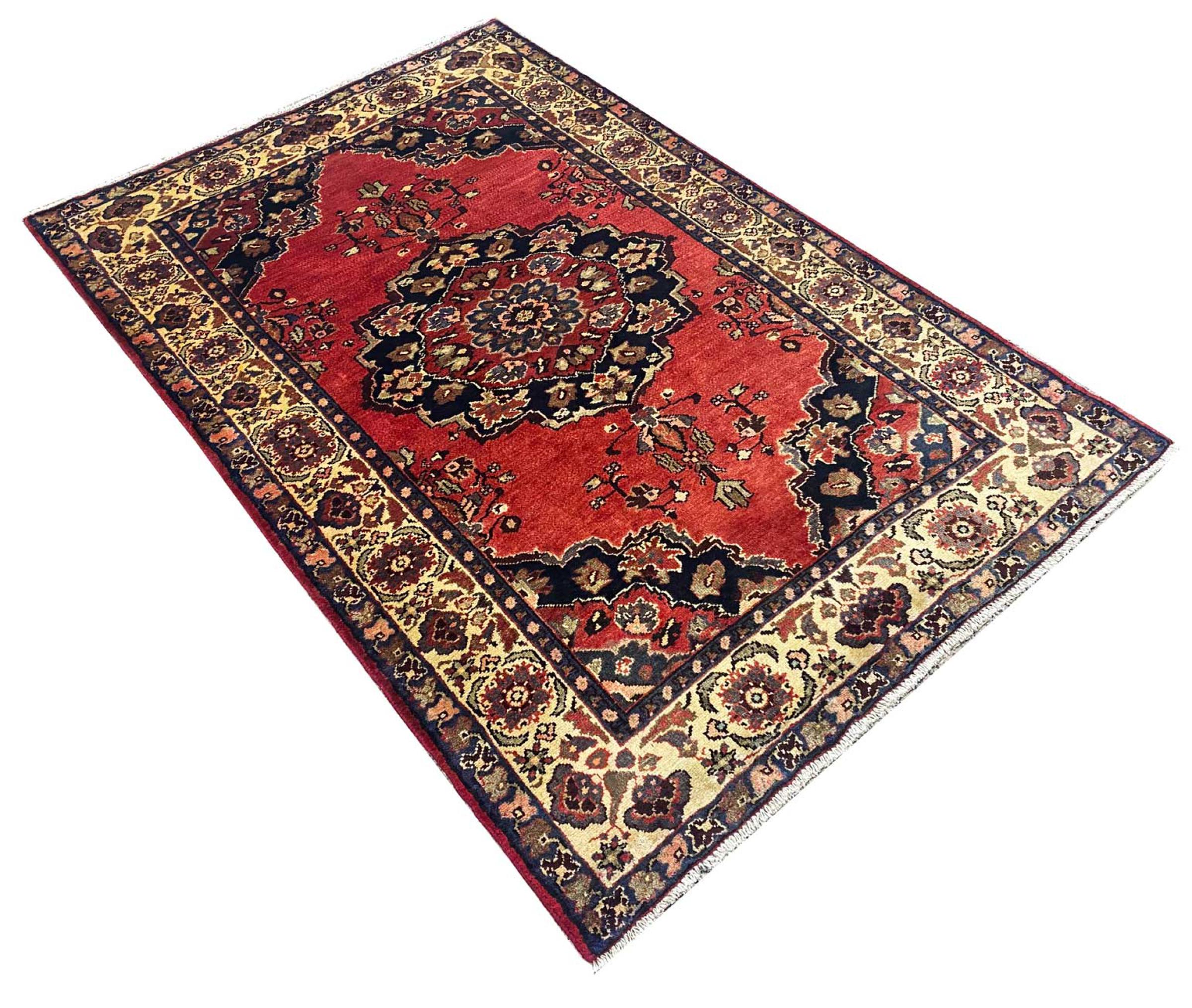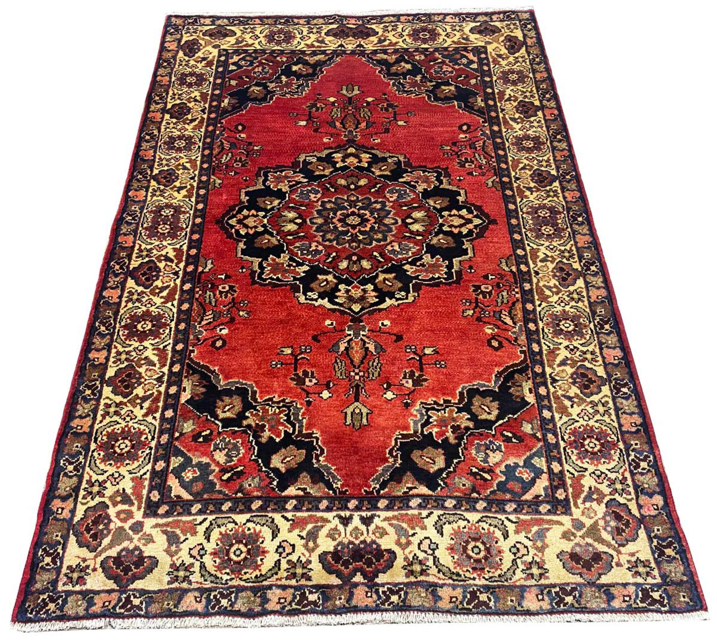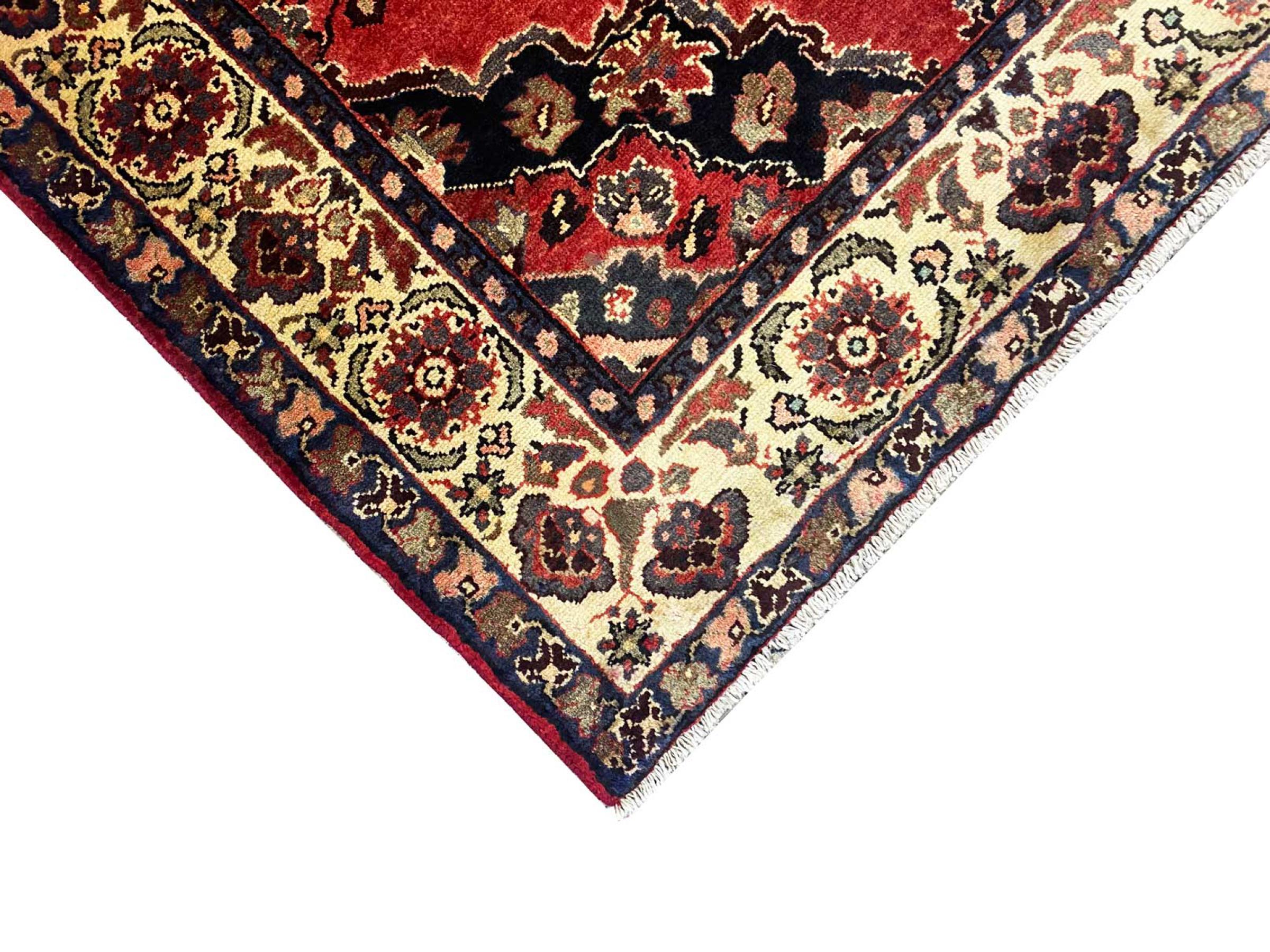 Carpet ID: 303253007729961 Size: 206x134 cm Thickness: ap. 8 mm Knot density: 128 000 - 160 000 / m² Manufacturing: Knotted by hand Pile: Handspun wool Warp: Cotton Origin: Persia Age: New Weight: ap. 10 kg Also know as Huseinabad In stock: Unique - Only 1 in stock