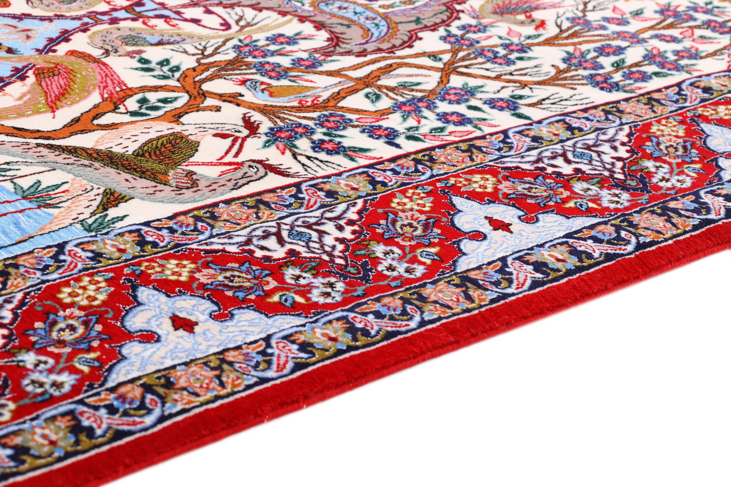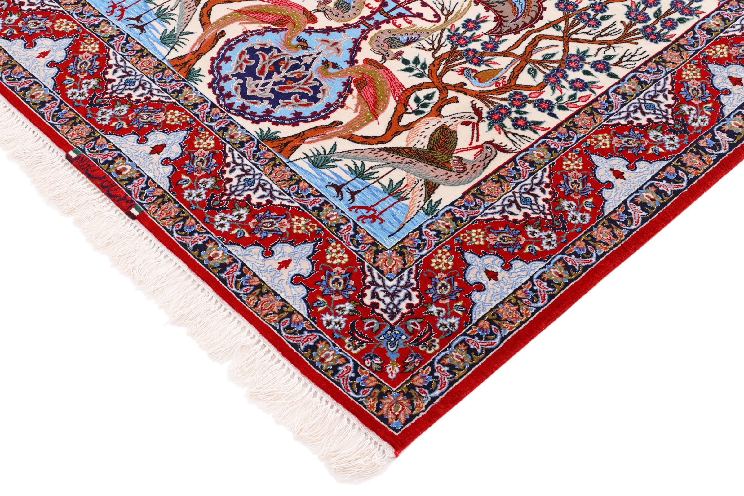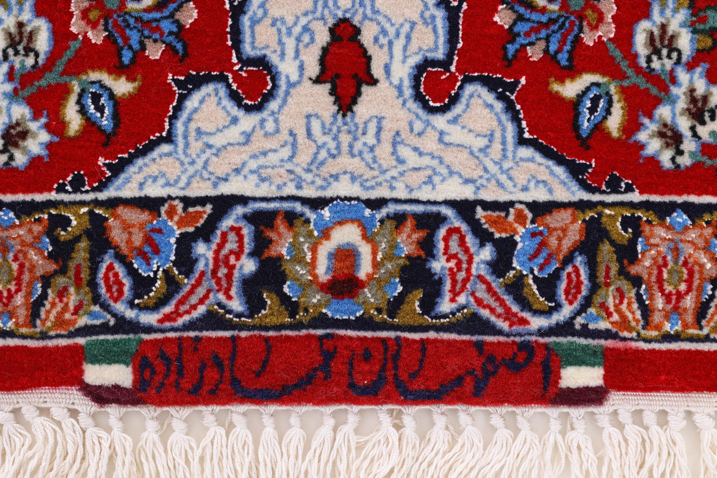 This Isfahan carpet is a piece of the most traditional handicraft. It has been made by hand with the most beautiful patterns. In fact, Isfahan carpets are known to count to the finest Persian carpets. This one has been knotted in Isfahan, which is famous of being the most beautiful city in Iran. The carpet is an exceptionally piece of art.