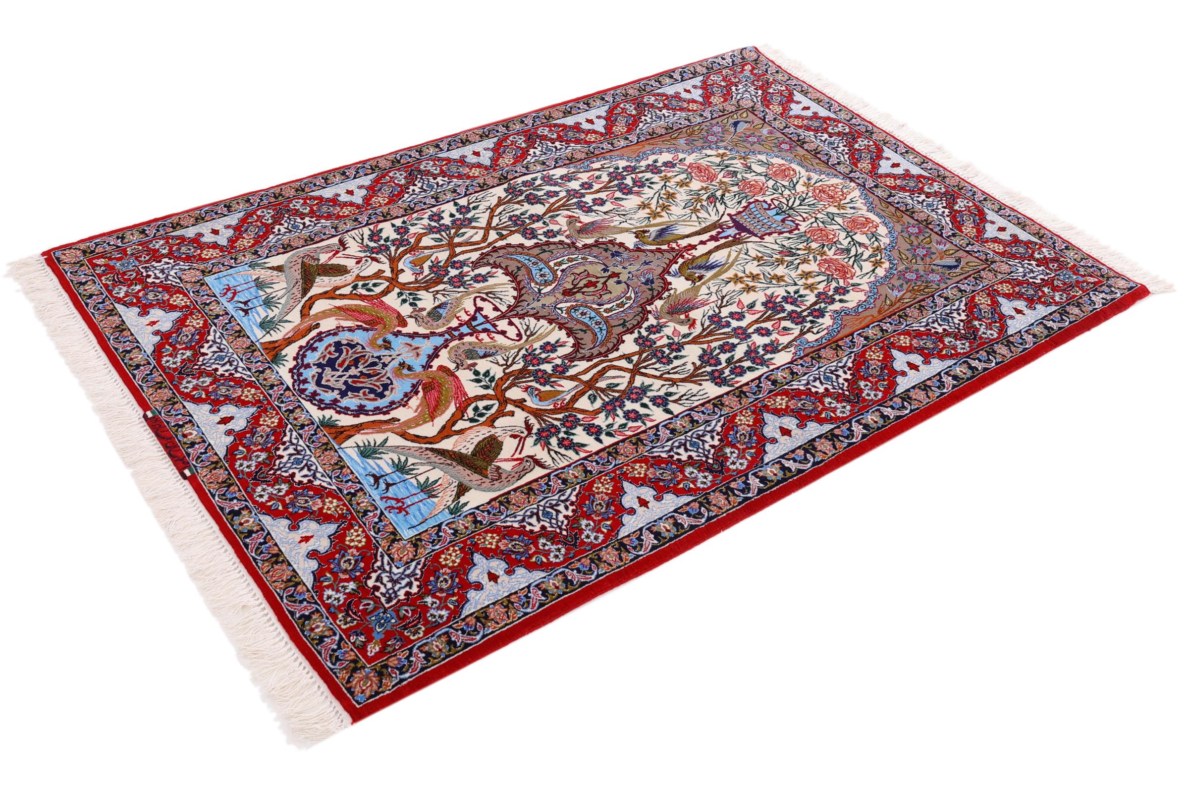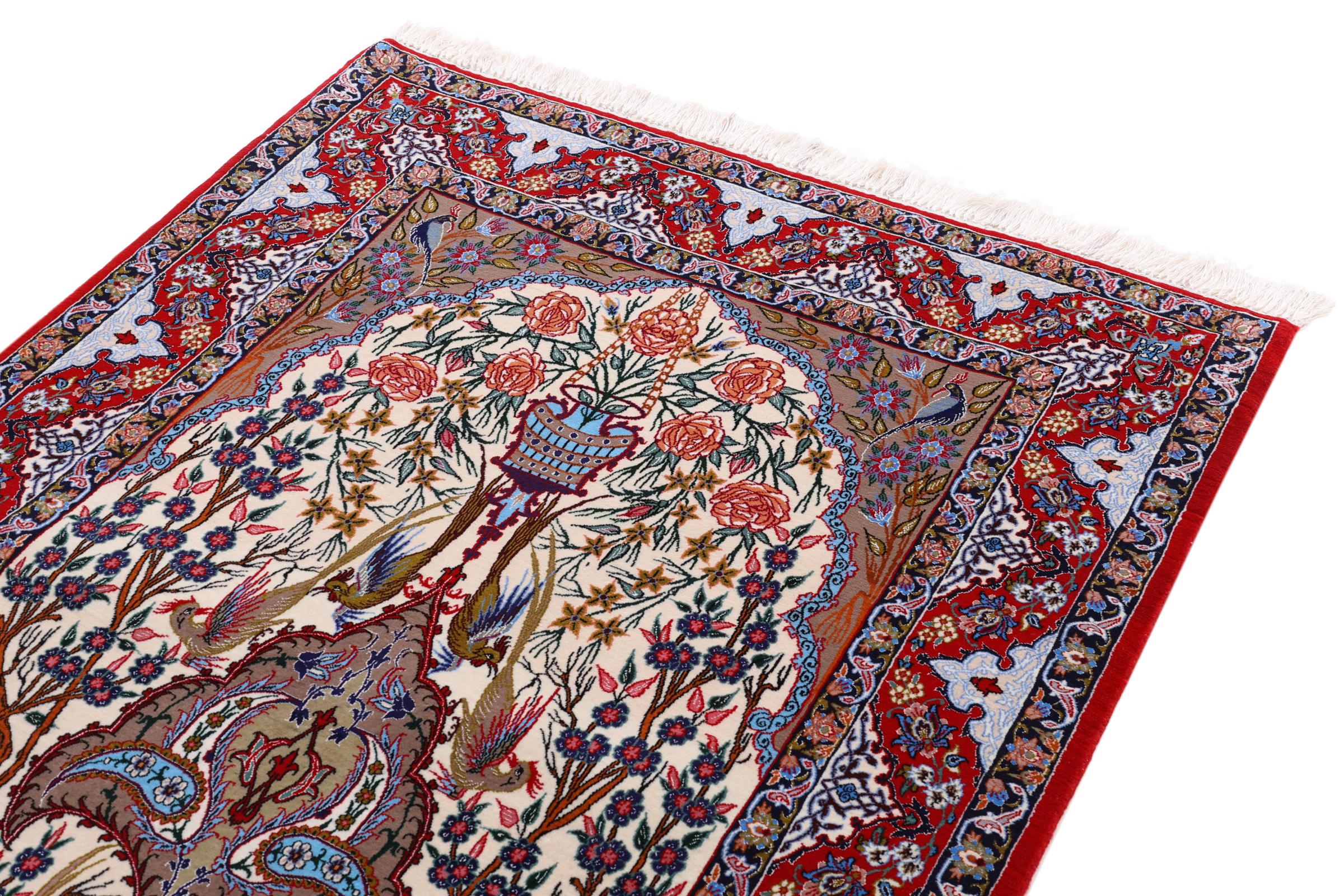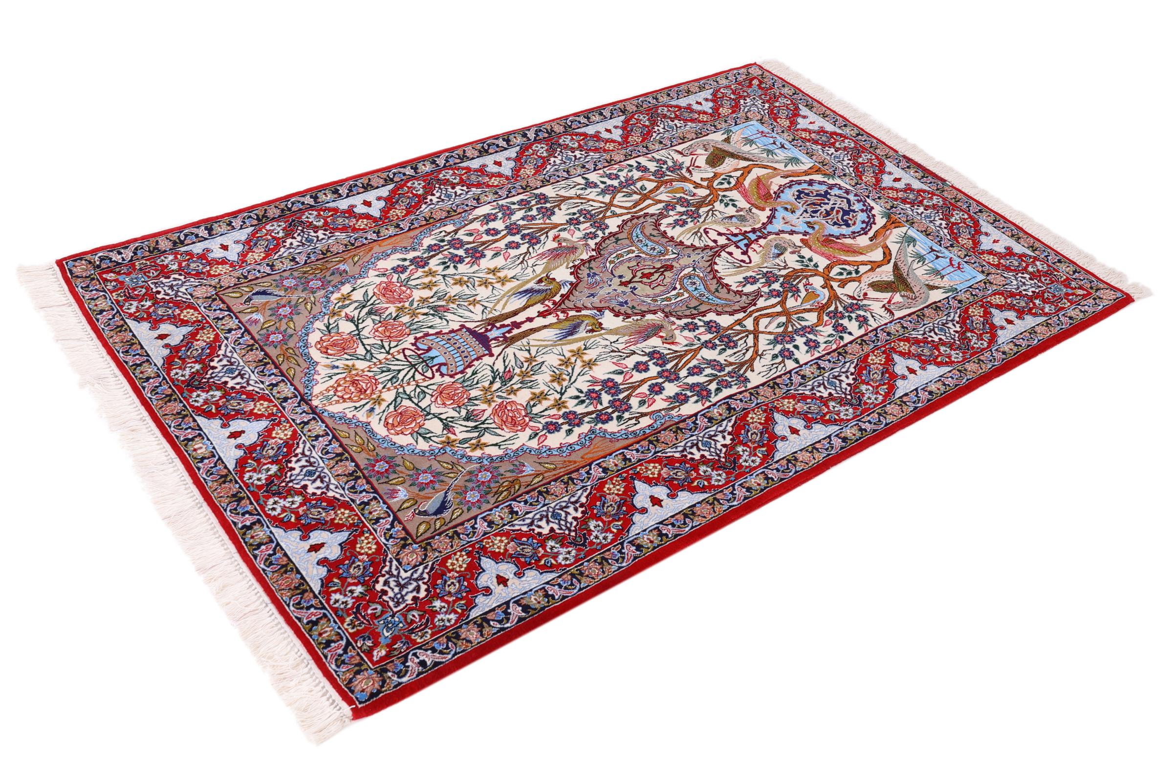 This Isfahan carpet is a piece of the most traditional handicraft. It has been made by hand with the most beautiful patterns. In fact, Isfahan carpets are known to count to the finest Persian carpets. This one has been knotted in Isfahan, which is famous of being the most beautiful city in Iran. The carpet is an exceptionally piece of art.