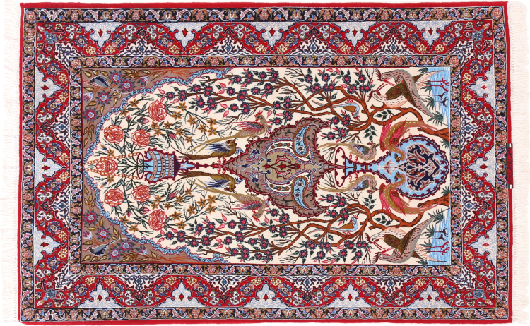 Rugs from this city belong to the probably most valuable hand-knotted Persian rugs worldwide. Very fine Isfahan rugs come from the studios of world-renowned master knotters who achieve a knot density of more than a million knots per square meter. To own an Isfahan means to have a Persian rug of the highest knotting skill. The design of these rugs is mostly inspired by the impressive mosques and squares of the city bearing the same name.