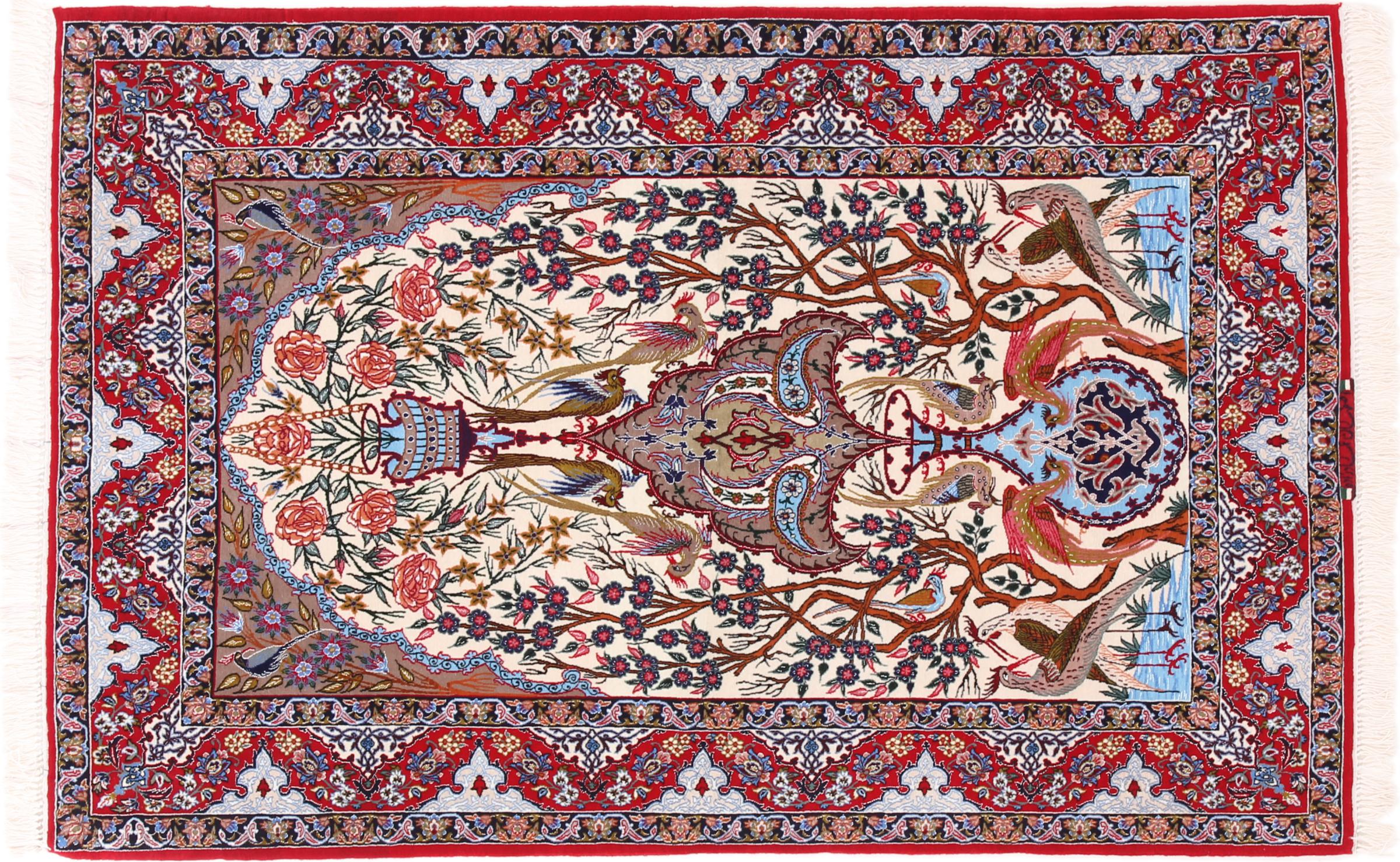 Carpet ID: 197834008604394 Size: 168x113 cm Thickness: ap. 6 mm Knot density: 810 000 / m² Manufacturing: Knotted by hand Pile: Wool with silk Warp: Silk Origin: Persia Age: New Weight: ap. 6 kg In stock: Unique - Only 1 in stock