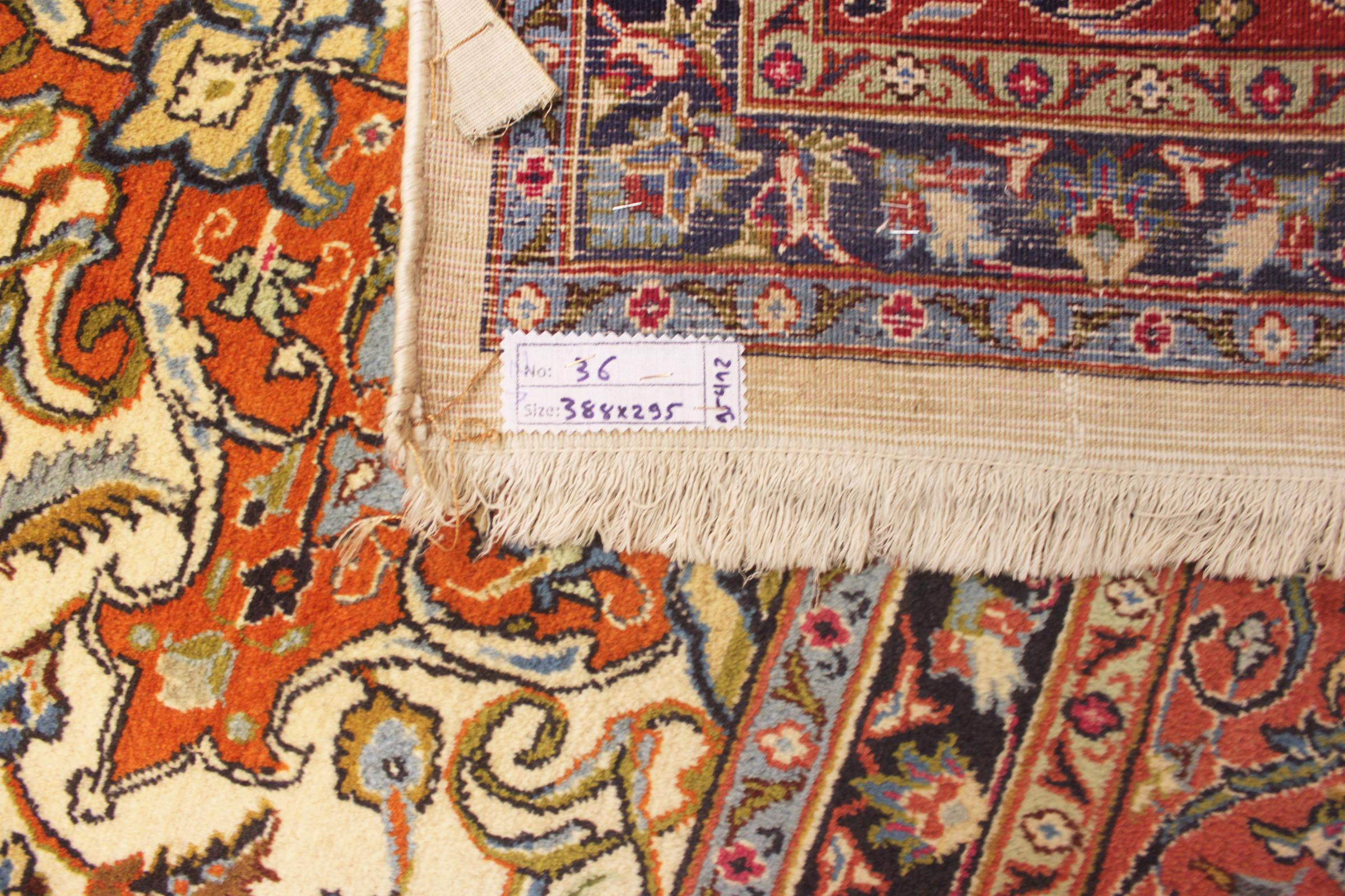 Carpet ID: 29608009580436 Size: 387x294 cm Thickness: ap. 12 mm Knot density: 320 000 - 350 000 / m² Manufacturing: Knotted by hand Pile: Handspun wool Warp: Cotton Origin: Persia Age: New Weight: ap. 40 kg In stock: Unique - Only 1 in stock
