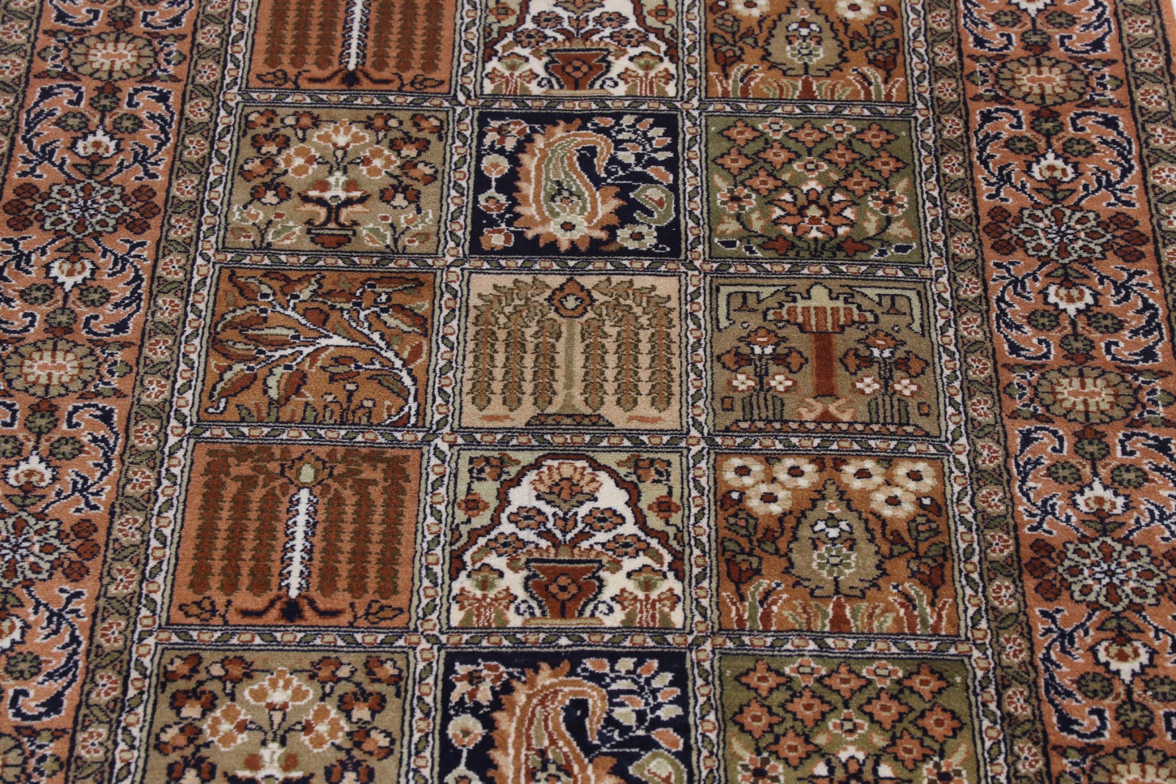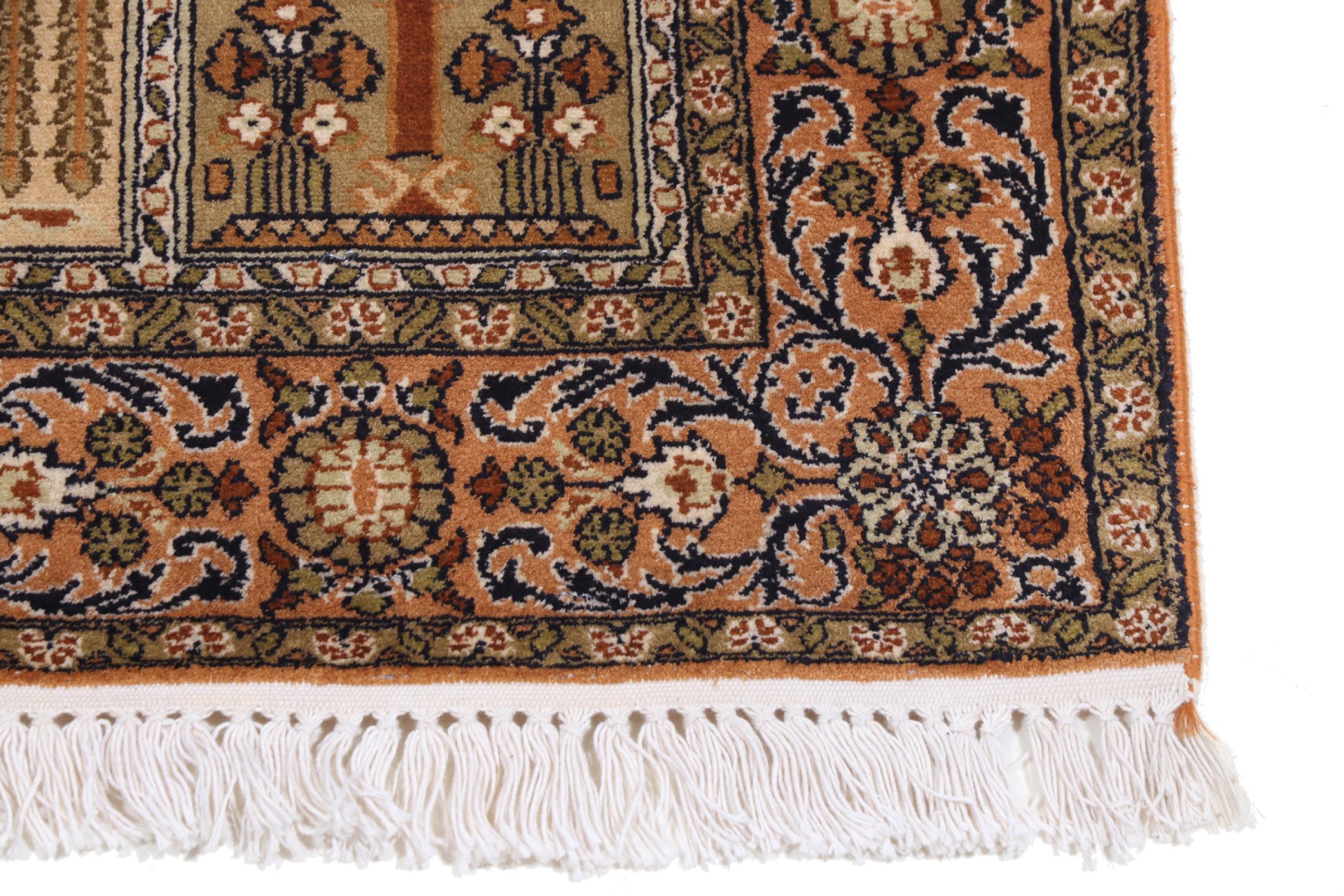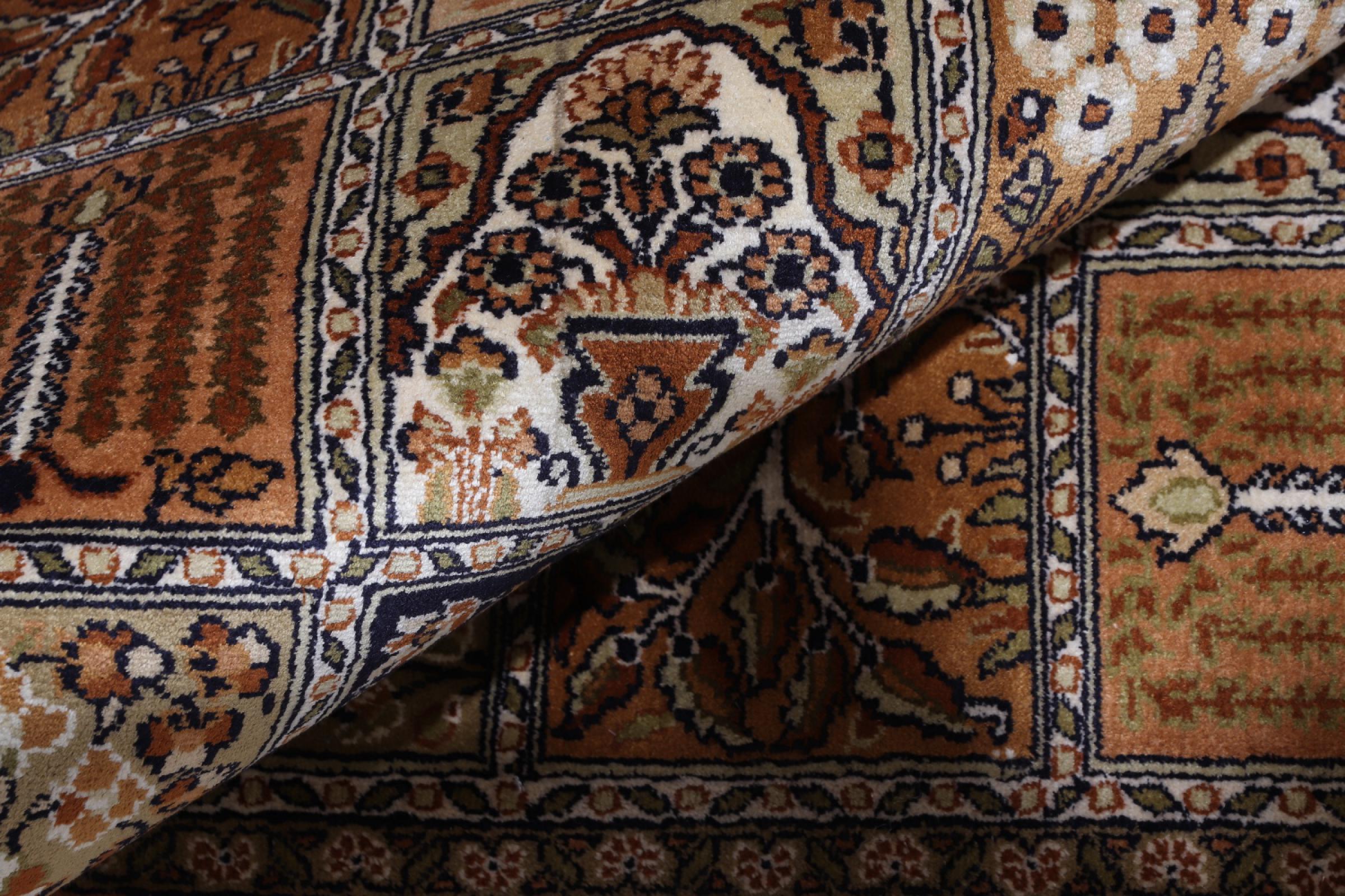 This hand-knotted silk carpet made of cashmere reflects the skills of Indian carpet weavers. The fine natural silk is a fascinating highlight. Not only does it feel particularly soft to the touch, it also lets its colours shine in a wide variety of facets. Depending on the incidence of light, completely new details and colours are visible. You can look at a carpet like this for hours and forget about time - an experience you can't capture in a photo.