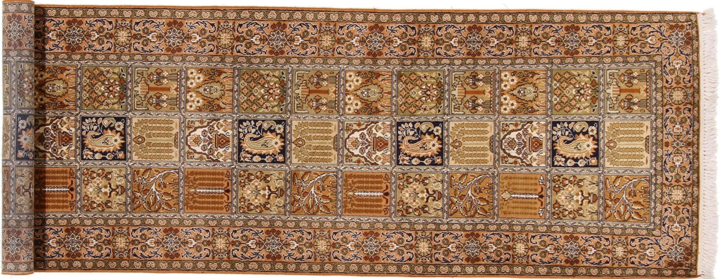 Carpet ID: 34917009610272 Size: 291x84 cm Thickness: ap. 4 mm Knot density: 650 000 / m² Manufacturing: Knotted by hand Pile: Silk Warp: Cotton Origin: India Age: New Weight: ap. 5 kg In stock: Unique - Only 1 in stock
