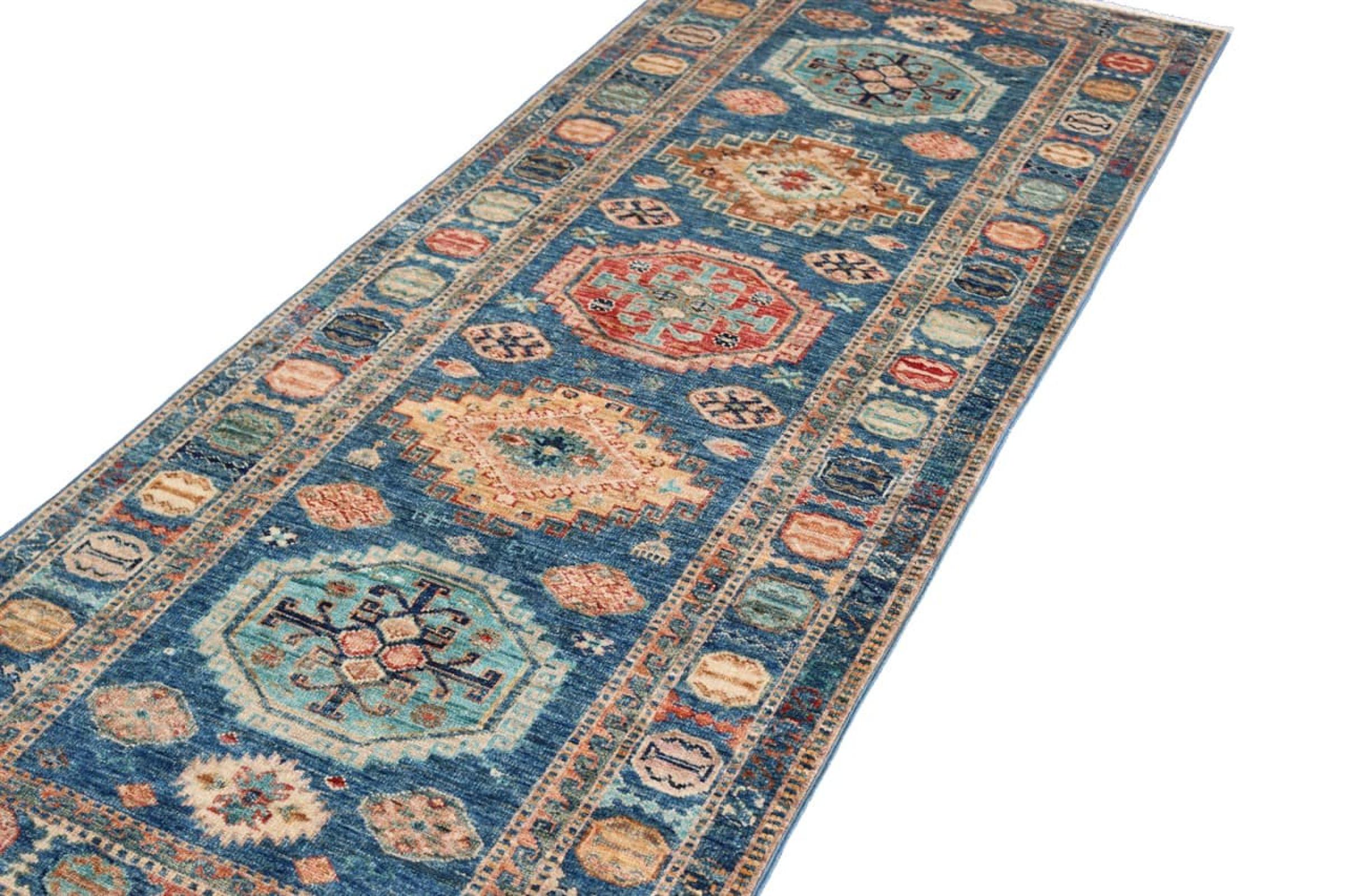 Carpet ID: 299302002519130 Size: 202x80 cm Thickness: ap. 5 mm Knot density: 120 000 - 150 000 / m² Manufacturing: Knotted by hand Pile: Handspun wool Warp: Cotton Origin: Afghanistan Age: New Weight: ap. 4 kg In stock: Unique - Only 1 in stock