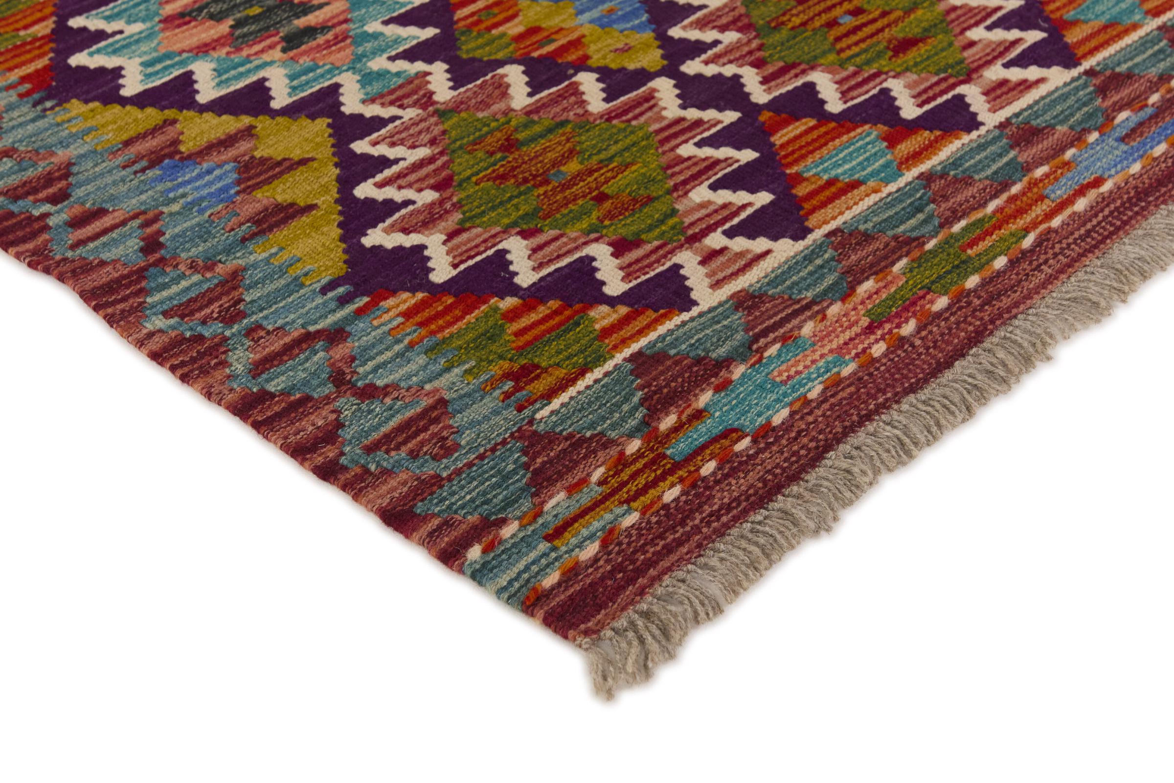 This handwoven Kilim Afghan is a wonderful and unique piece of art. Hard to believe that these modern colours and patterns have already been used centuries ago. This carpet has been woven by hand in old tradition in Afghanistan. It delivers a portion of contemporary history, which you won't find in this specific design a second time. It consists of high-grade natural wool and gives your home a personalised touch.