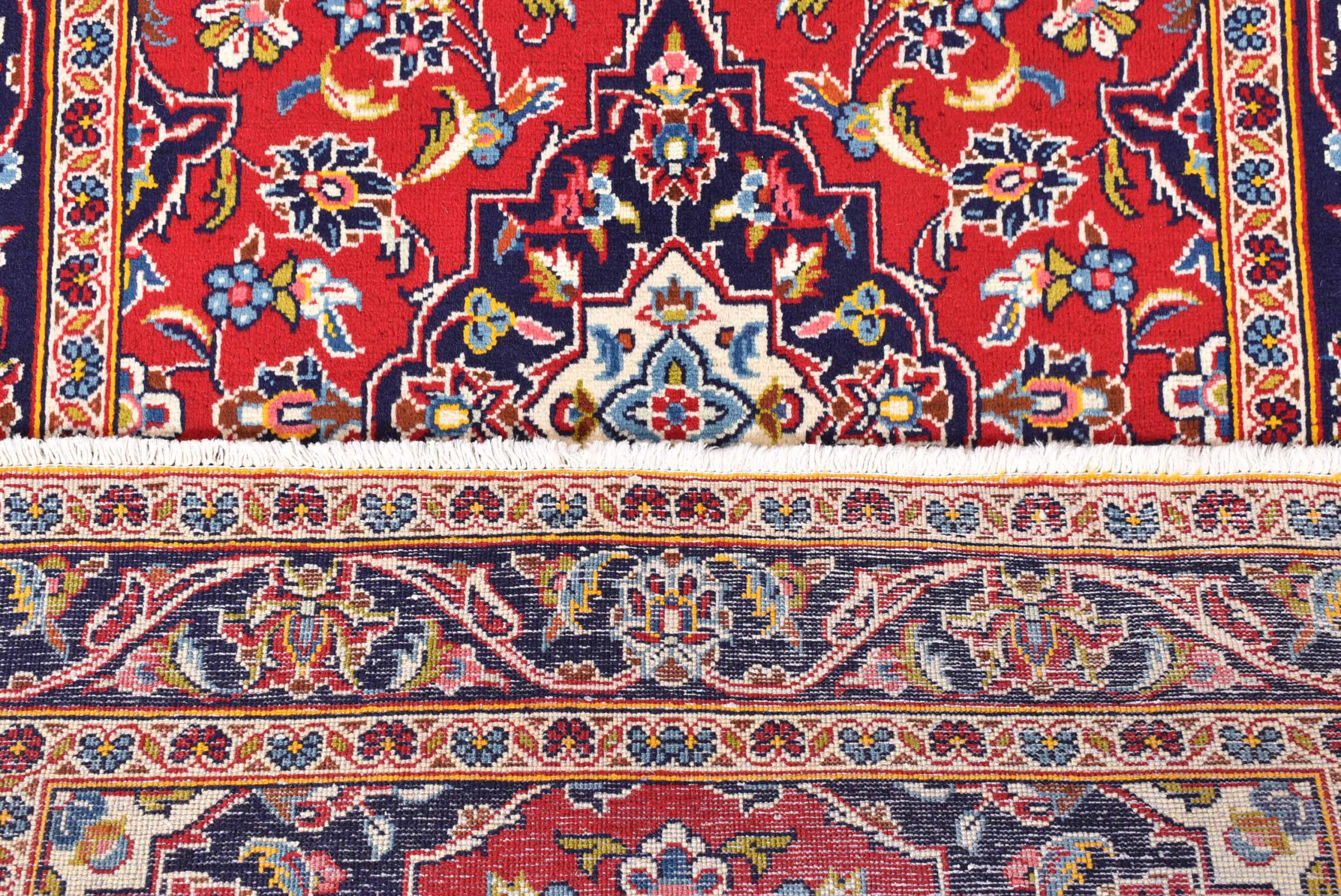 This carpet from Kashan (Keshan) is held in its very traditional and typical Persian design with beautiful ornaments. Kashan rugs are highly popular due to their exceptionally elegant design. These carpets originate from Kashan, a city on the ancient Silk Road. This carpet has been knotted by hand from high grade sheep wool and is going to be an one-of-a-kind highlight in your home.