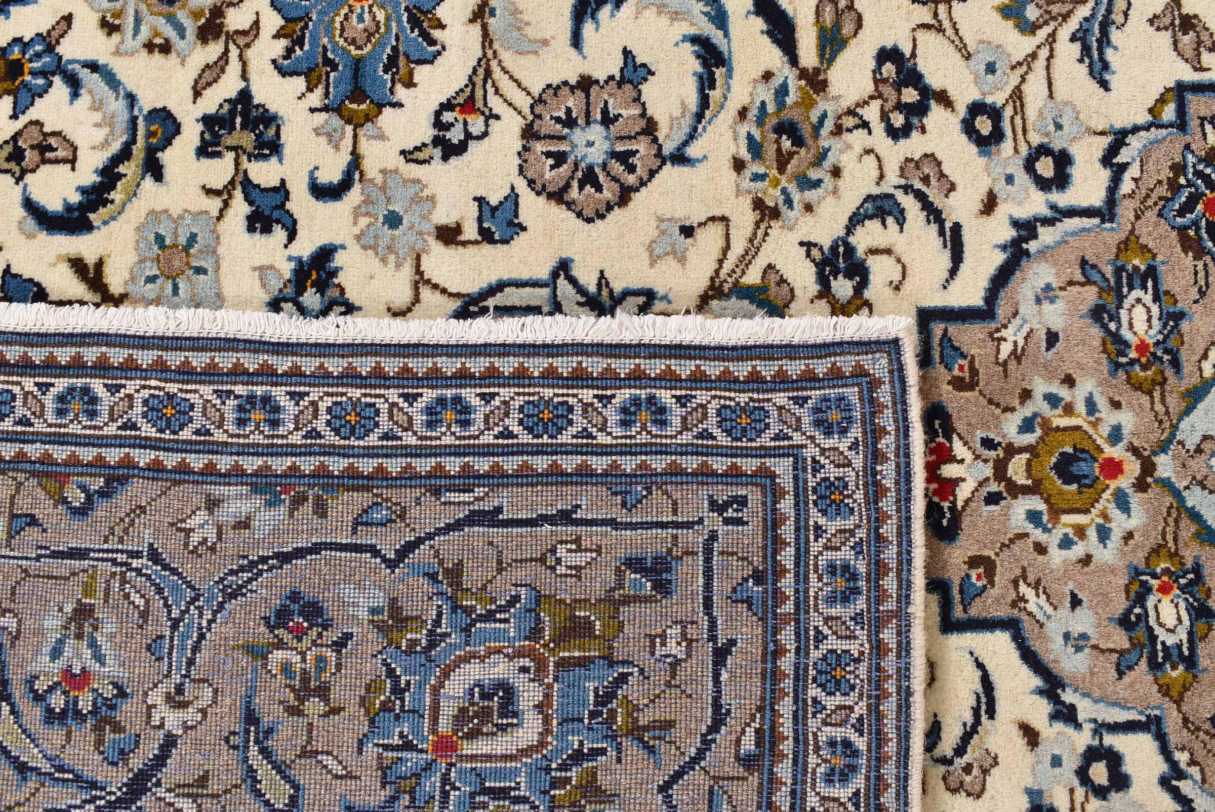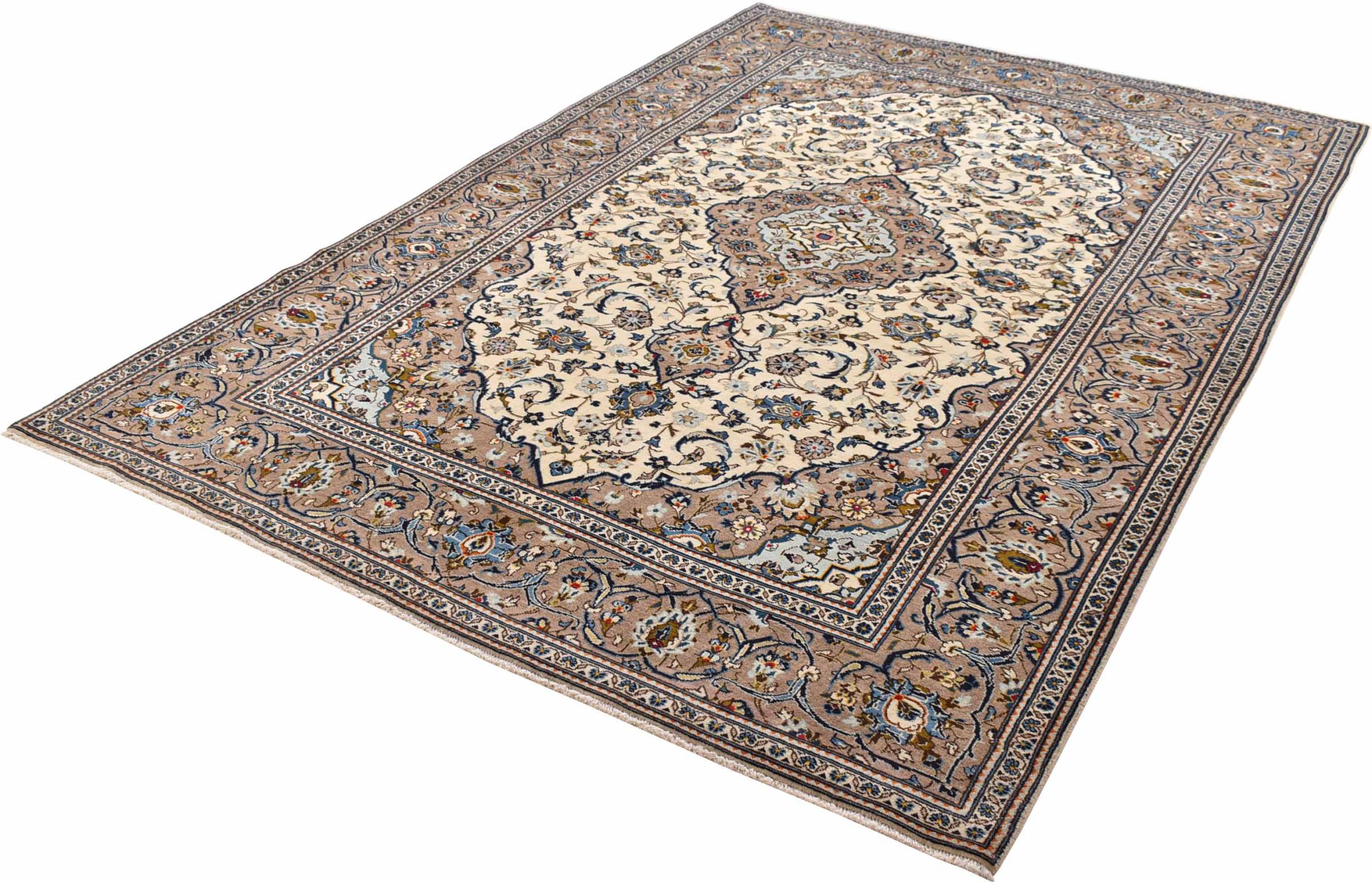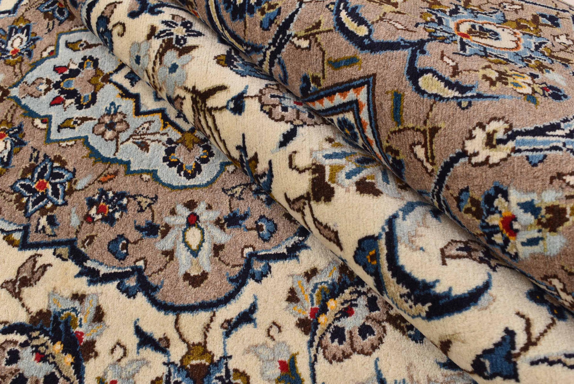 This carpet from Kashan (Keshan) is held in its very traditional and typical Persian design with beautiful ornaments. Kashan rugs are highly popular due to their exceptionally elegant design. These carpets originate from Kashan, a city on the ancient Silk Road. This carpet has been knotted by hand from high grade sheep wool and is going to be an one-of-a-kind highlight in your home.