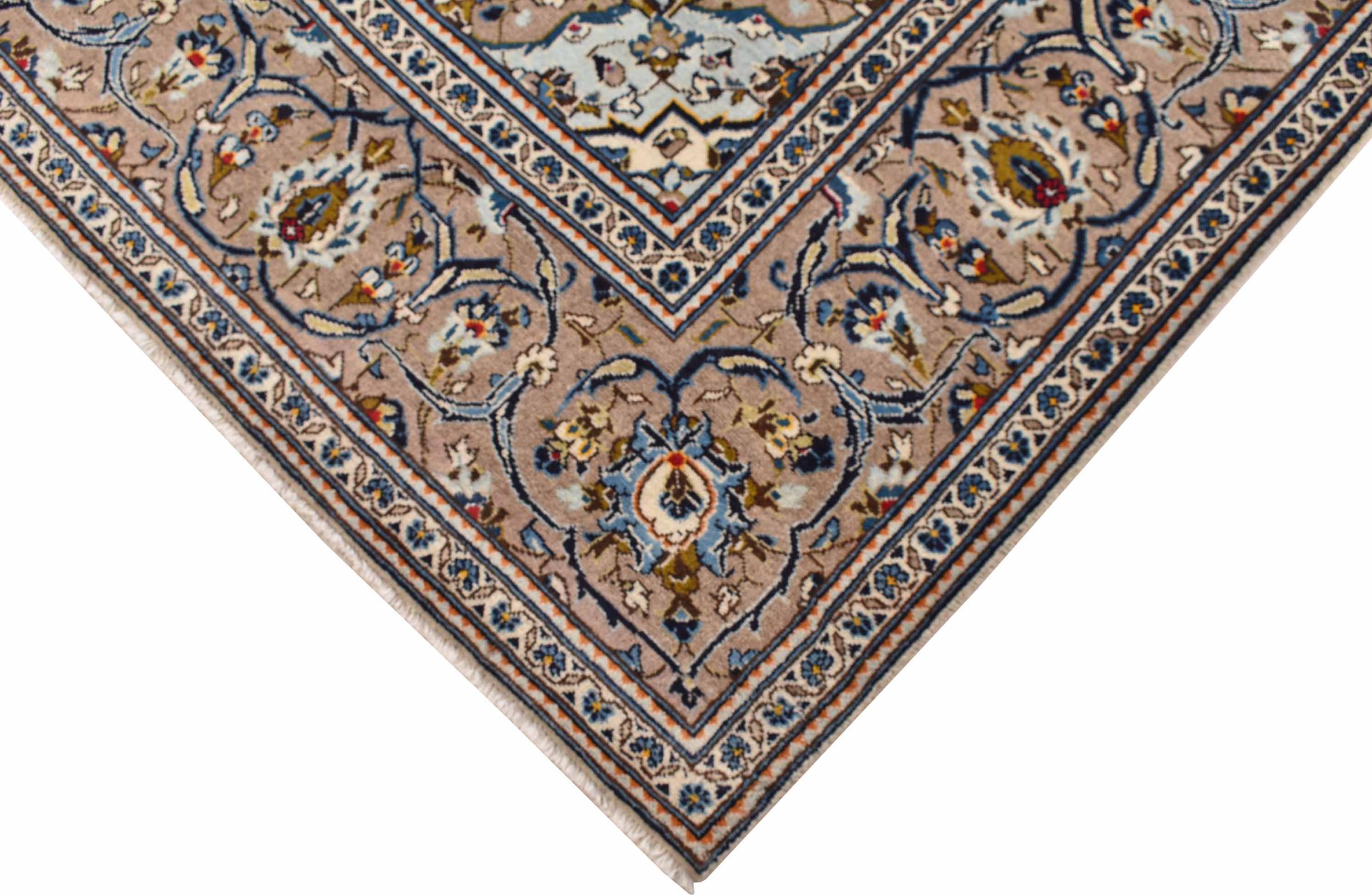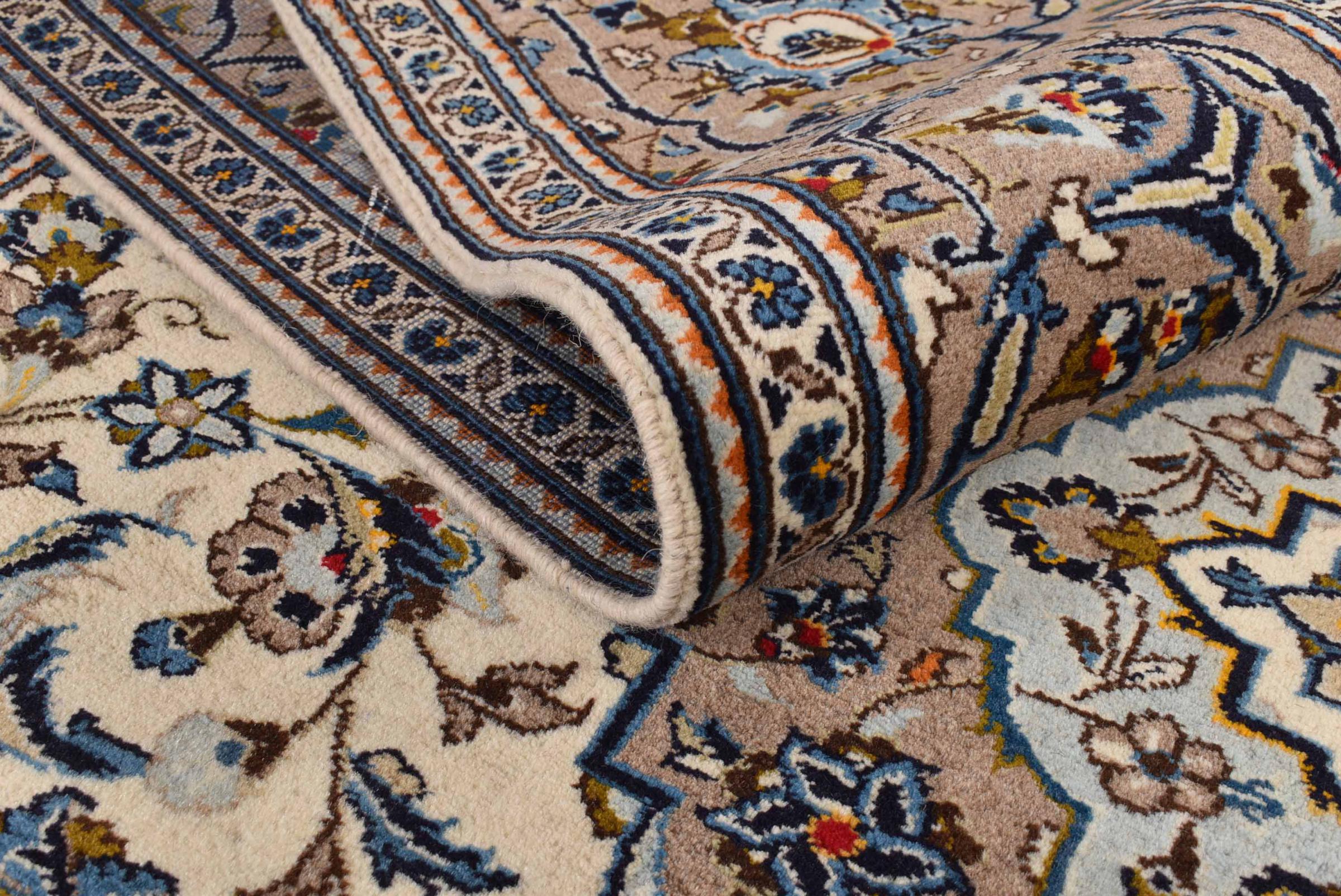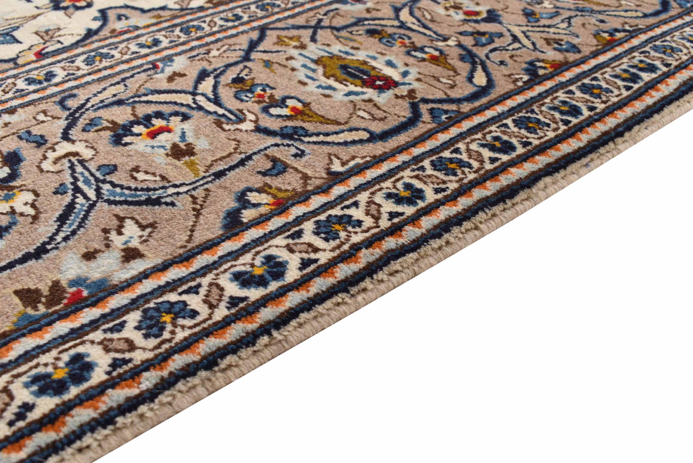 This carpet from Kashan (Keshan) is held in its very traditional and typical Persian design with beautiful ornaments. Kashan rugs are highly popular due to their exceptionally elegant design. These carpets originate from Kashan, a city on the ancient Silk Road. This carpet has been knotted by hand from high grade sheep wool and is going to be an one-of-a-kind highlight in your home.