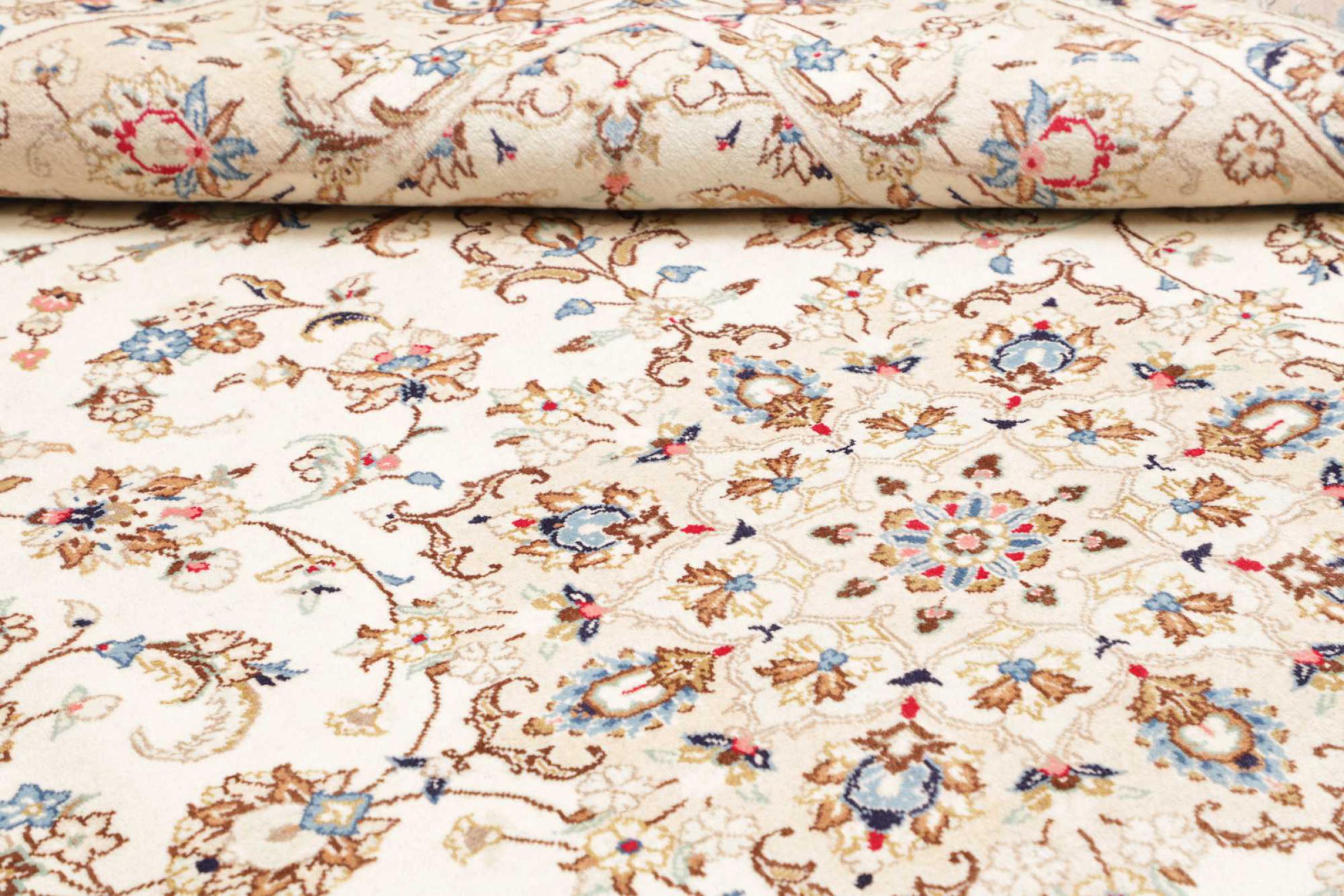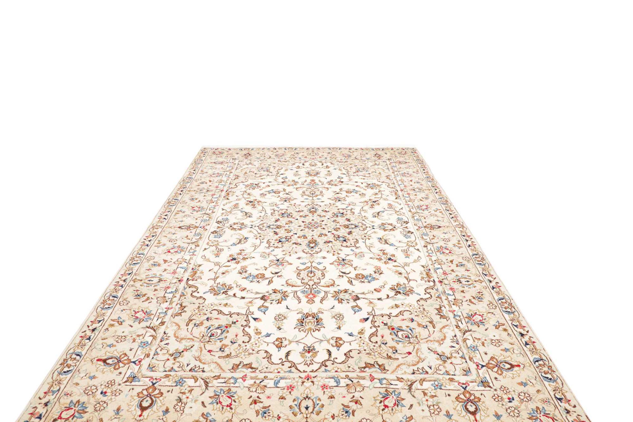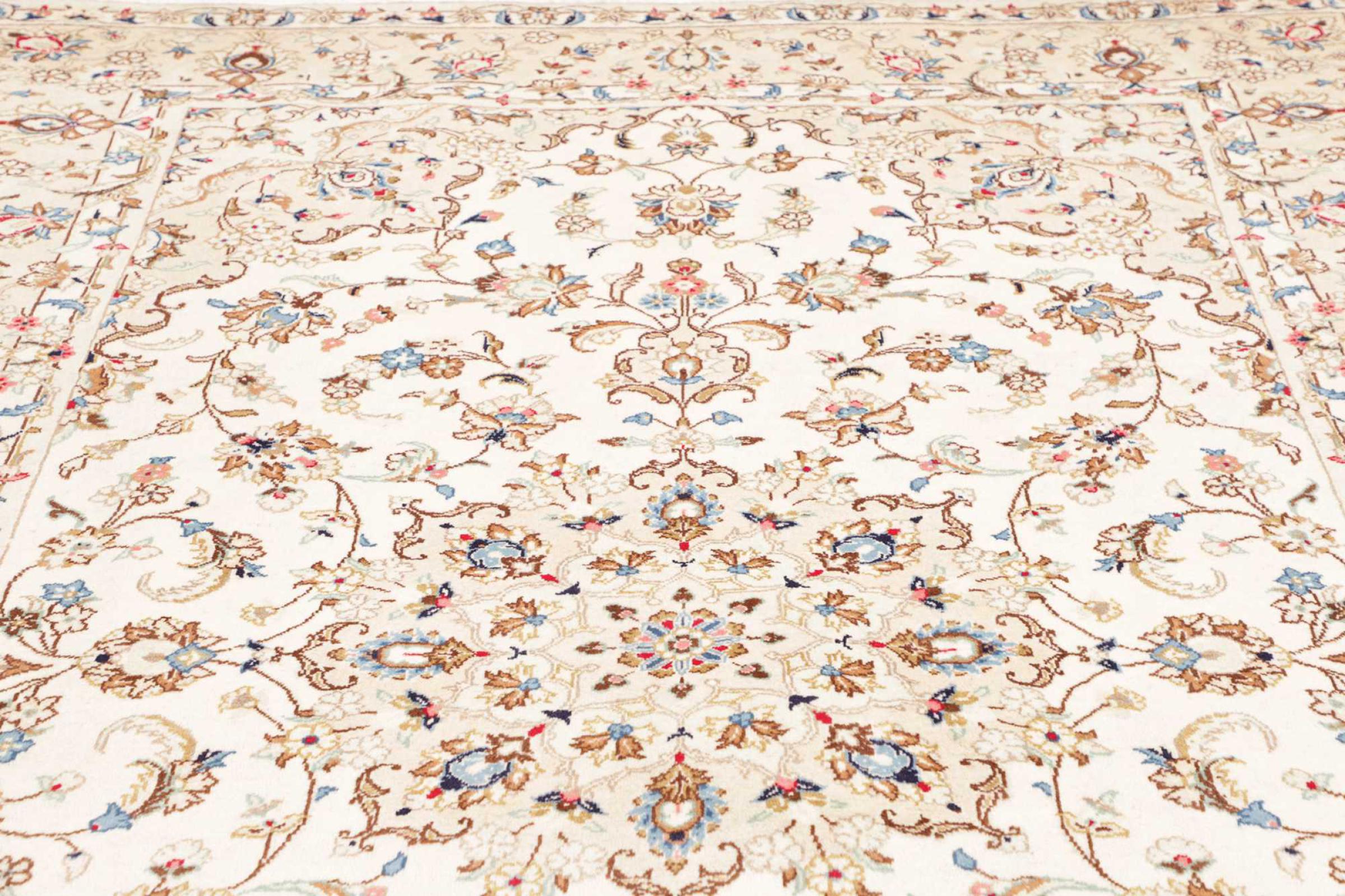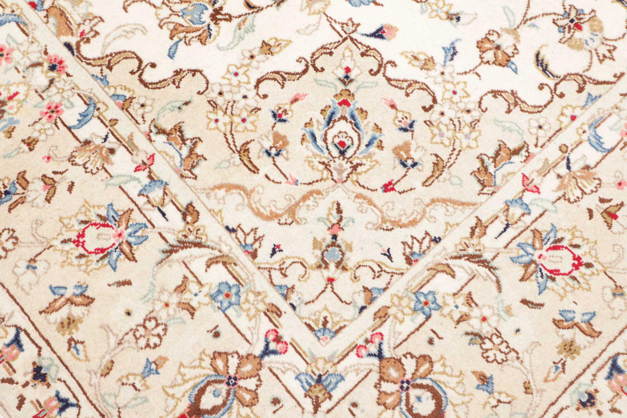 This carpet from Kashan (Keshan) is held in its very traditional and typical Persian design with beautiful ornaments. Kashan rugs are highly popular due to their exceptionally elegant design. These carpets originate from Kashan, a city on the ancient Silk Road. This carpet has been knotted by hand from high grade sheep wool and is going to be an one-of-a-kind highlight in your home.