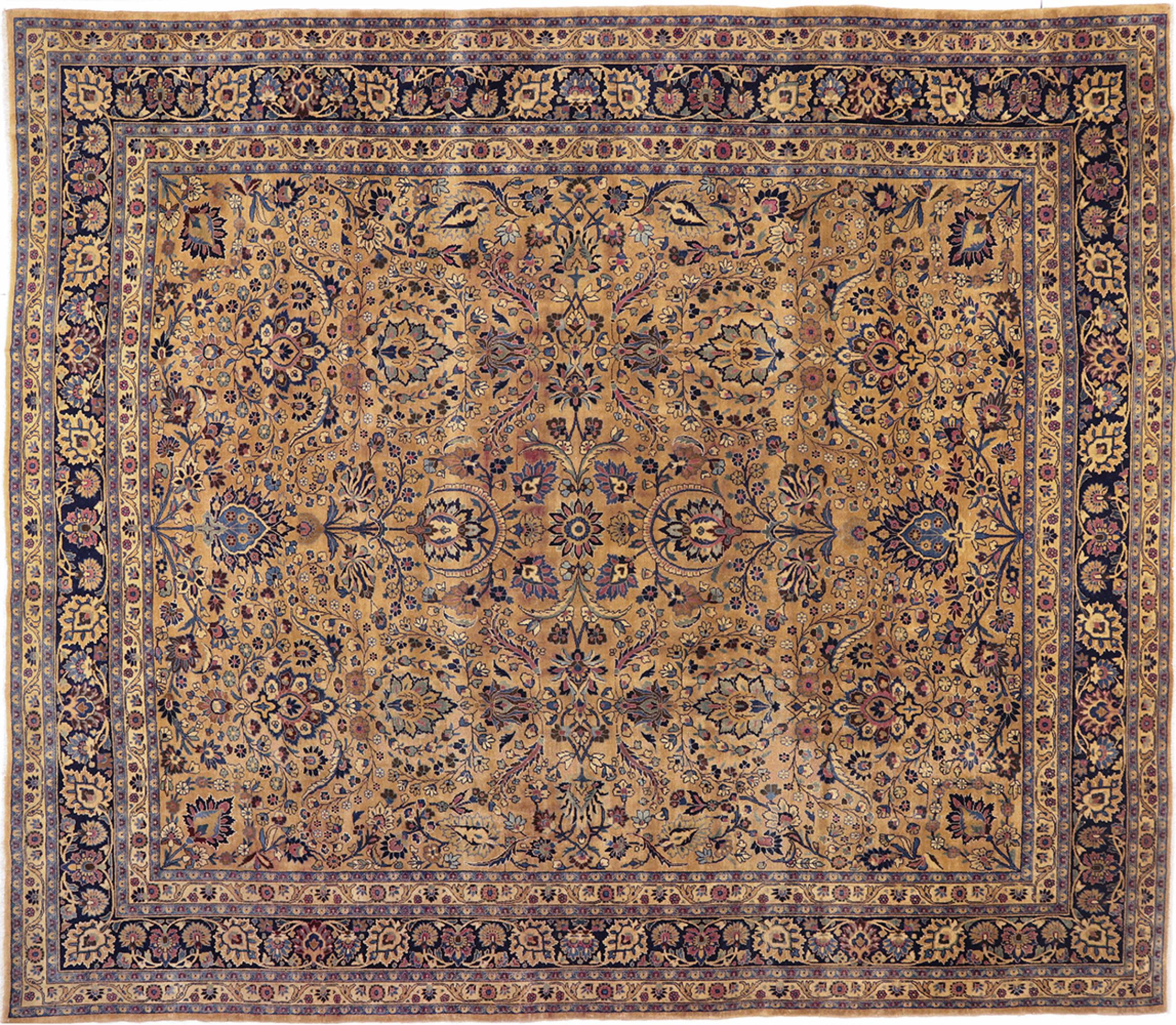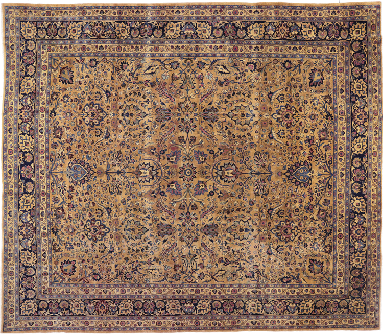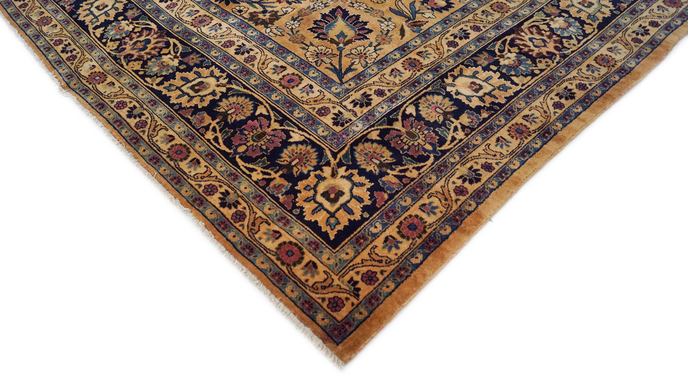 Carpet ID: 316382003686974 Size: 418x367 cm Thickness: ap. 12 mm Knot density: 160 000 - 200 000 / m² Manufacturing: Knotted by hand Pile: Handspun wool Warp: Cotton Condition / Conservation Perfect Origin: Persia Age: Antique, over 80 years Weight: ap. 54 kg Also know as Maschad, Meshed In stock: Unique - Only 1 in stock