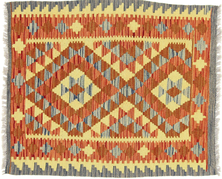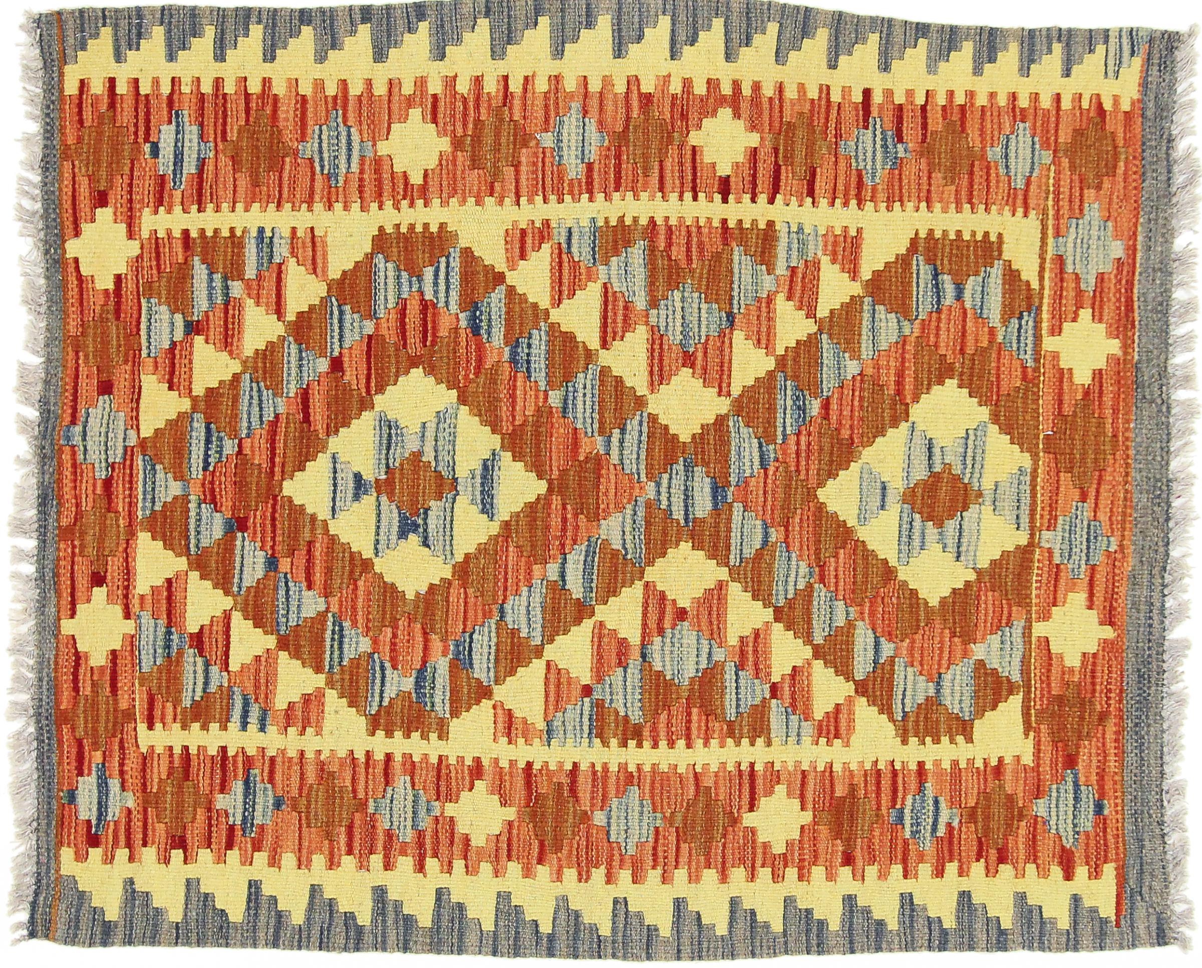 This handwoven Kilim Afghan is a wonderful and unique piece of art. Hard to believe that these modern colours and patterns have already been used centuries ago. This carpet has been woven by hand in old tradition in Afghanistan. It delivers a portion of contemporary history, which you won't find in this specific design a second time. It consists of high-grade natural wool and gives your home a personalised touch.
