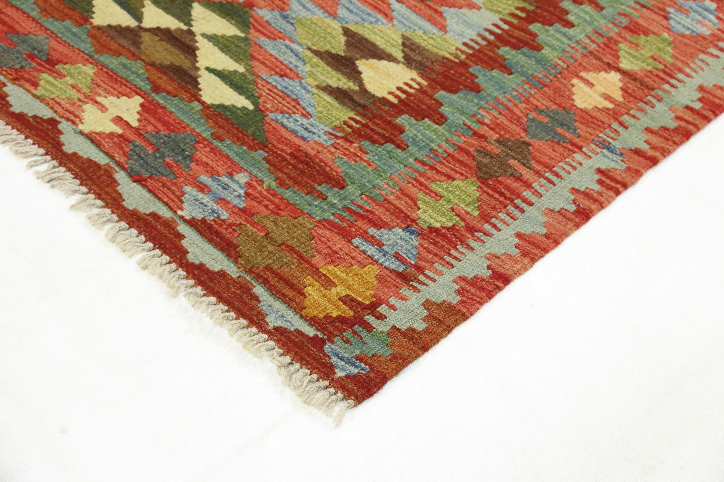 This handwoven Kilim Afghan is a wonderful and unique piece of art. Hard to believe that these modern colours and patterns have already been used centuries ago. This carpet has been woven by hand in old tradition in Afghanistan. It delivers a portion of contemporary history, which you won't find in this specific design a second time. It consists of high-grade natural wool and gives your home a personalised touch.