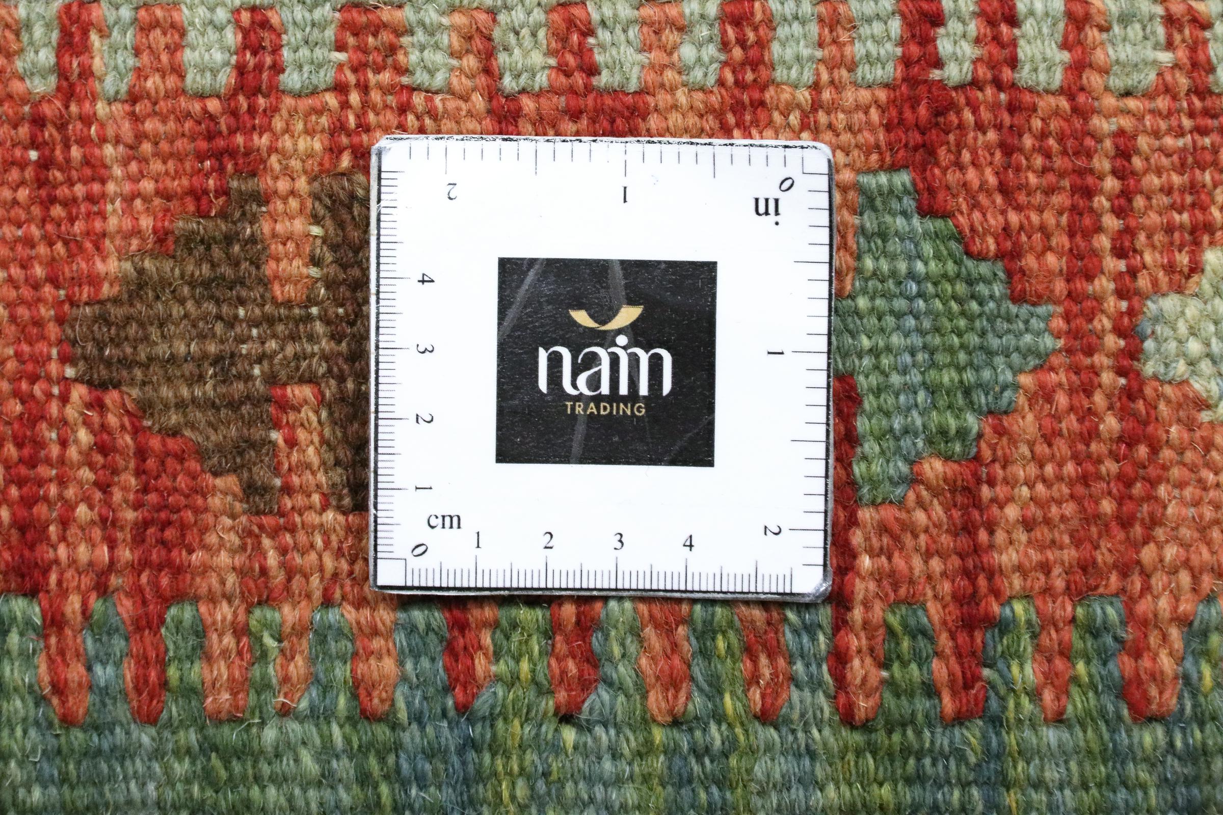 This rug was made as a flat weave by hand on a loom. Flatweave is the term used to describe rugs that have no pile. As the name promises, these rugs are woven and not knotted. This results in a flat rug with a structured surface. Flatweaves are not as soft and usually thinner than knotted rugs. At the same time they are much less complex to manufacture and can usually be laid out from both sides (front and back). Their patterns are usually geometric, which is determined by the fabric.