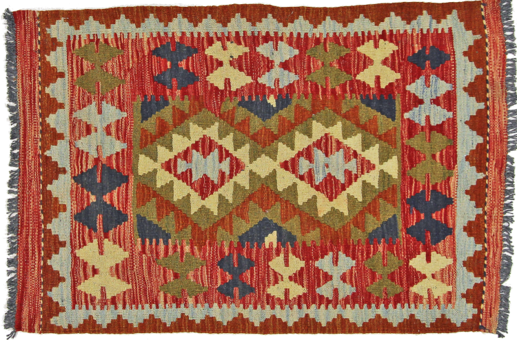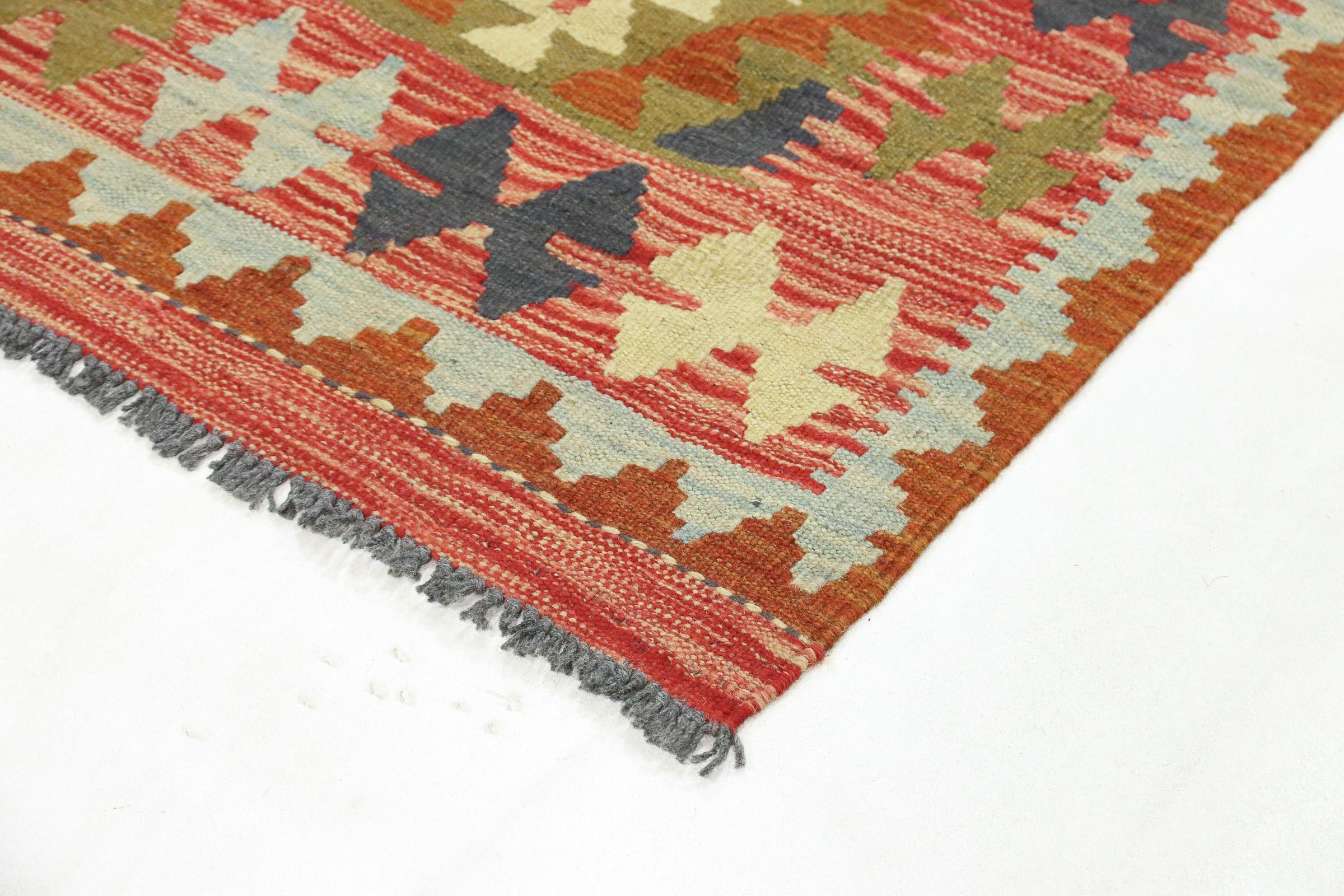 This handwoven Kilim Afghan is a wonderful and unique piece of art. Hard to believe that these modern colours and patterns have already been used centuries ago. This carpet has been woven by hand in old tradition in Afghanistan. It delivers a portion of contemporary history, which you won't find in this specific design a second time. It consists of high-grade natural wool and gives your home a personalised touch.