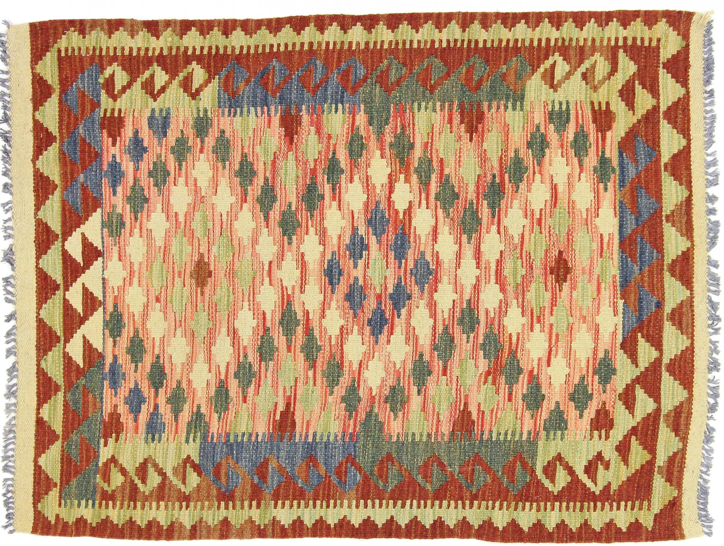 This handwoven Kilim Afghan is a wonderful and unique piece of art. Hard to believe that these modern colours and patterns have already been used centuries ago. This carpet has been woven by hand in old tradition in Afghanistan. It delivers a portion of contemporary history, which you won't find in this specific design a second time. It consists of high-grade natural wool and gives your home a personalised touch.