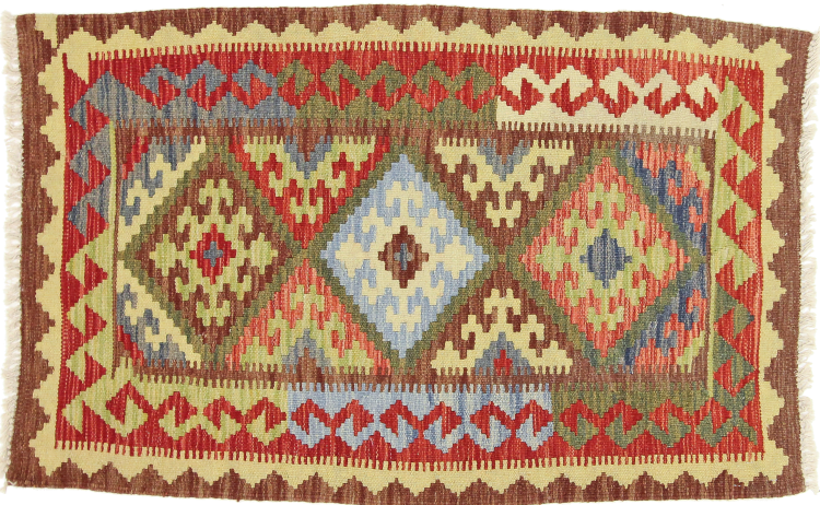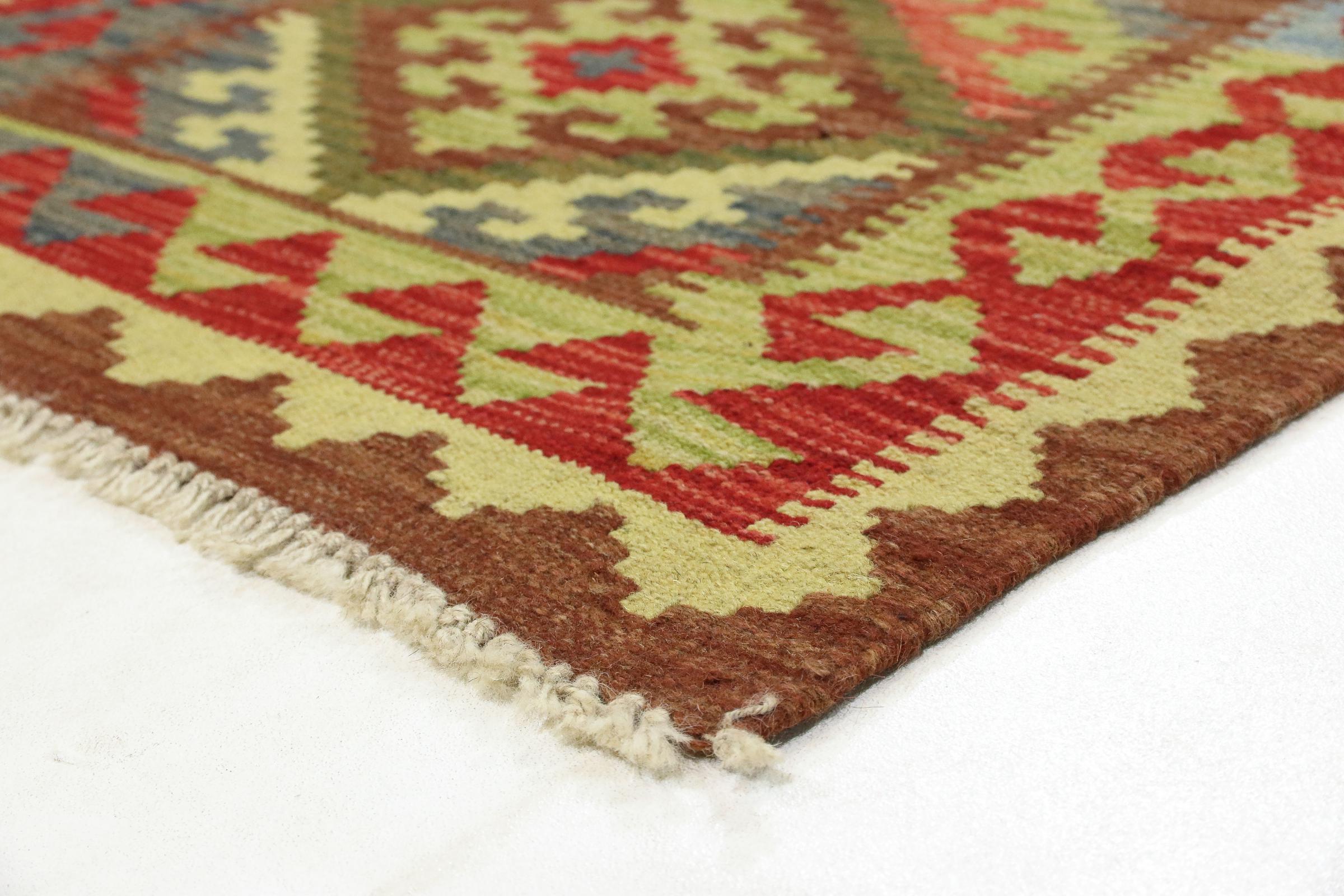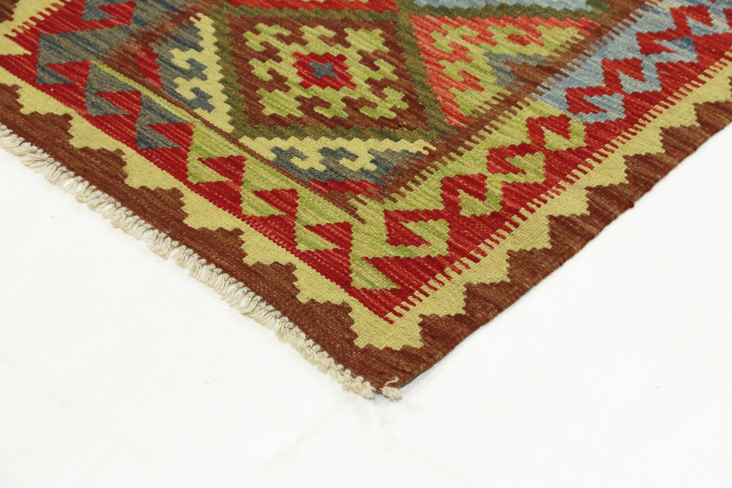 This handwoven Kilim Afghan is a wonderful and unique piece of art. Hard to believe that these modern colours and patterns have already been used centuries ago. This carpet has been woven by hand in old tradition in Afghanistan. It delivers a portion of contemporary history, which you won't find in this specific design a second time. It consists of high-grade natural wool and gives your home a personalised touch.