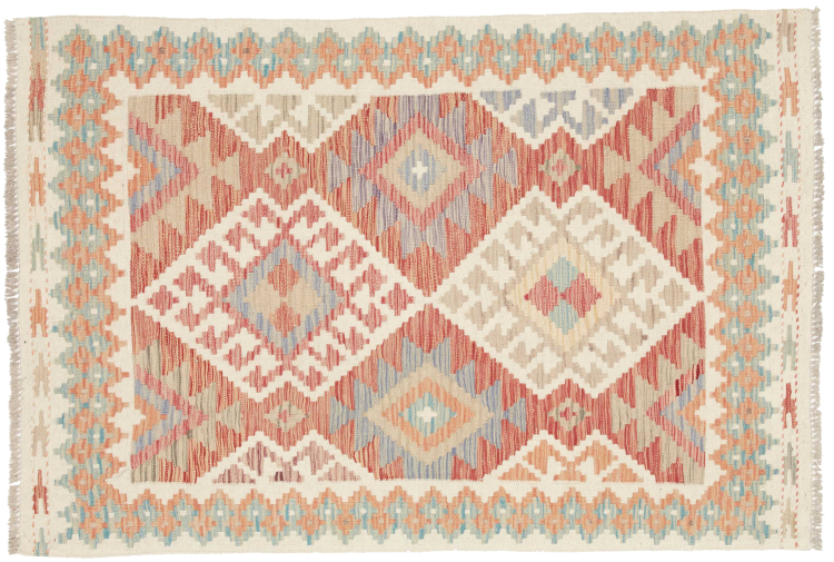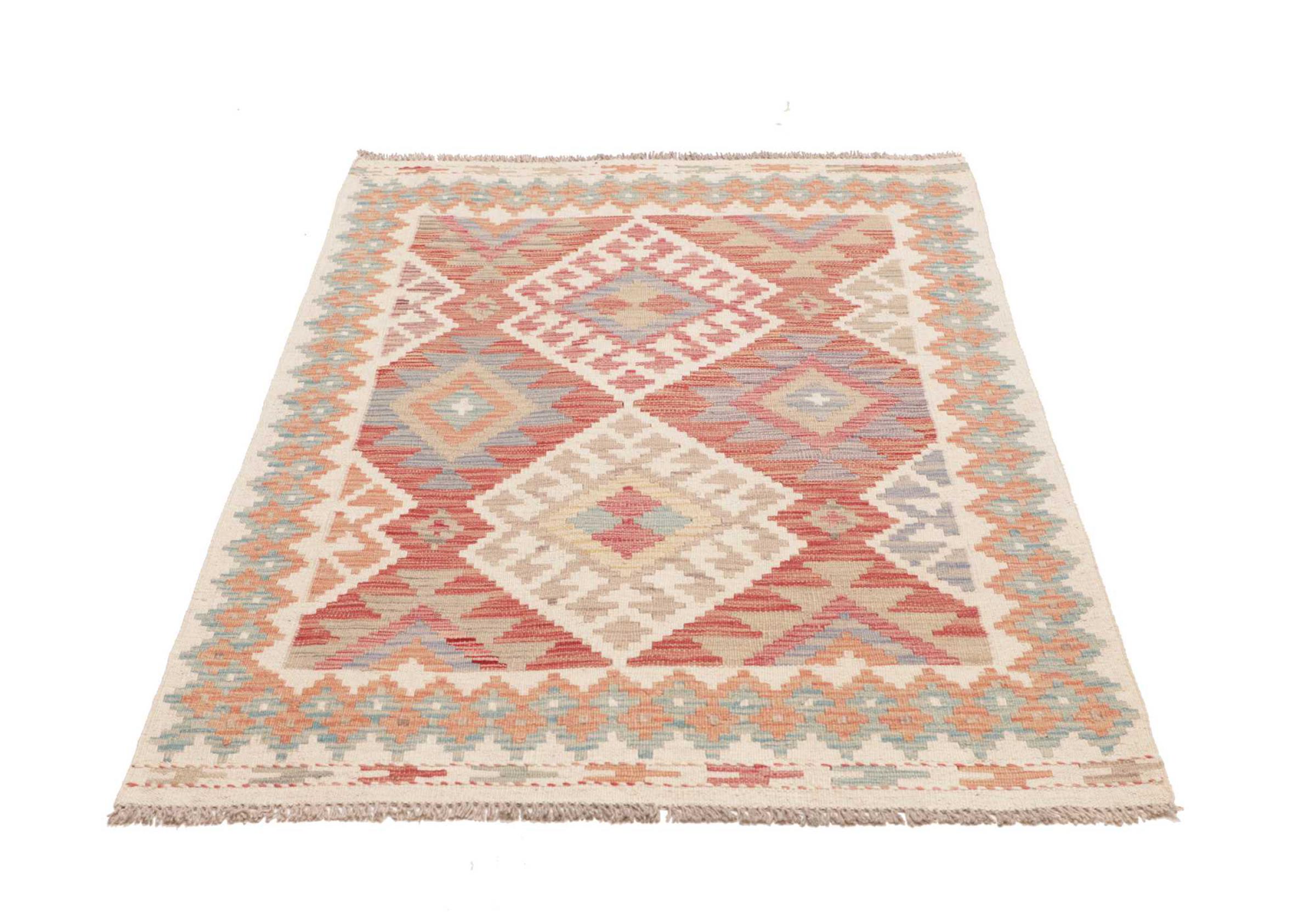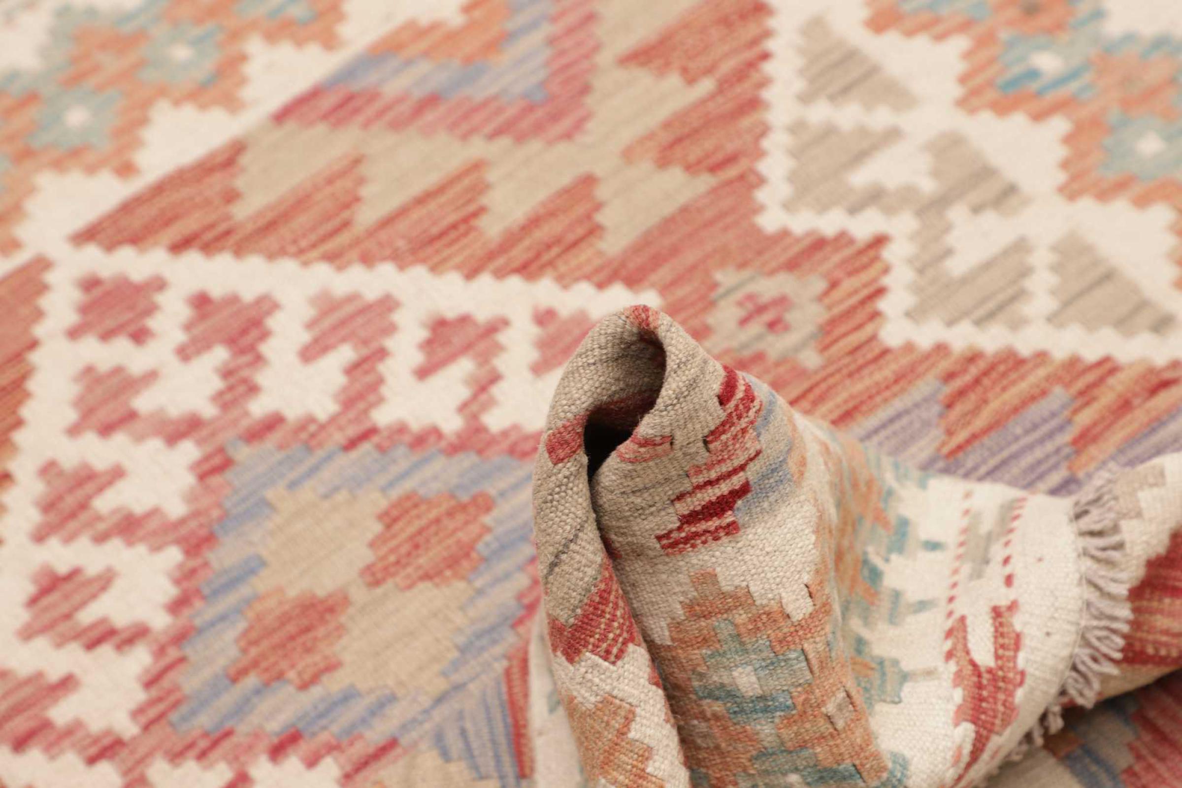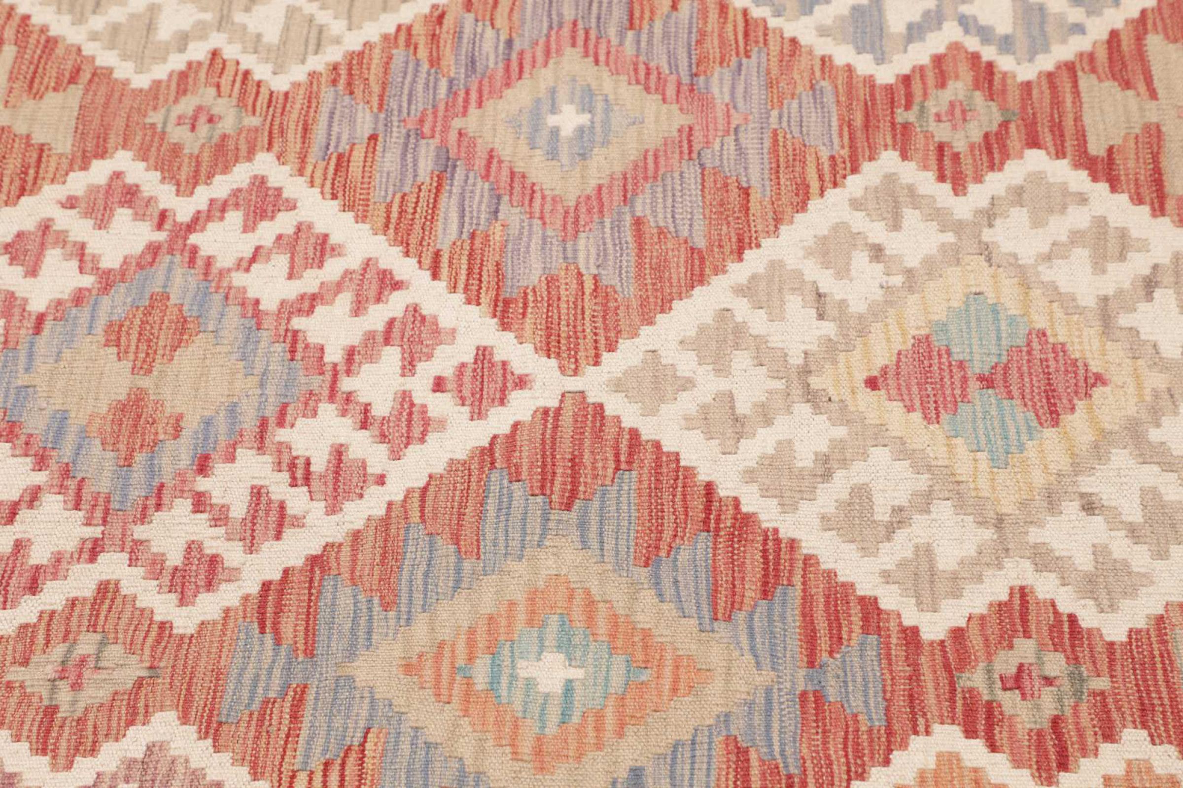 This handwoven Kilim Afghan is a wonderful and unique piece of art. Hard to believe that these modern colours and patterns have already been used centuries ago. This carpet has been woven by hand in old tradition in Afghanistan. It delivers a portion of contemporary history, which you won't find in this specific design a second time. It consists of high-grade natural wool and gives your home a personalised touch.