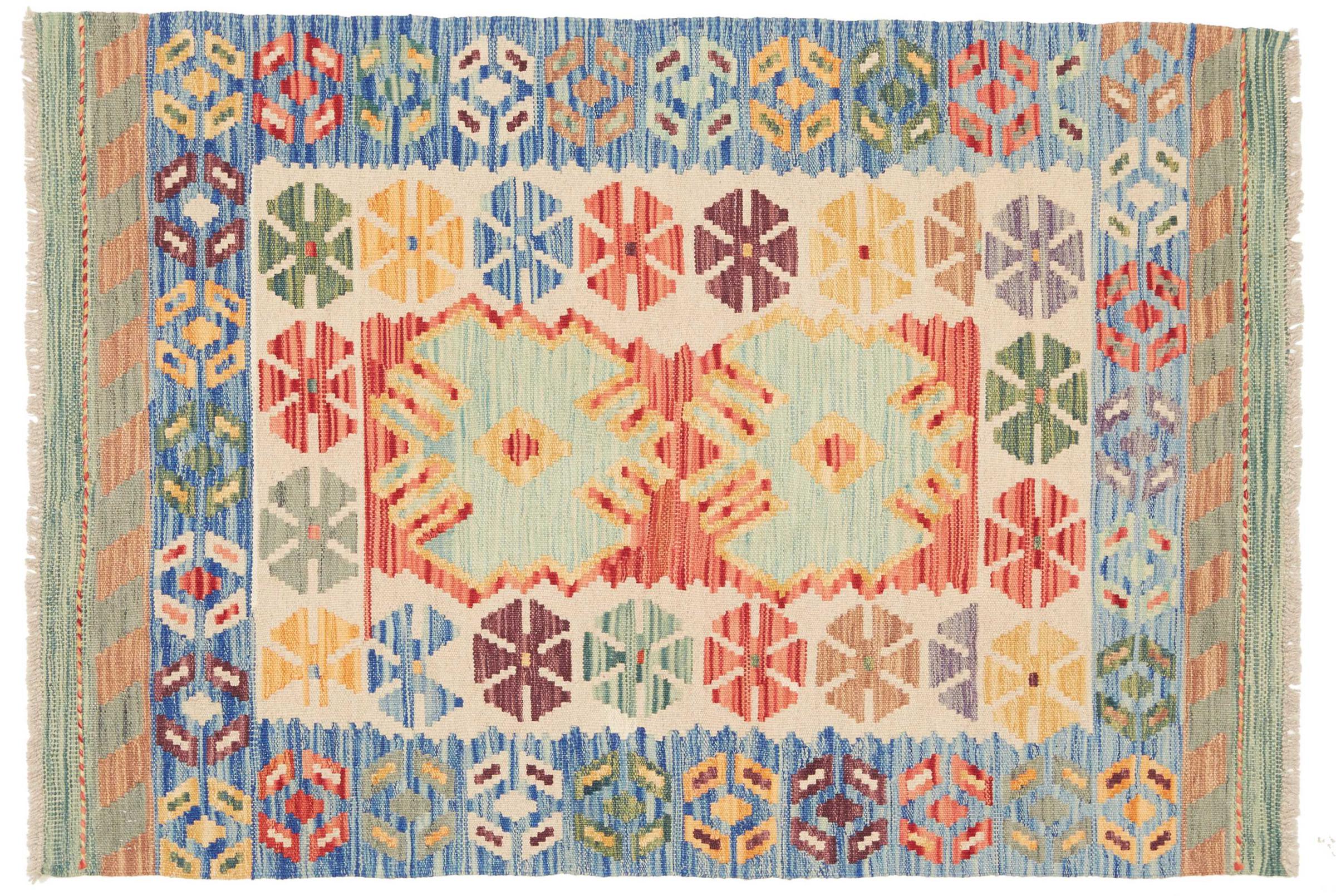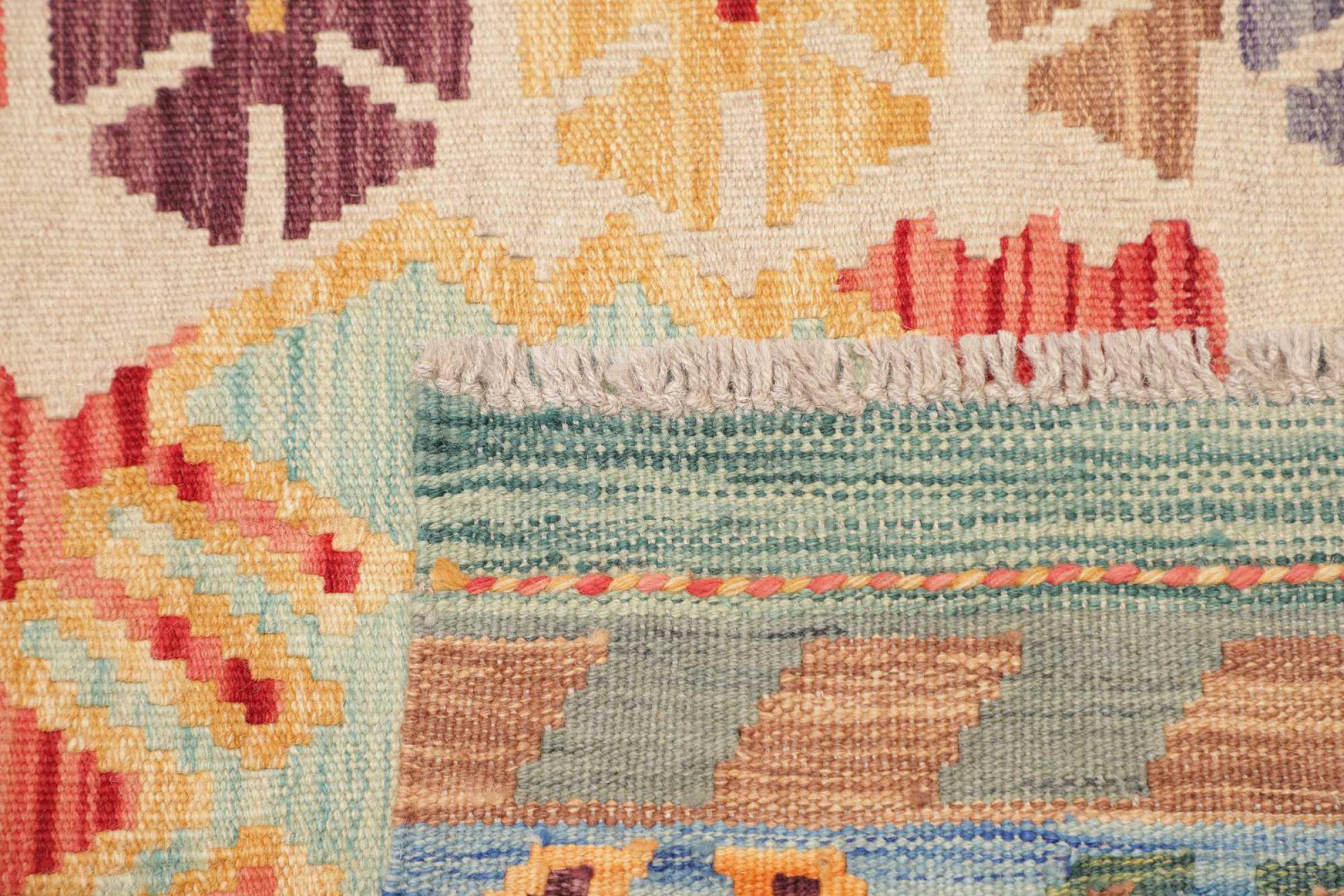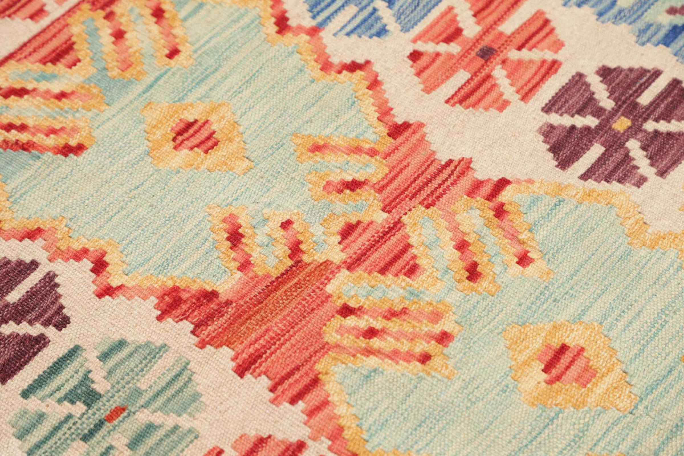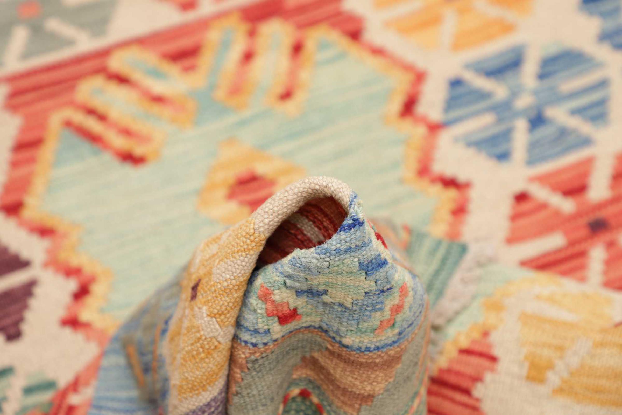 This handwoven Kilim Afghan is a wonderful and unique piece of art. Hard to believe that these modern colours and patterns have already been used centuries ago. This carpet has been woven by hand in old tradition in Afghanistan. It delivers a portion of contemporary history, which you won't find in this specific design a second time. It consists of high-grade natural wool and gives your home a personalised touch.