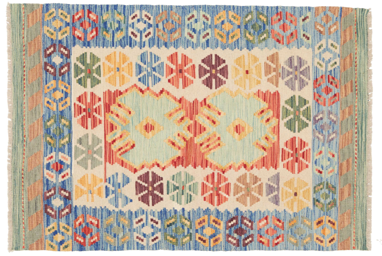 These kilim rugs show a decisive difference to hand-knotted rugs - they are woven by hand. Thus, they do not have a high pile of wool and are often flatter and rougher than knotted wool rugs. Their making is less elaborate and so they are usually much more affordable. As an advantage, kilim rugs are also much lighter and can be laid out from the front and back side. Hand-woven kilims originally come from the former Persia and are now also often made in Afghanistan. They have rather simple, straightforward patterns, which are determined by their weaving technique.