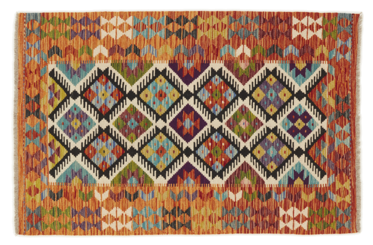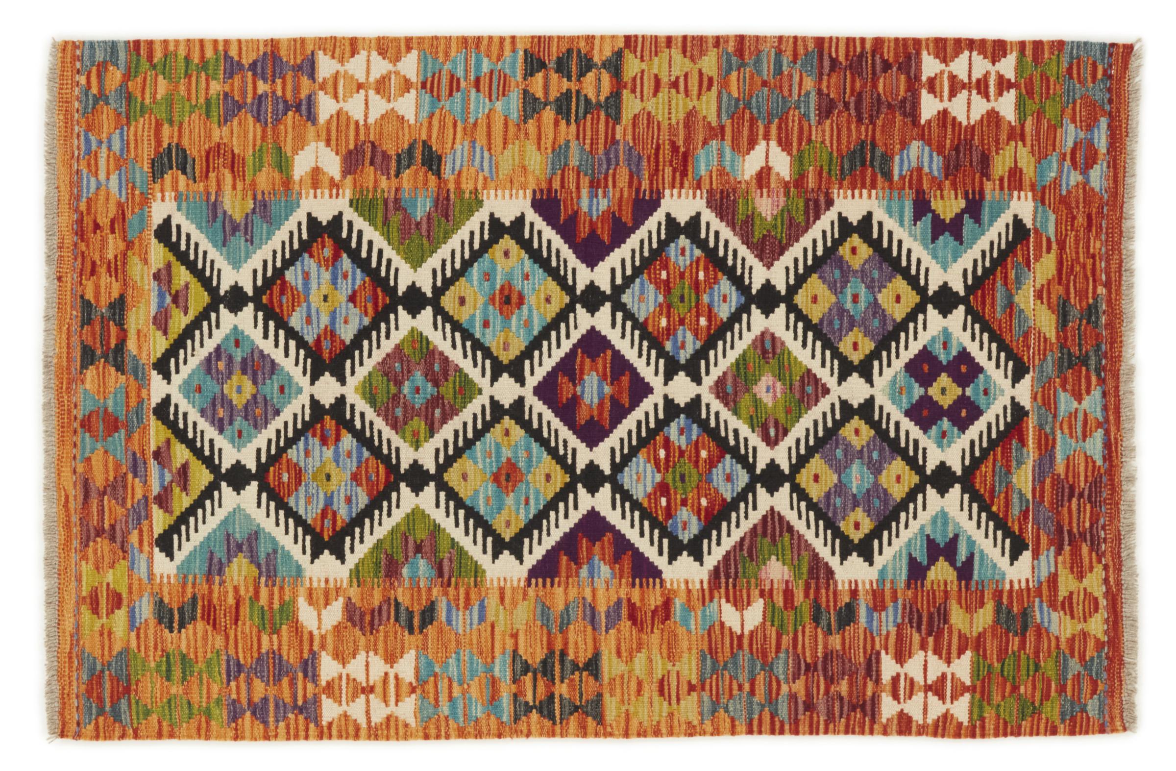 This handwoven Kilim Afghan is a wonderful and unique piece of art. Hard to believe that these modern colours and patterns have already been used centuries ago. This carpet has been woven by hand in old tradition in Afghanistan. It delivers a portion of contemporary history, which you won't find in this specific design a second time. It consists of high-grade natural wool and gives your home a personalised touch.