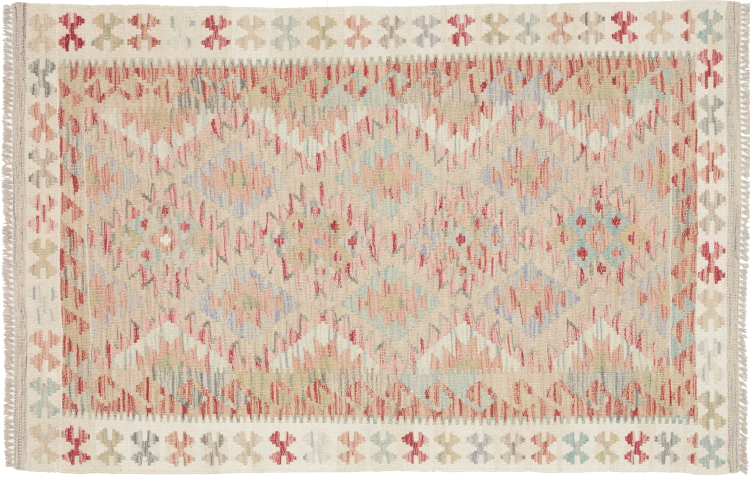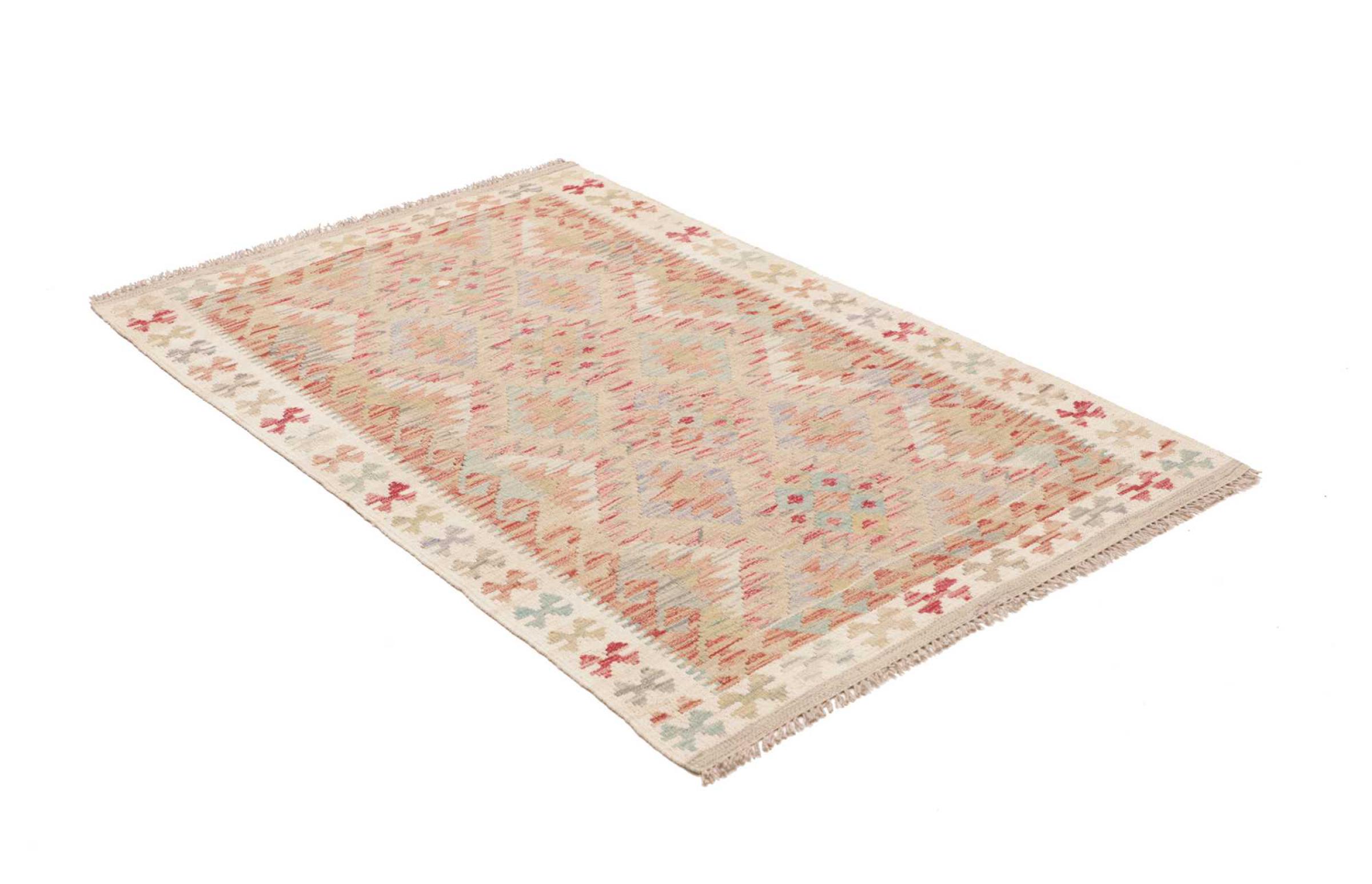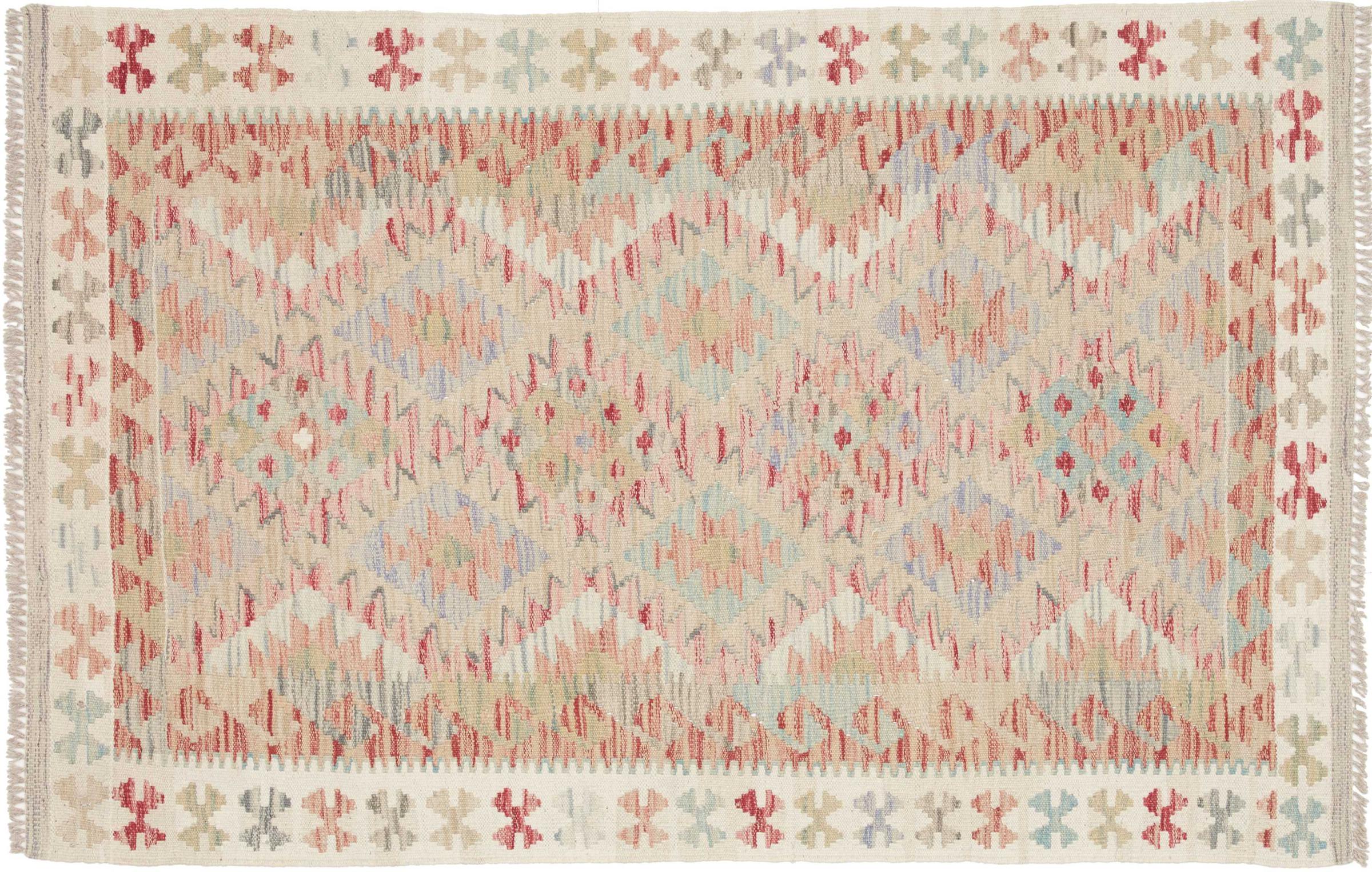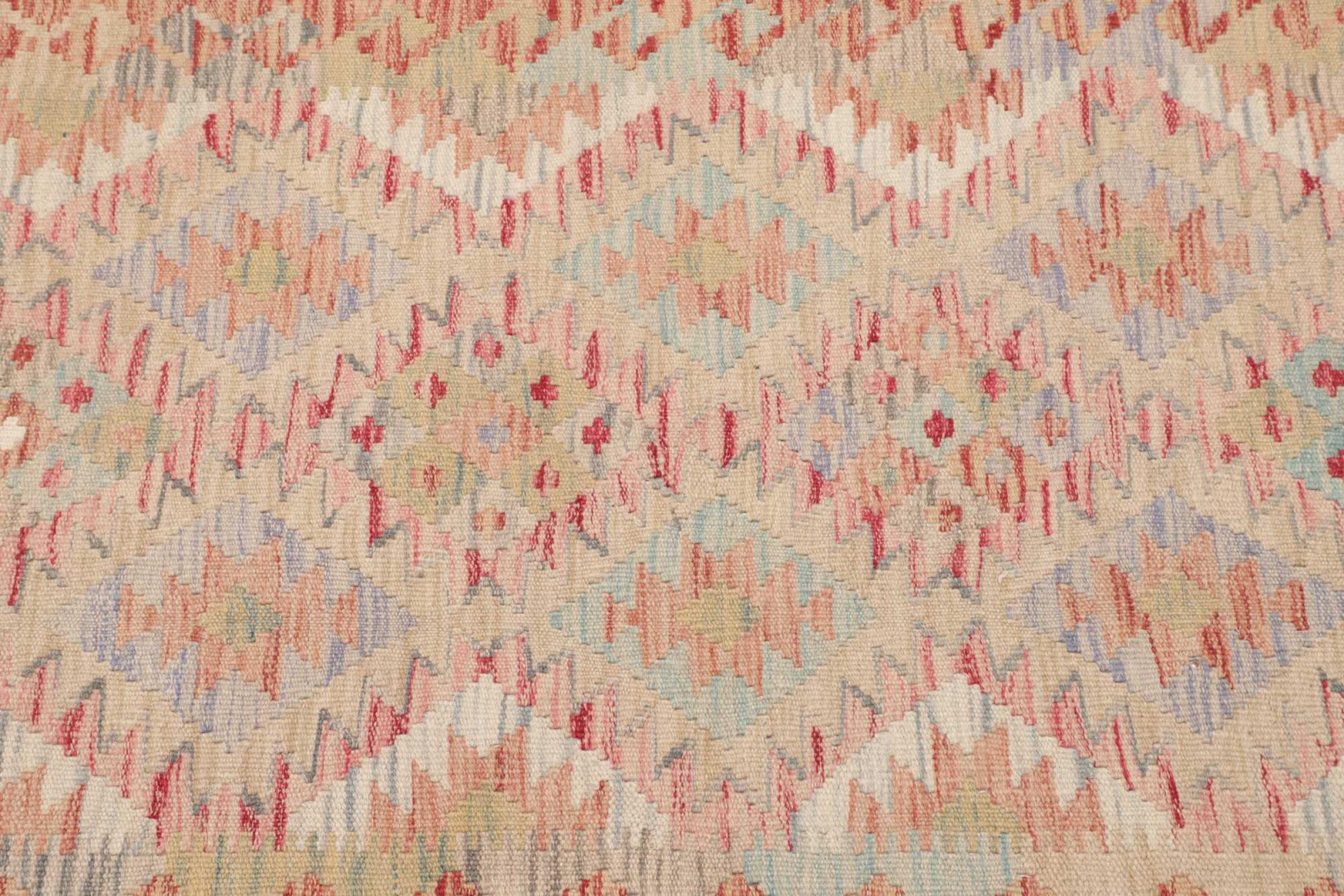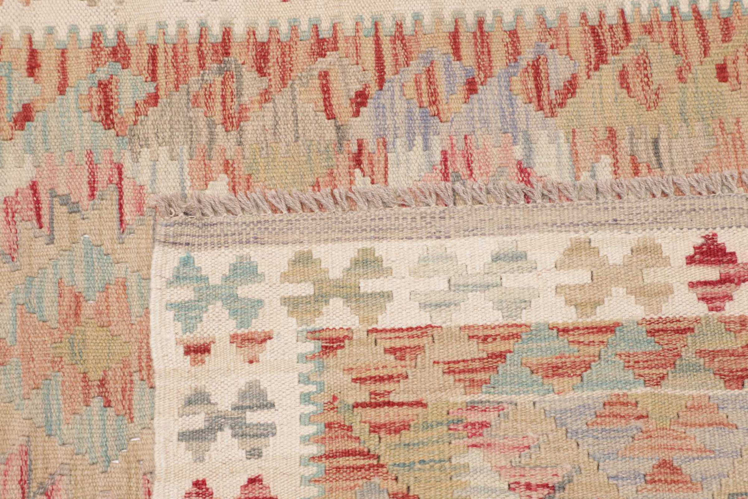 This handwoven Kilim Afghan is a wonderful and unique piece of art. Hard to believe that these modern colours and patterns have already been used centuries ago. This carpet has been woven by hand in old tradition in Afghanistan. It delivers a portion of contemporary history, which you won't find in this specific design a second time. It consists of high-grade natural wool and gives your home a personalised touch.