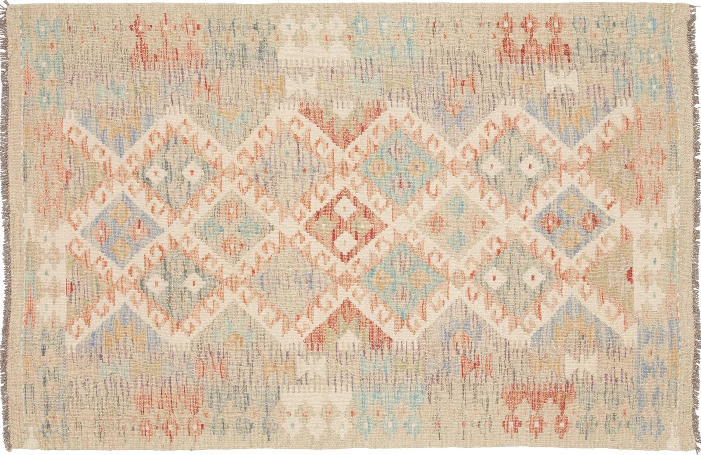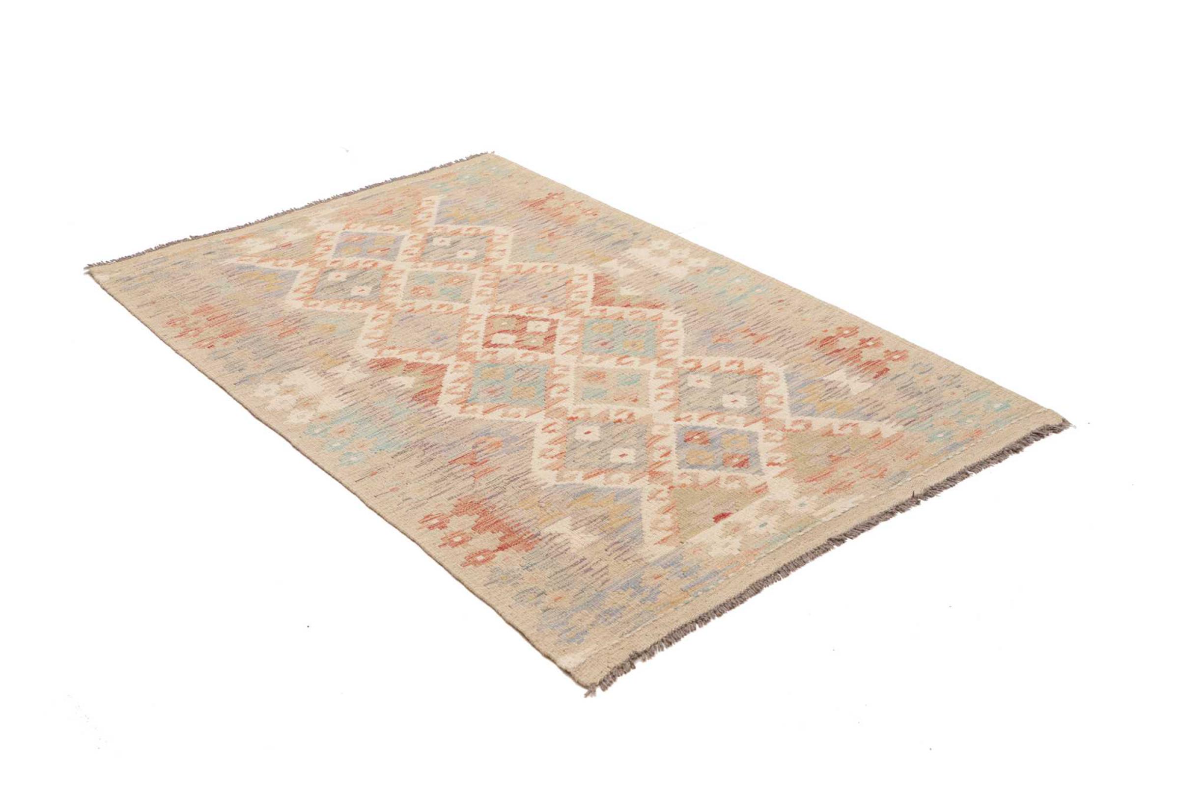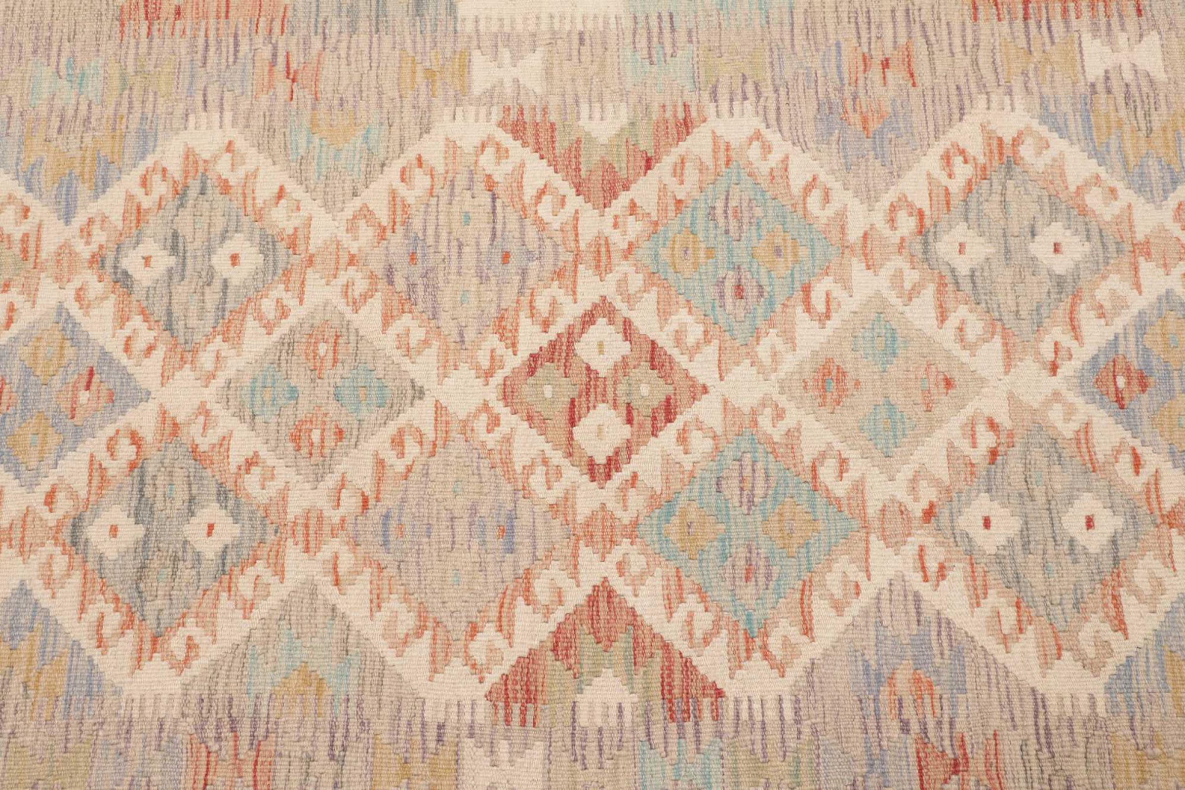 This handwoven Kilim Afghan is a wonderful and unique piece of art. Hard to believe that these modern colours and patterns have already been used centuries ago. This carpet has been woven by hand in old tradition in Afghanistan. It delivers a portion of contemporary history, which you won't find in this specific design a second time. It consists of high-grade natural wool and gives your home a personalised touch.