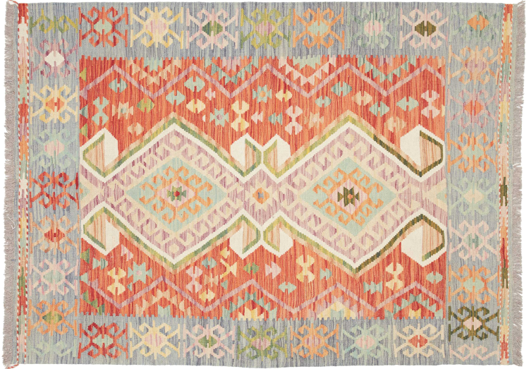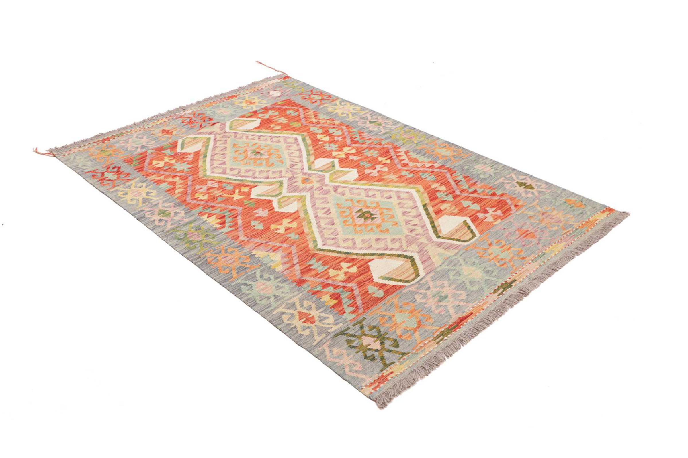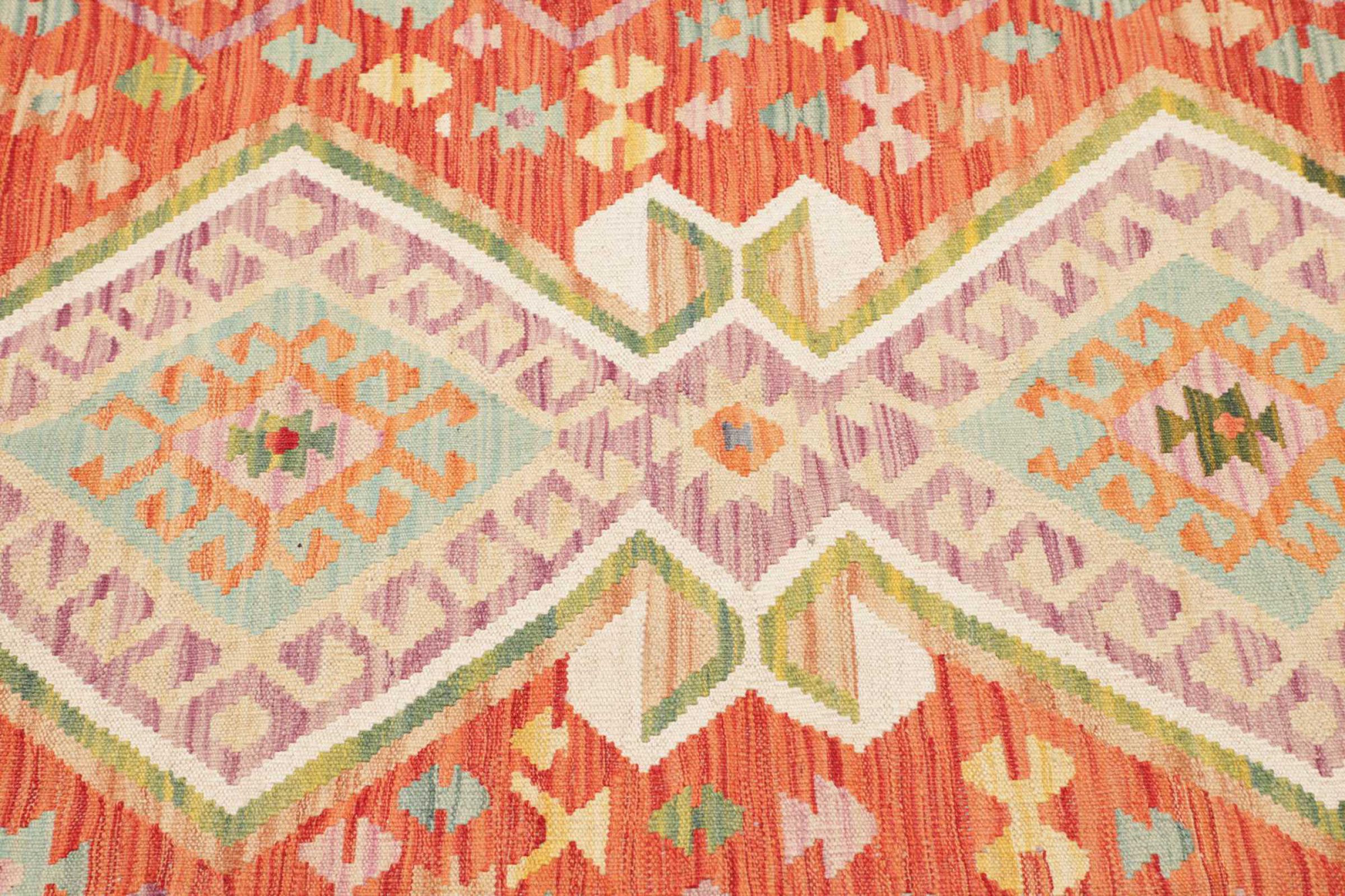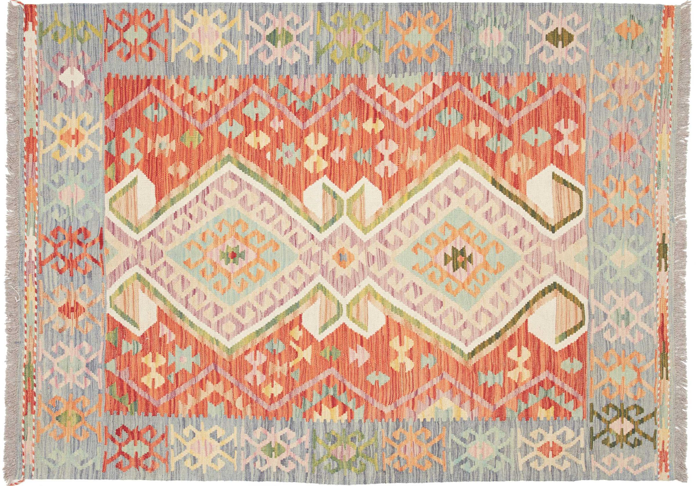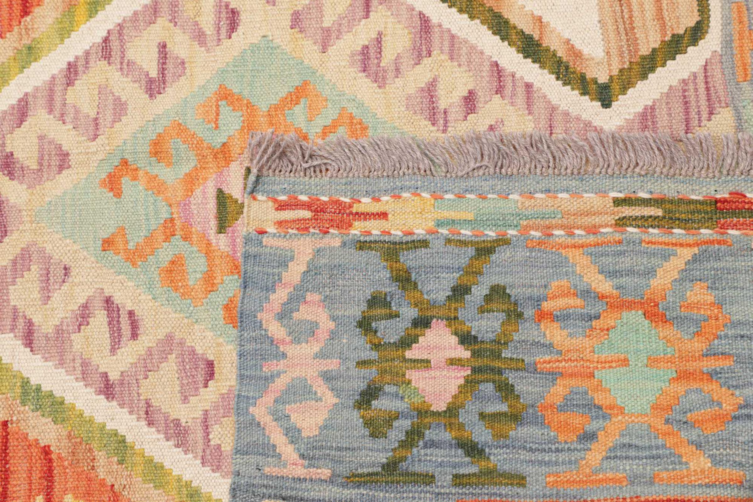 This handwoven Kilim Afghan is a wonderful and unique piece of art. Hard to believe that these modern colours and patterns have already been used centuries ago. This carpet has been woven by hand in old tradition in Afghanistan. It delivers a portion of contemporary history, which you won't find in this specific design a second time. It consists of high-grade natural wool and gives your home a personalised touch.