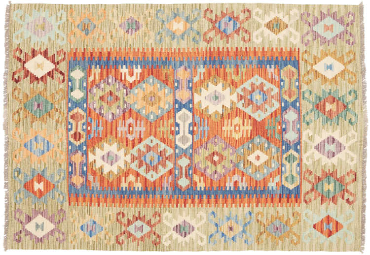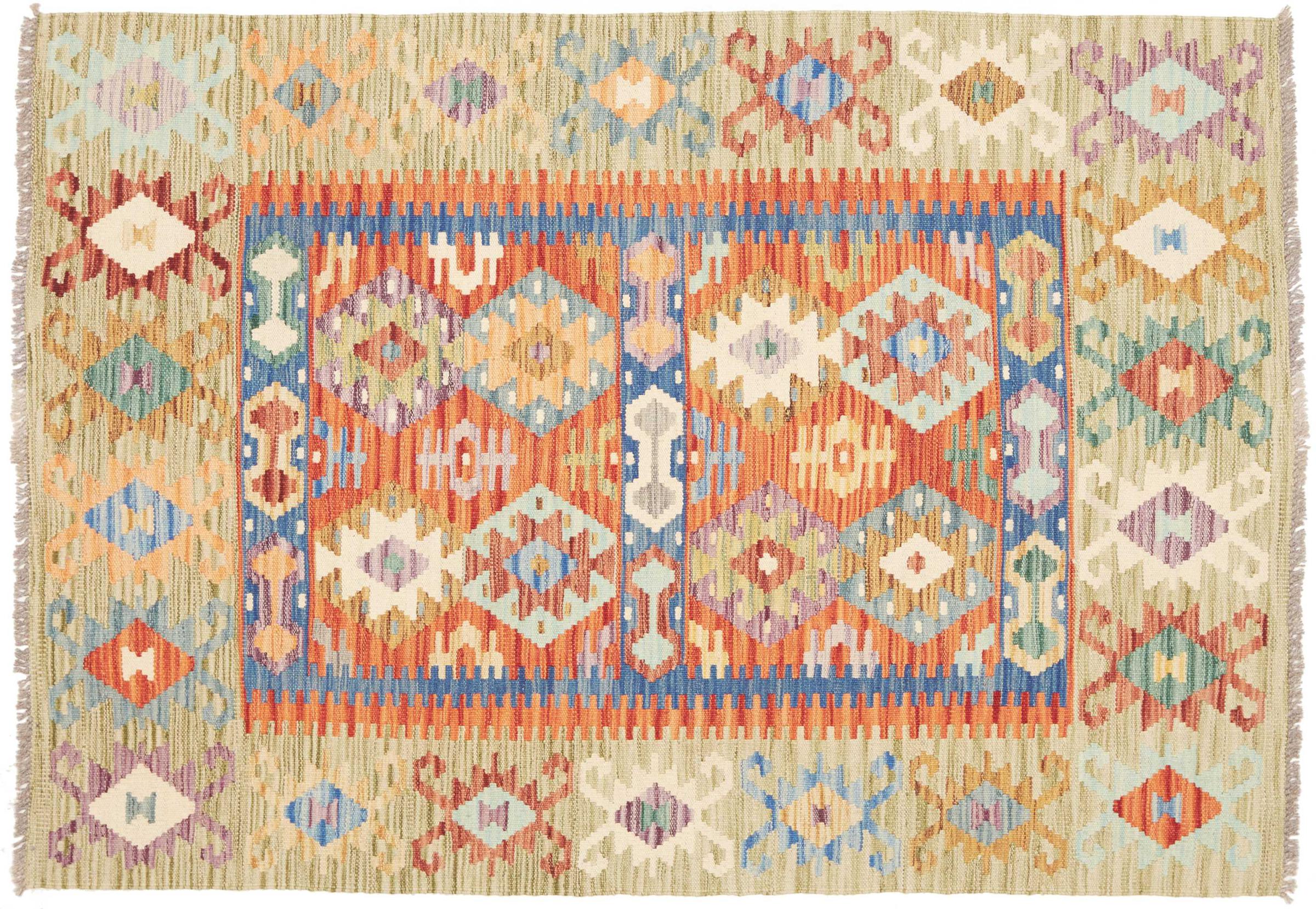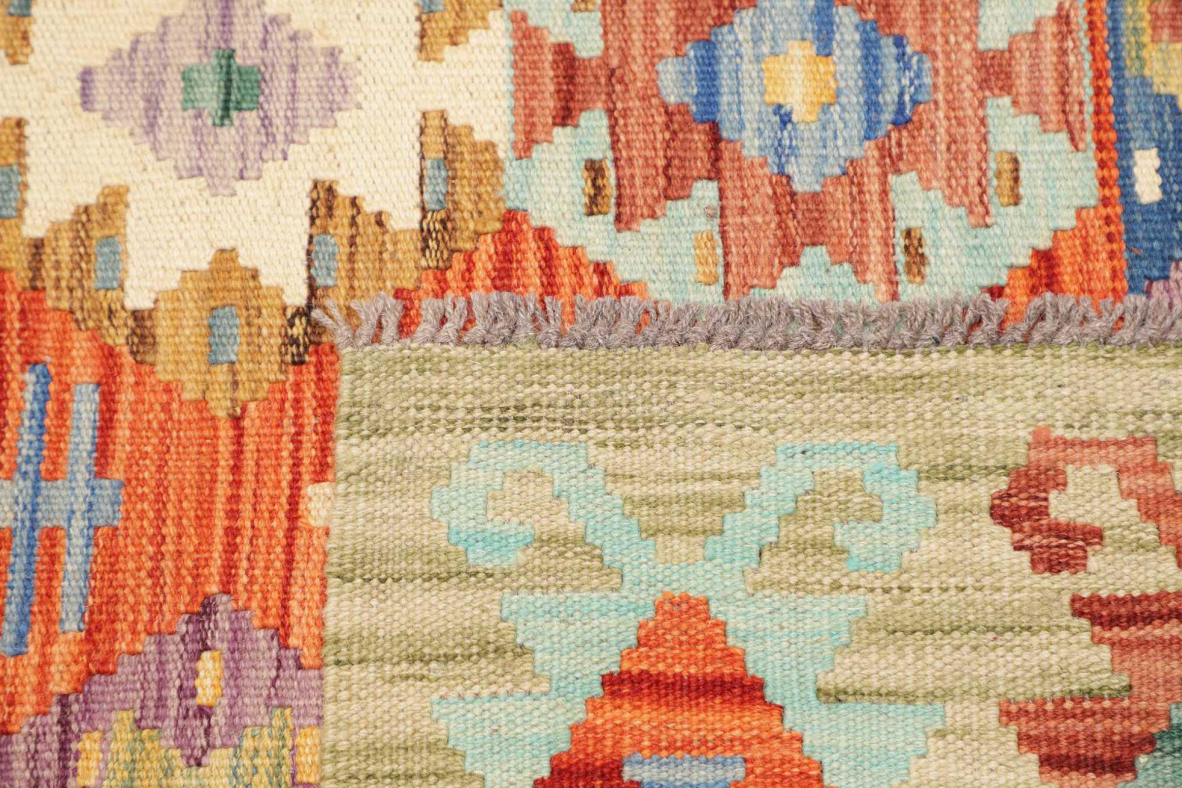 This handwoven Kilim Afghan is a wonderful and unique piece of art. Hard to believe that these modern colours and patterns have already been used centuries ago. This carpet has been woven by hand in old tradition in Afghanistan. It delivers a portion of contemporary history, which you won't find in this specific design a second time. It consists of high-grade natural wool and gives your home a personalised touch.