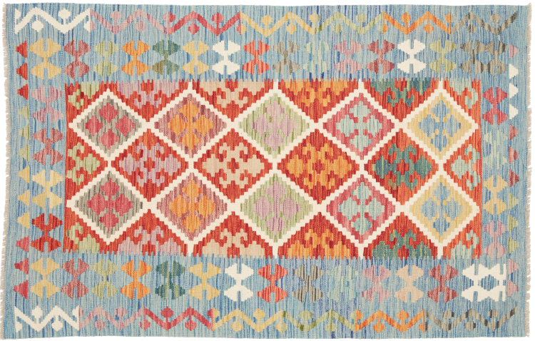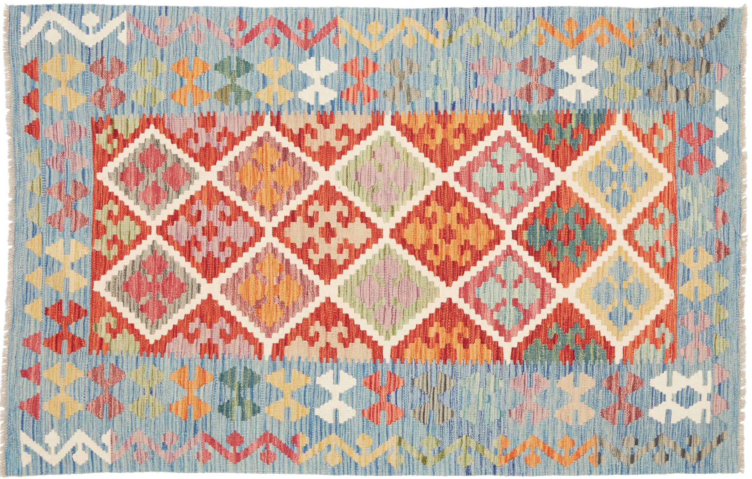 This handwoven Kilim Afghan is a wonderful and unique piece of art. Hard to believe that these modern colours and patterns have already been used centuries ago. This carpet has been woven by hand in old tradition in Afghanistan. It delivers a portion of contemporary history, which you won't find in this specific design a second time. It consists of high-grade natural wool and gives your home a personalised touch.