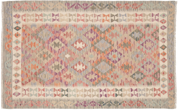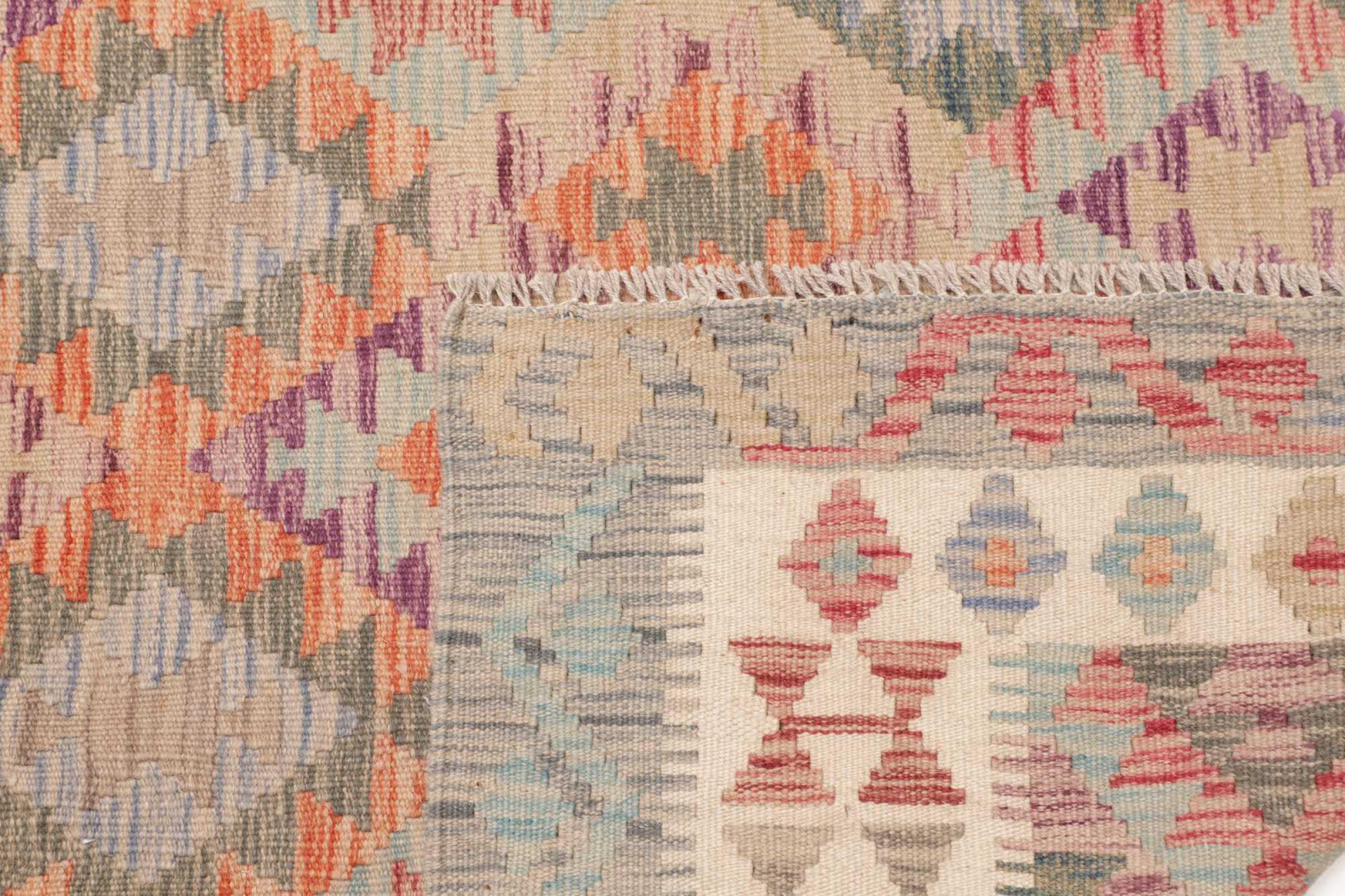 This handwoven Kilim Afghan is a wonderful and unique piece of art. Hard to believe that these modern colours and patterns have already been used centuries ago. This carpet has been woven by hand in old tradition in Afghanistan. It delivers a portion of contemporary history, which you won't find in this specific design a second time. It consists of high-grade natural wool and gives your home a personalised touch.