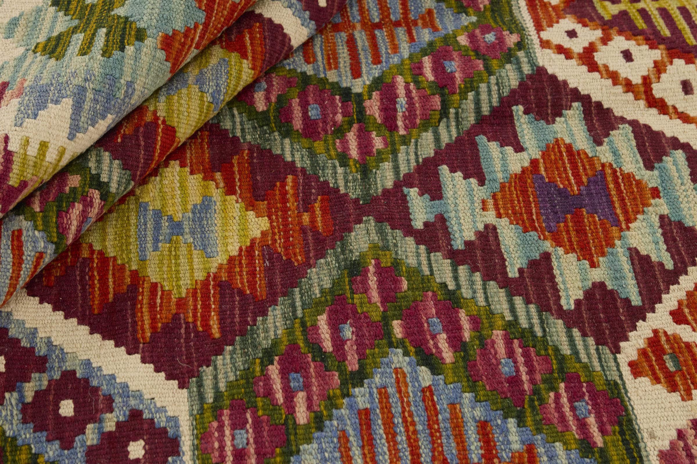 This handwoven Kilim Afghan is a wonderful and unique piece of art. Hard to believe that these modern colours and patterns have already been used centuries ago. This carpet has been woven by hand in old tradition in Afghanistan. It delivers a portion of contemporary history, which you won't find in this specific design a second time. It consists of high-grade natural wool and gives your home a personalised touch.