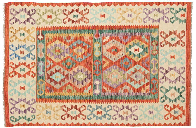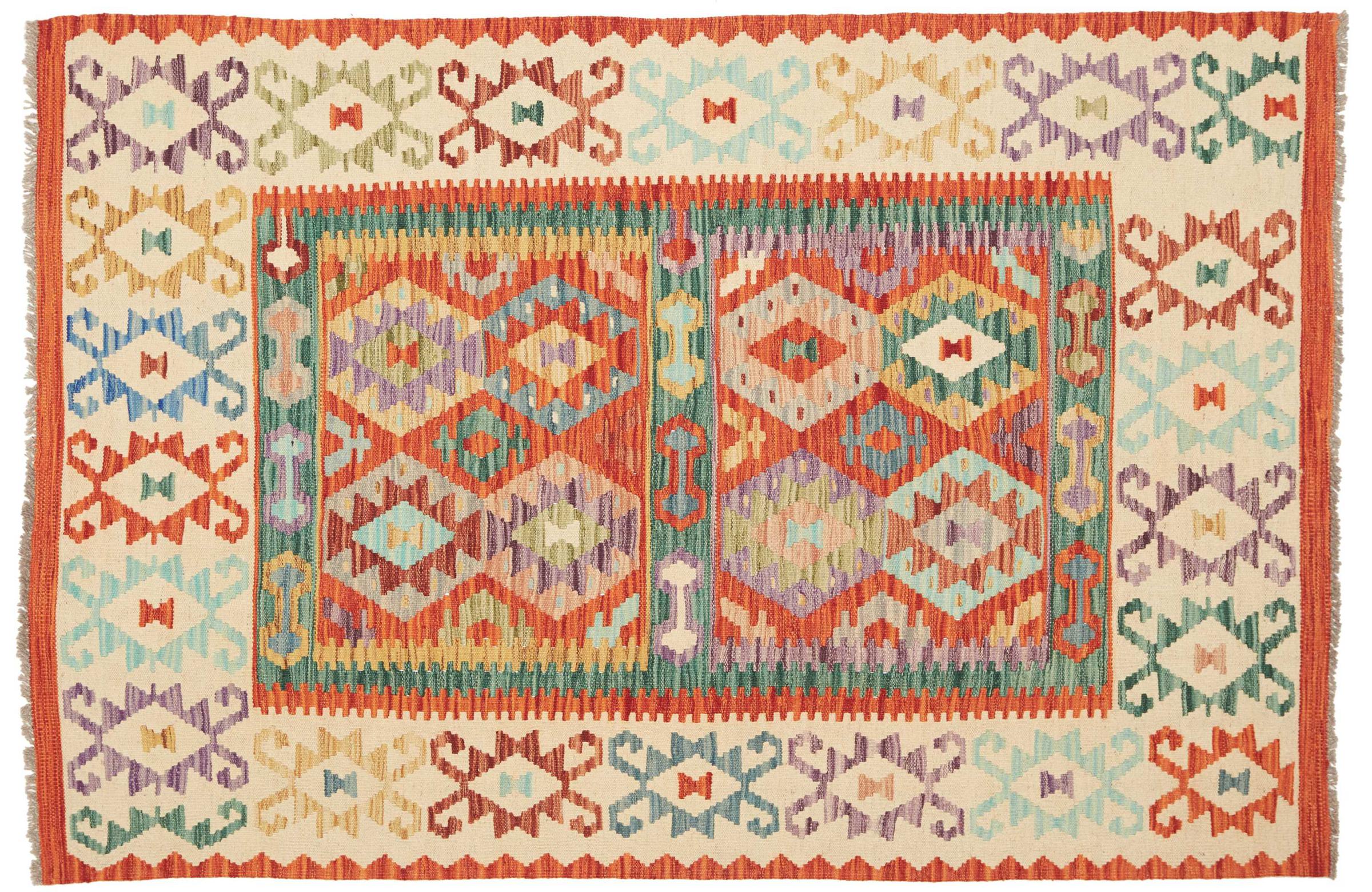 This handwoven Kilim Afghan is a wonderful and unique piece of art. Hard to believe that these modern colours and patterns have already been used centuries ago. This carpet has been woven by hand in old tradition in Afghanistan. It delivers a portion of contemporary history, which you won't find in this specific design a second time. It consists of high-grade natural wool and gives your home a personalised touch.