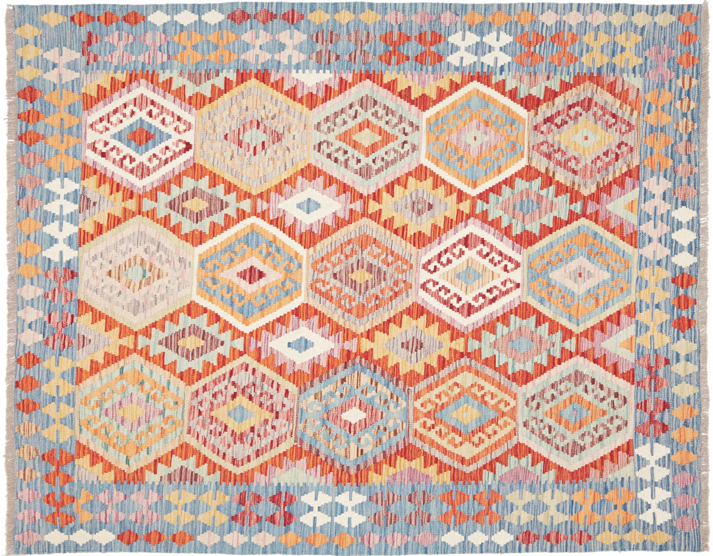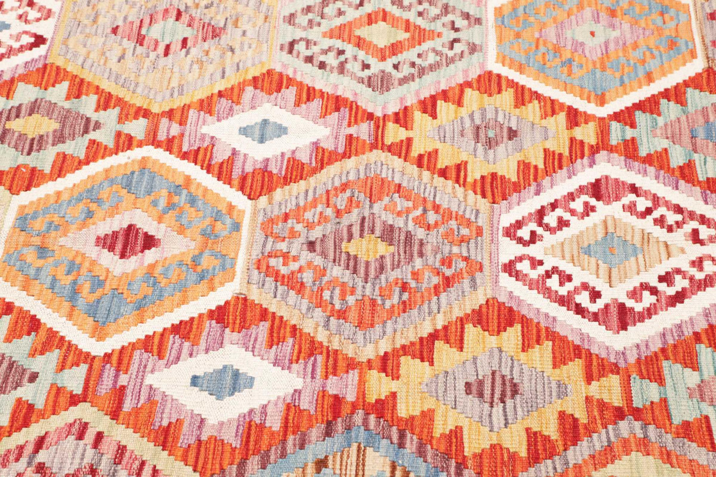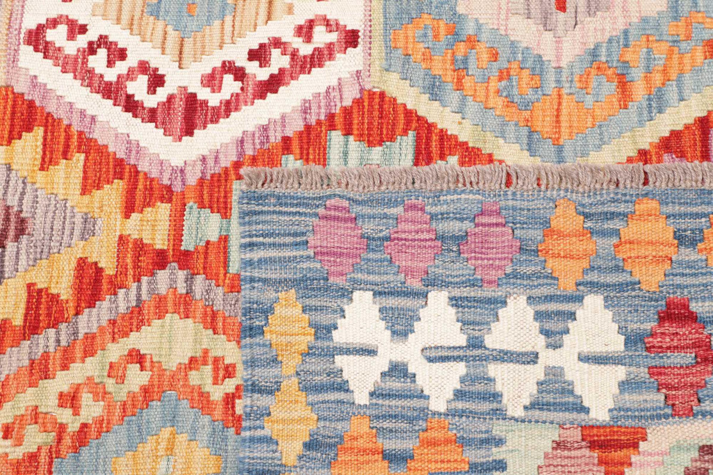 This handwoven Kilim Afghan is a wonderful and unique piece of art. Hard to believe that these modern colours and patterns have already been used centuries ago. This carpet has been woven by hand in old tradition in Afghanistan. It delivers a portion of contemporary history, which you won't find in this specific design a second time. It consists of high-grade natural wool and gives your home a personalised touch.
