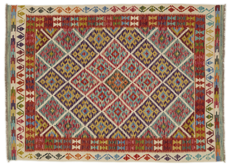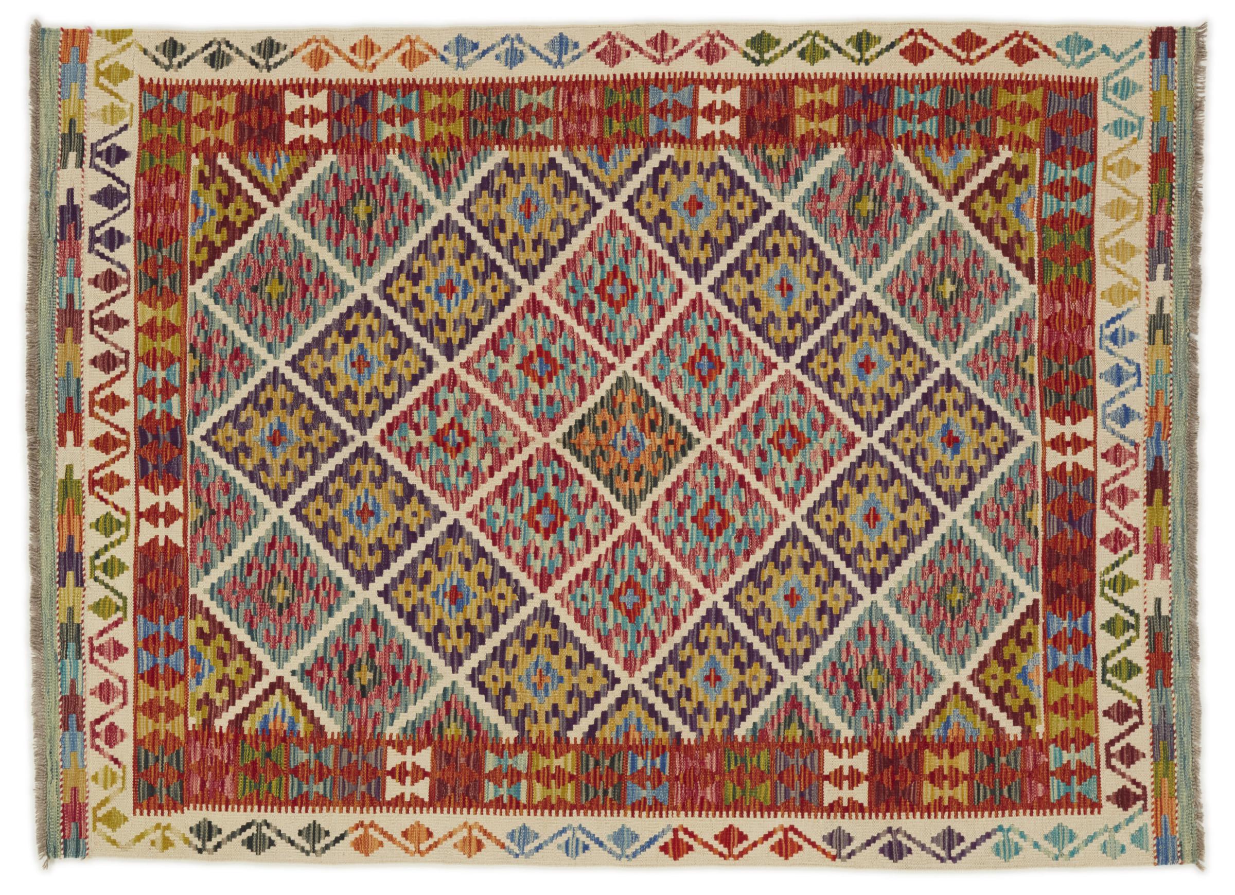 This handwoven Kilim Afghan is a wonderful and unique piece of art. Hard to believe that these modern colours and patterns have already been used centuries ago. This carpet has been woven by hand in old tradition in Afghanistan. It delivers a portion of contemporary history, which you won't find in this specific design a second time. It consists of high-grade natural wool and gives your home a personalised touch.
