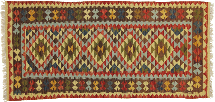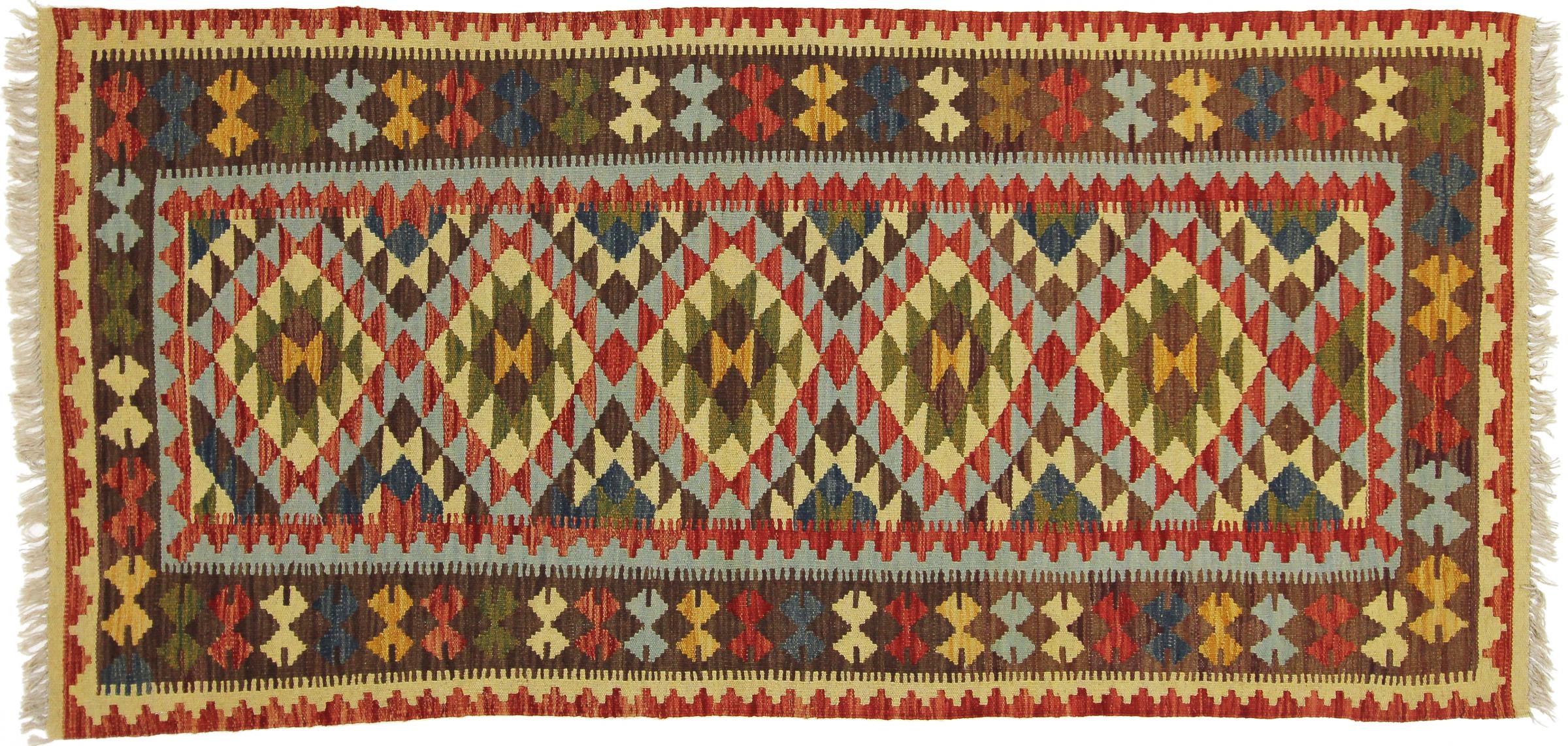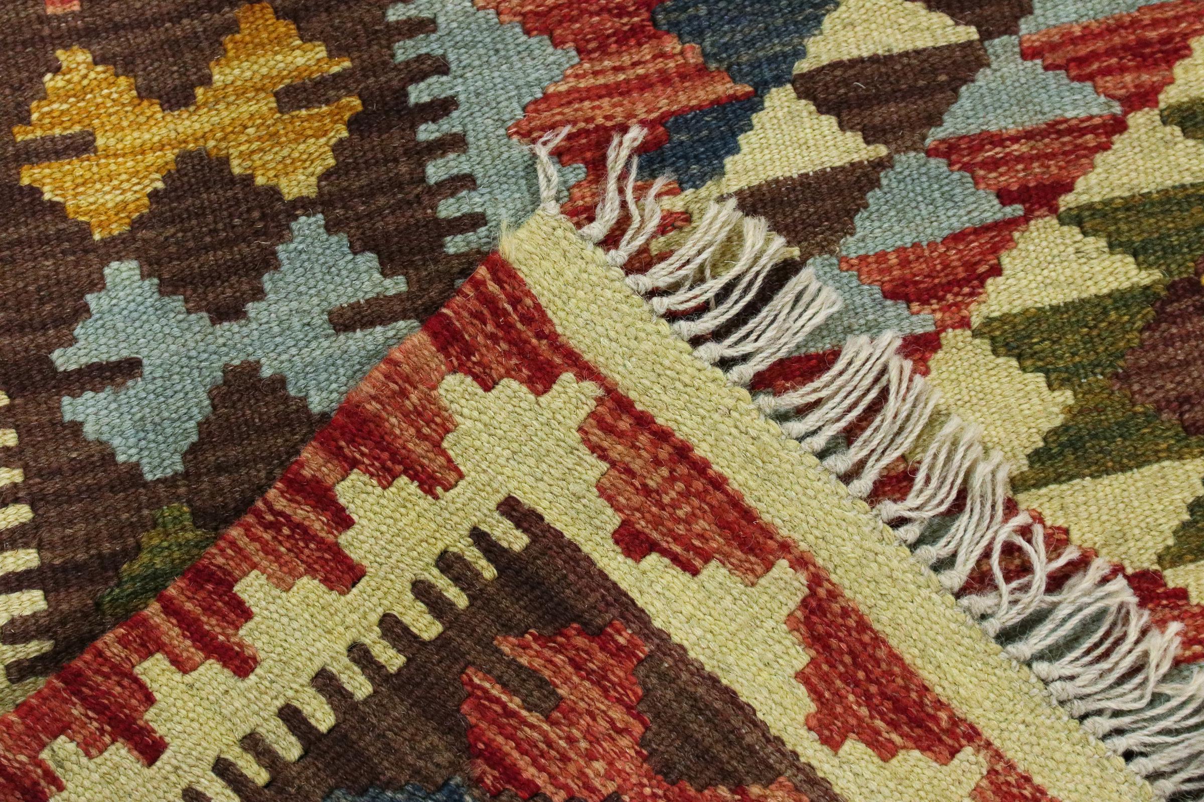 This handwoven Kilim Afghan is a wonderful and unique piece of art. Hard to believe that these modern colours and patterns have already been used centuries ago. This carpet has been woven by hand in old tradition in Afghanistan. It delivers a portion of contemporary history, which you won't find in this specific design a second time. It consists of high-grade natural wool and gives your home a personalised touch.