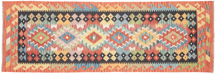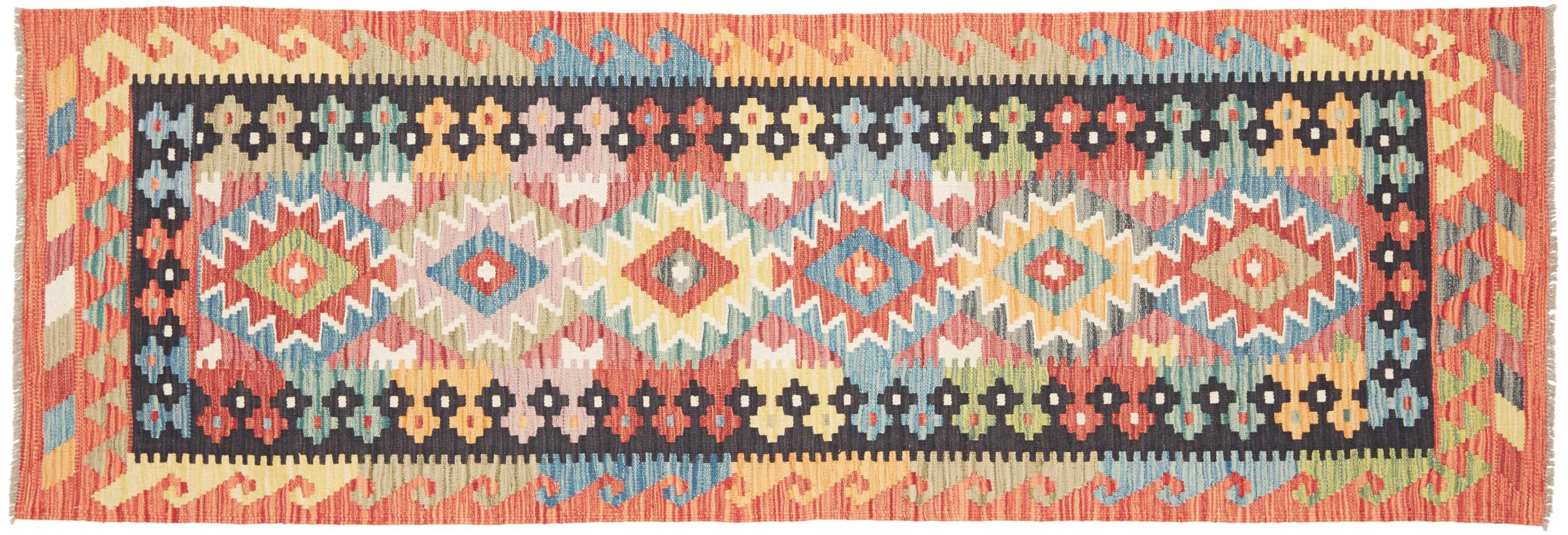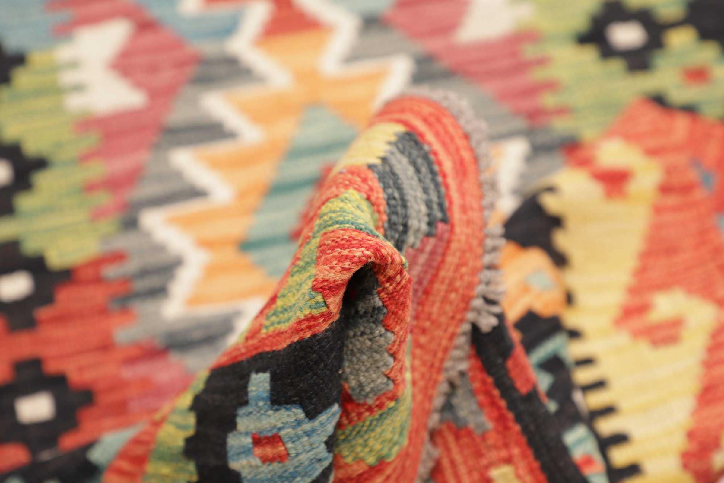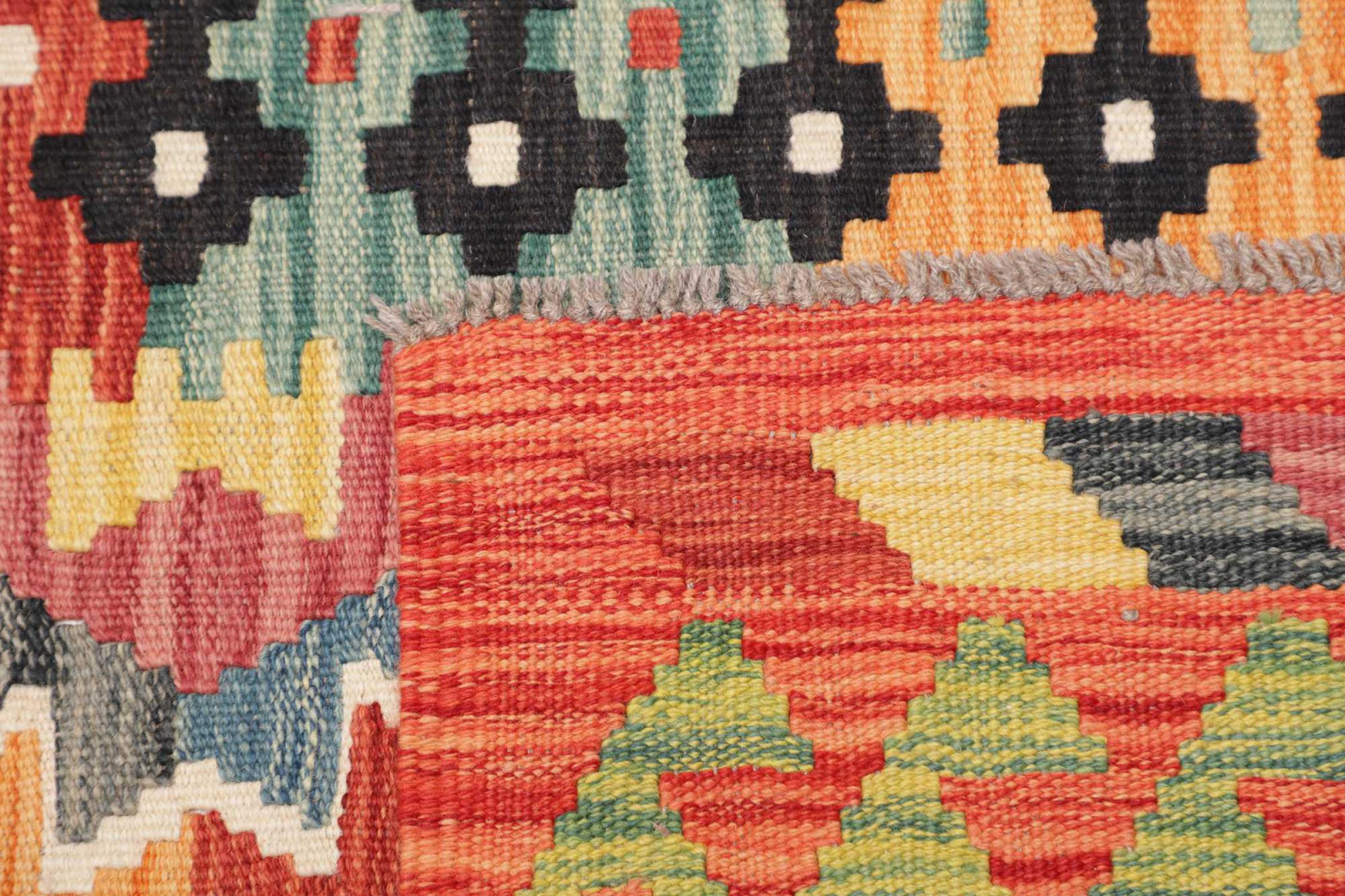 This handwoven Kilim Afghan is a wonderful and unique piece of art. Hard to believe that these modern colours and patterns have already been used centuries ago. This carpet has been woven by hand in old tradition in Afghanistan. It delivers a portion of contemporary history, which you won't find in this specific design a second time. It consists of high-grade natural wool and gives your home a personalised touch.