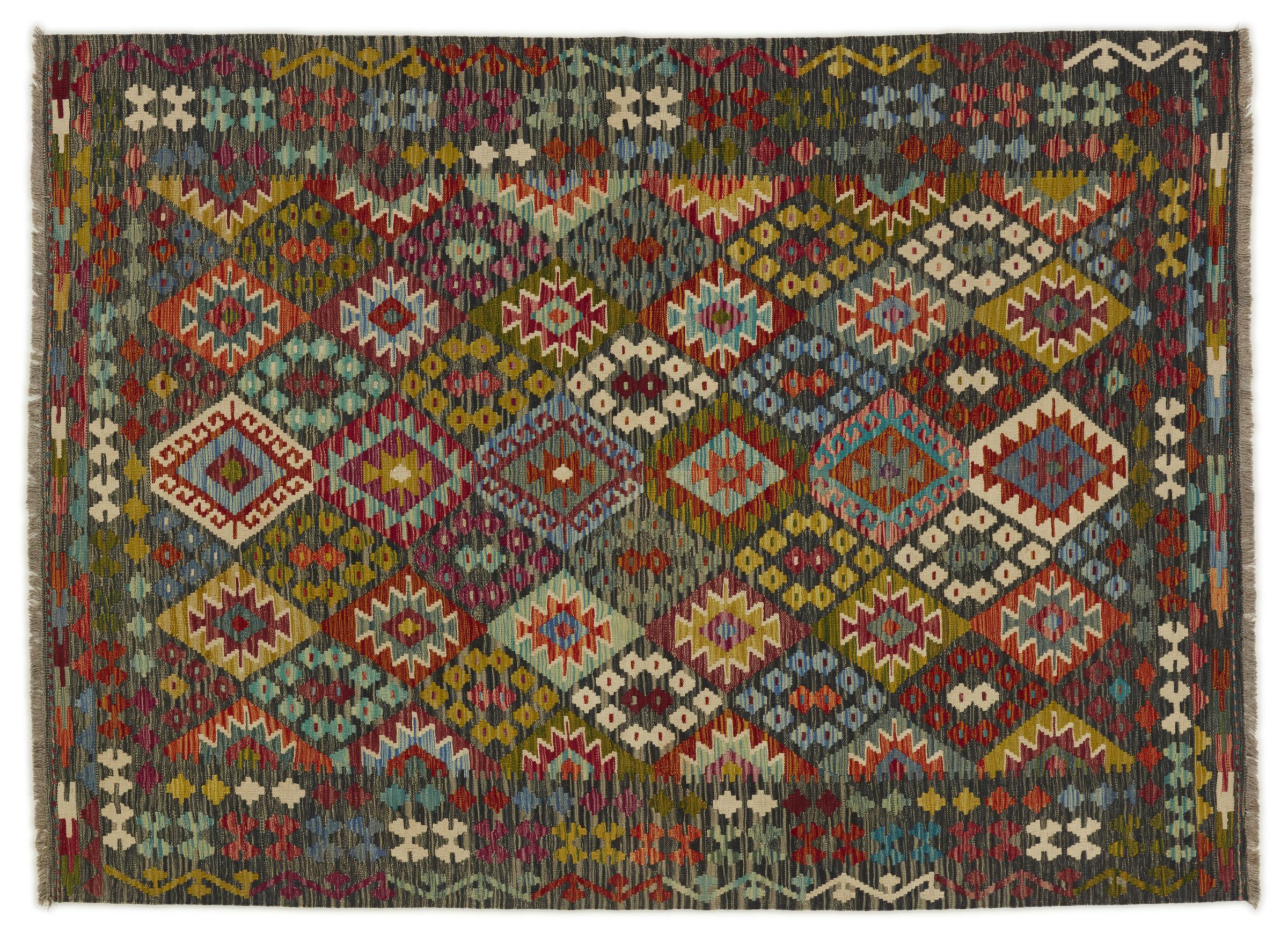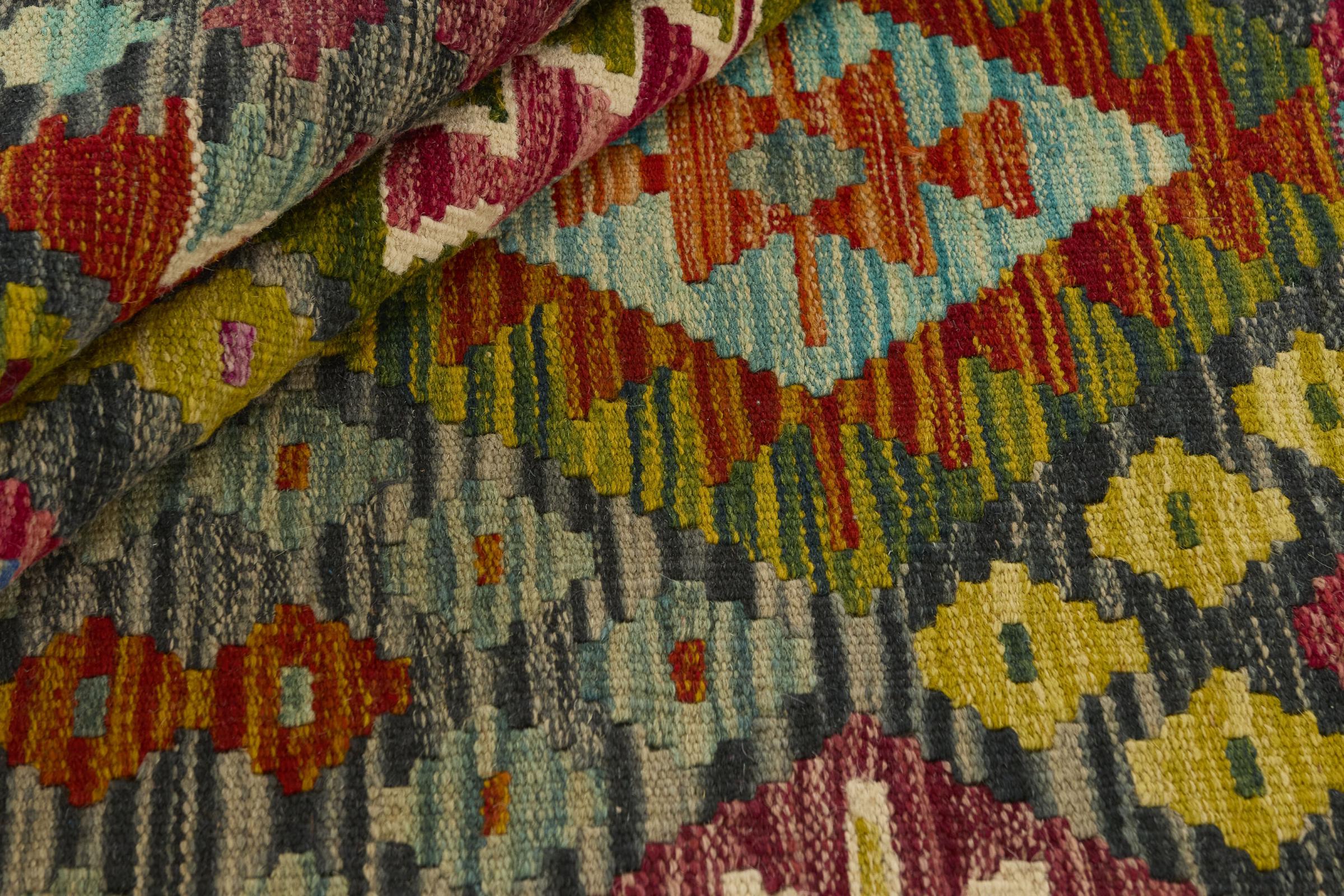 This handwoven Kilim Afghan is a wonderful and unique piece of art. Hard to believe that these modern colours and patterns have already been used centuries ago. This carpet has been woven by hand in old tradition in Afghanistan. It delivers a portion of contemporary history, which you won't find in this specific design a second time. It consists of high-grade natural wool and gives your home a personalised touch.