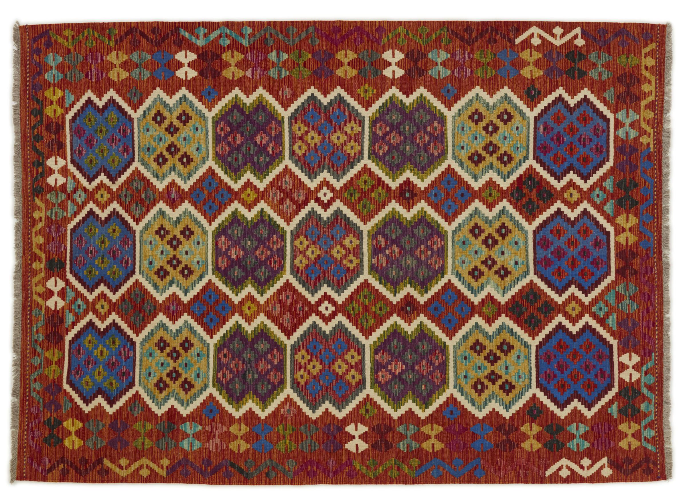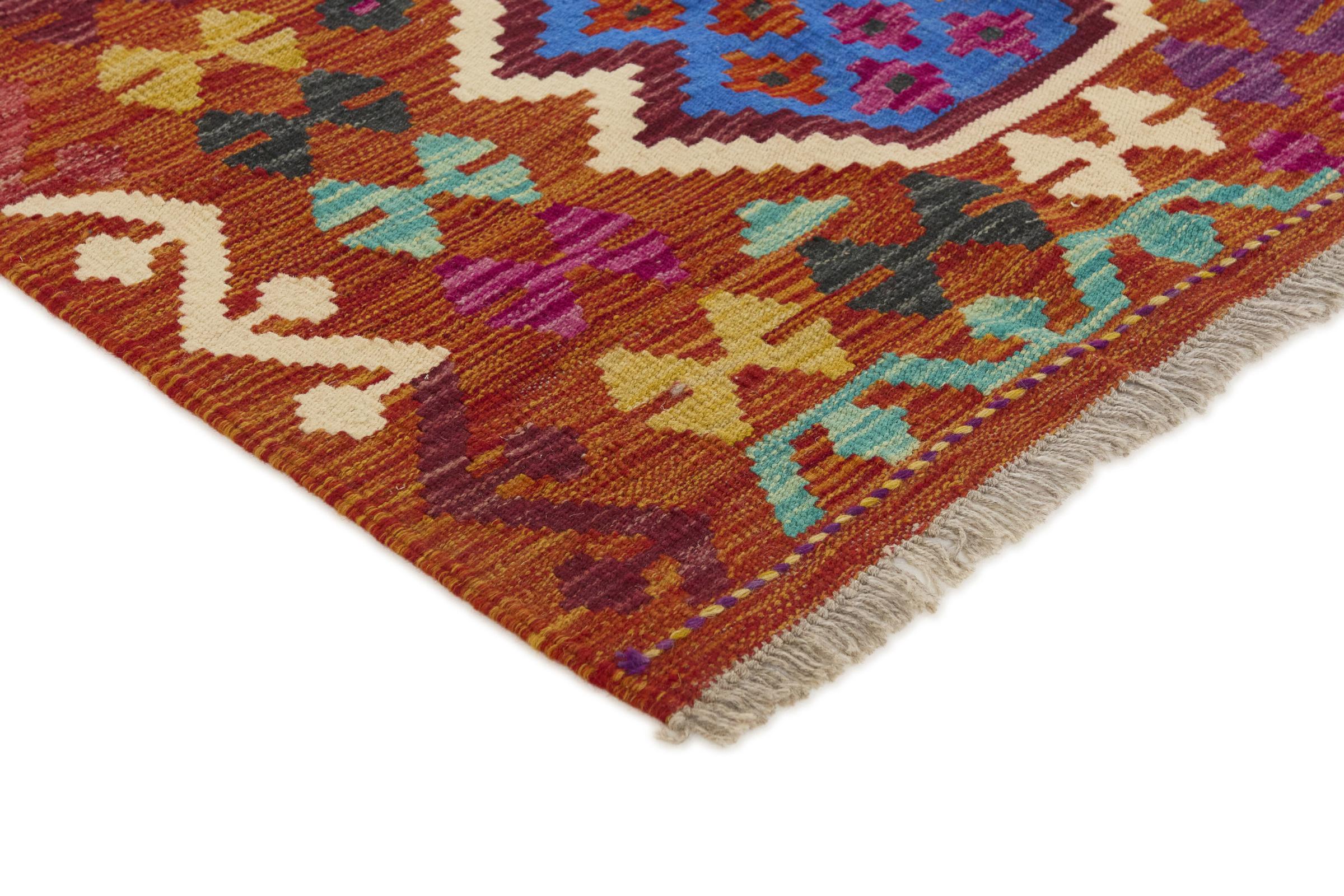 This handwoven Kilim Afghan is a wonderful and unique piece of art. Hard to believe that these modern colours and patterns have already been used centuries ago. This carpet has been woven by hand in old tradition in Afghanistan. It delivers a portion of contemporary history, which you won't find in this specific design a second time. It consists of high-grade natural wool and gives your home a personalised touch.