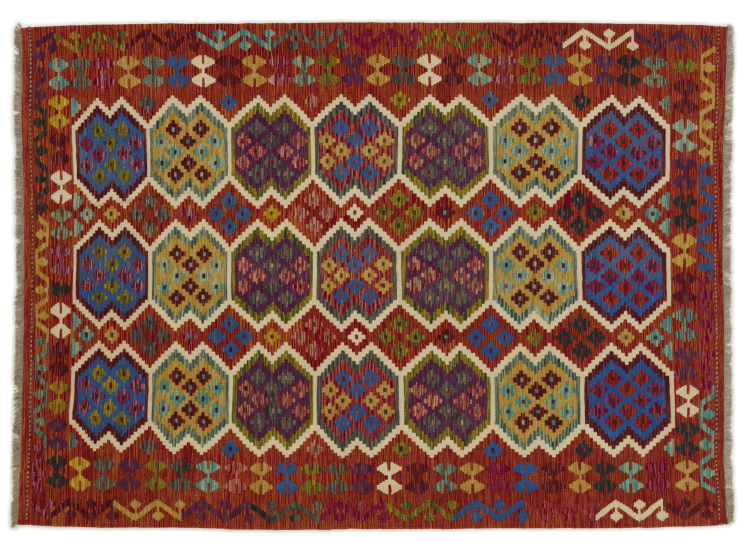 These kilim rugs show a decisive difference to hand-knotted rugs - they are woven by hand. Thus, they do not have a high pile of wool and are often flatter and rougher than knotted wool rugs. Their making is less elaborate and so they are usually much more affordable. As an advantage, kilim rugs are also much lighter and can be laid out from the front and back side. Hand-woven kilims originally come from the former Persia and are now also often made in Afghanistan. They have rather simple, straightforward patterns, which are determined by their weaving technique.