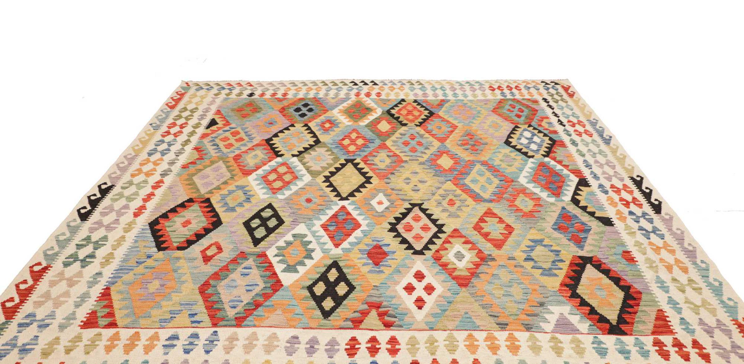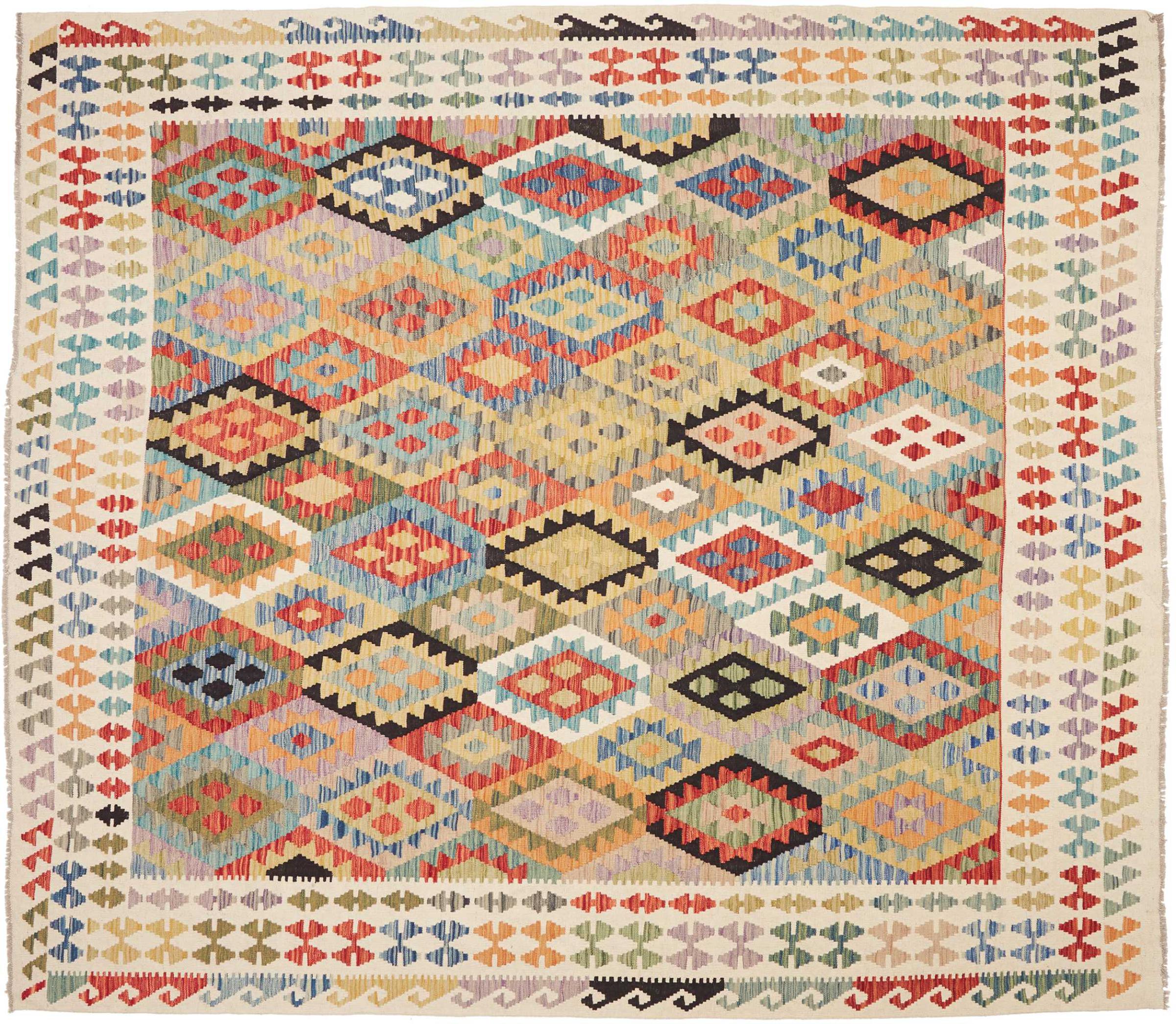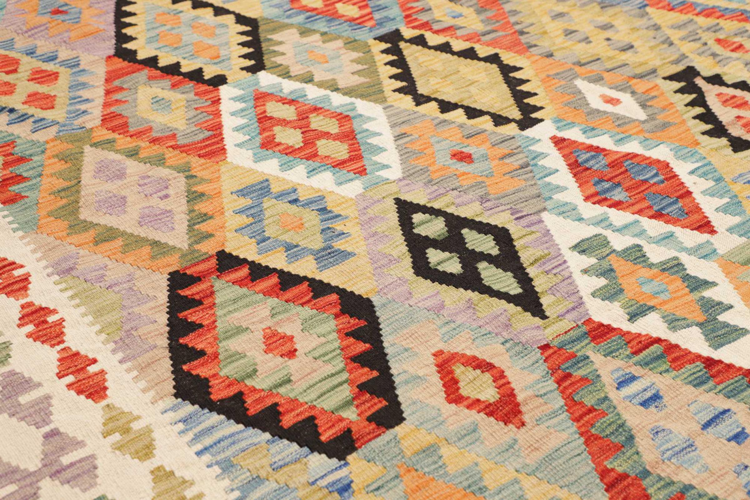 This handwoven Kilim Afghan is a wonderful and unique piece of art. Hard to believe that these modern colours and patterns have already been used centuries ago. This carpet has been woven by hand in old tradition in Afghanistan. It delivers a portion of contemporary history, which you won't find in this specific design a second time. It consists of high-grade natural wool and gives your home a personalised touch.